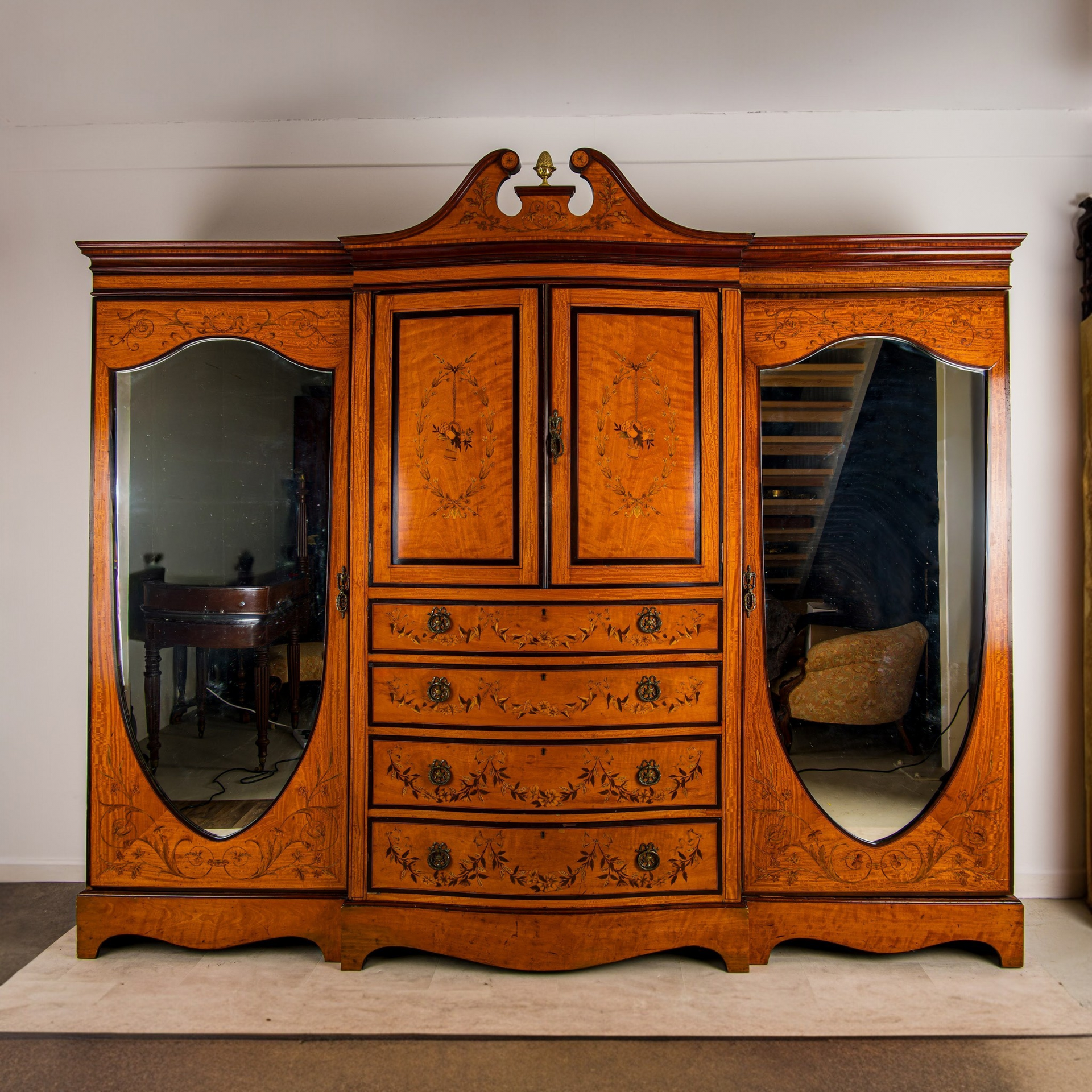 Antique Edwardian Satinwood Dressing Table Vanity with Triple Mirror & Inlaid Decoration c.1910