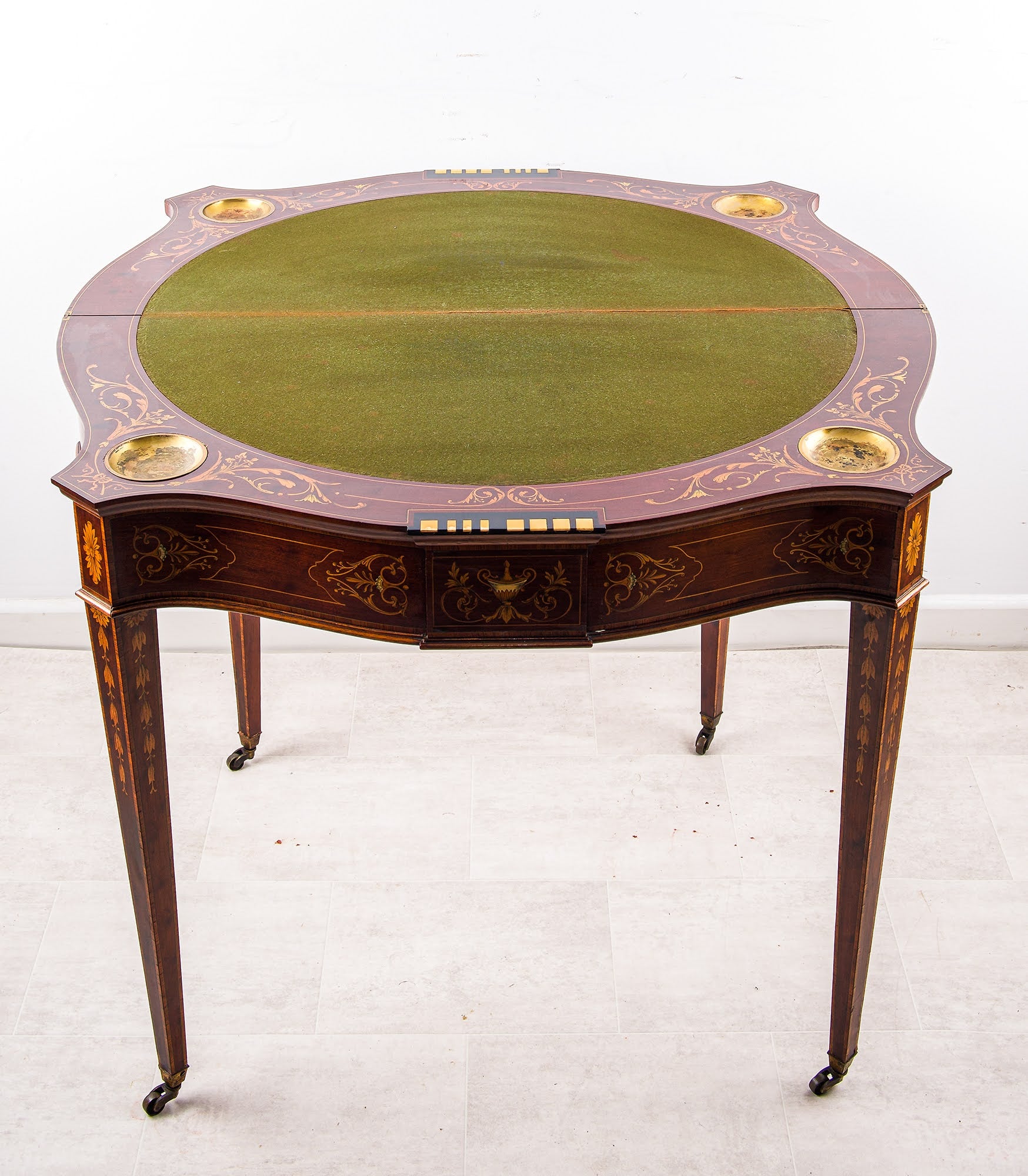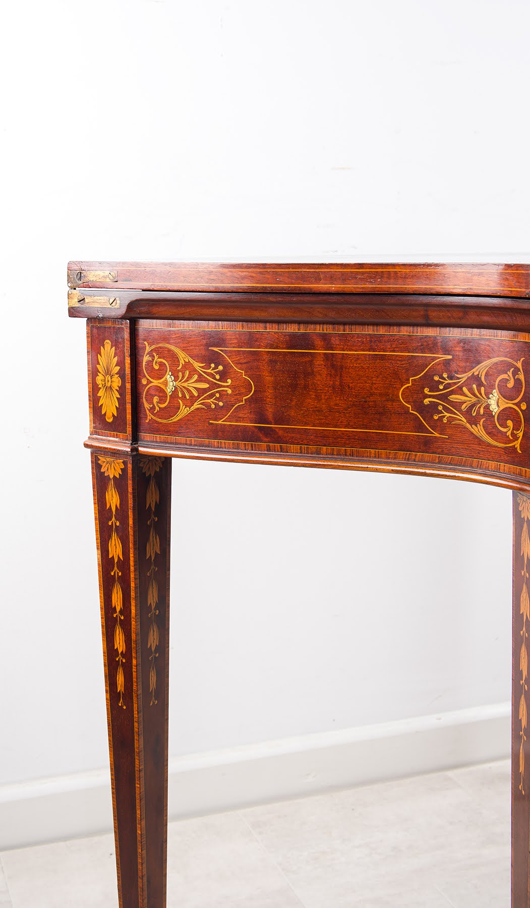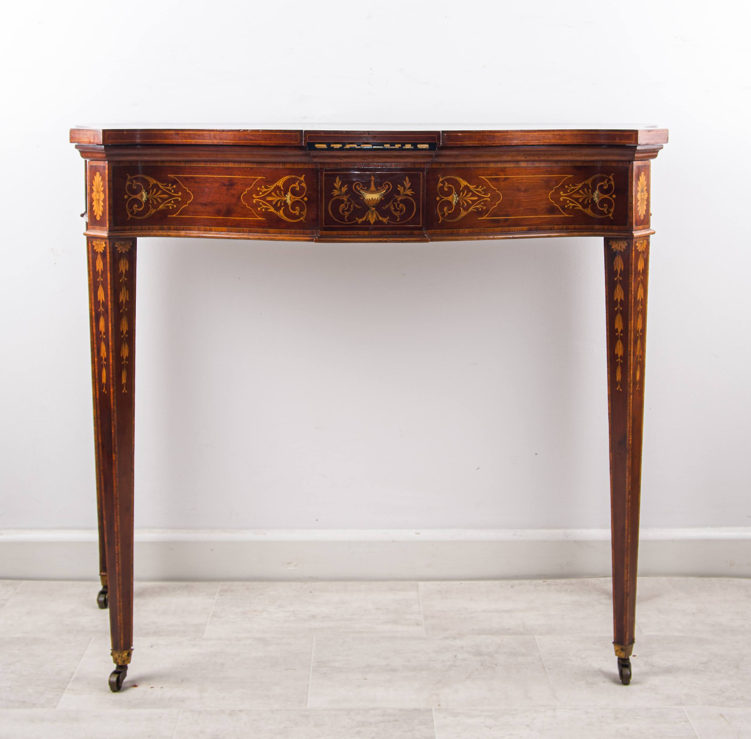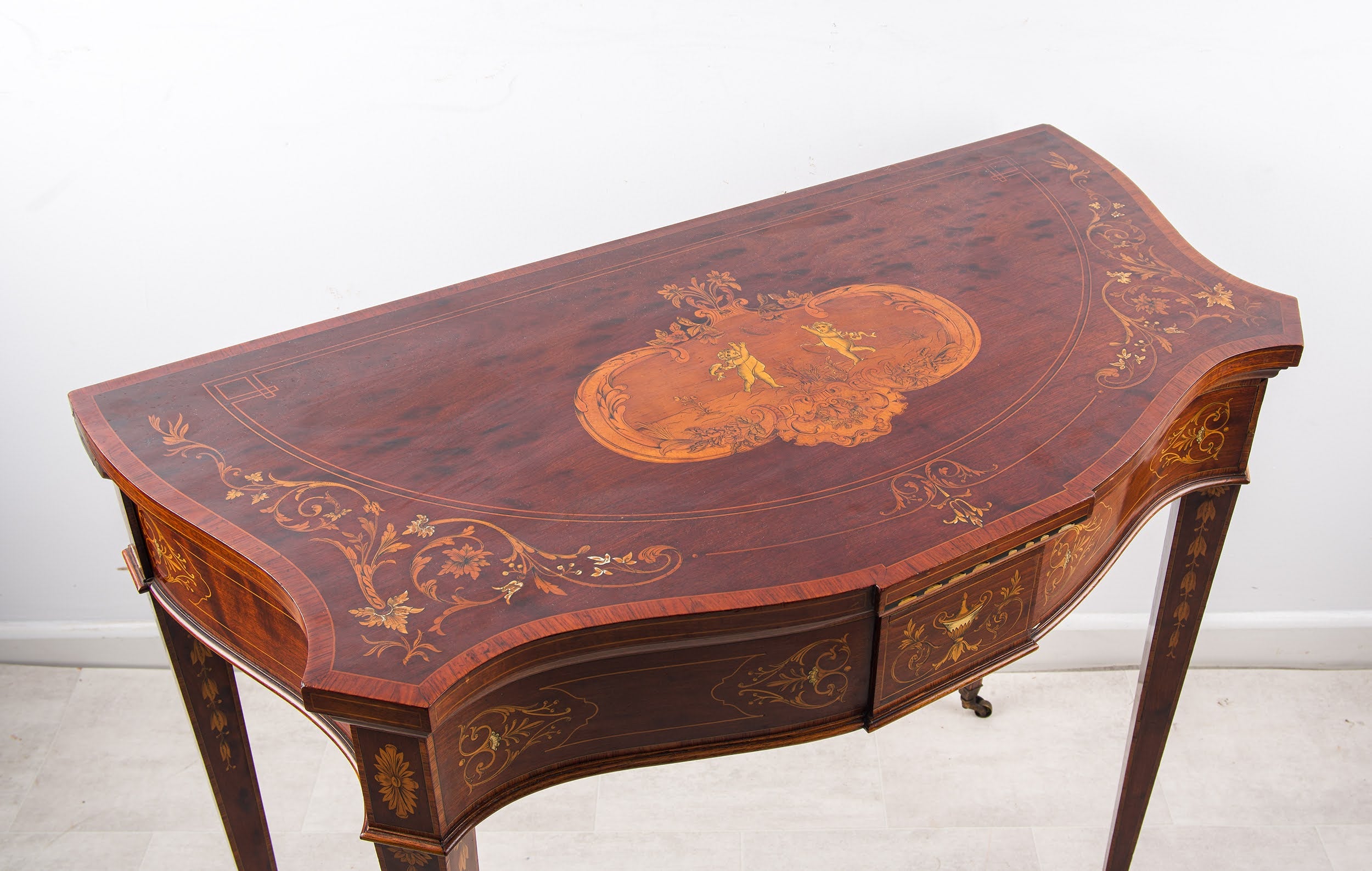 Of elegant serpentine form, the fold-over top is beautifully decorated with intricate marquetry incorporating scrolling foliate motifs and a central panel of classical putti. The richness of the mahogany is enhanced by satinwood and contrasting veneers, demonstrating the refined craftsmanship for which Edwards & Roberts were celebrated.