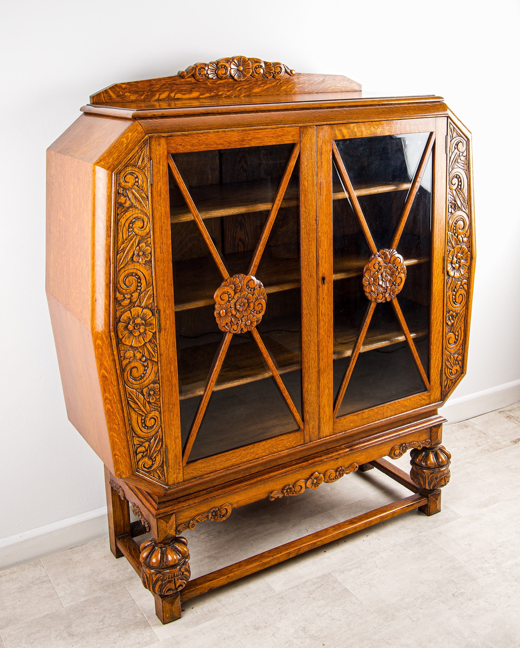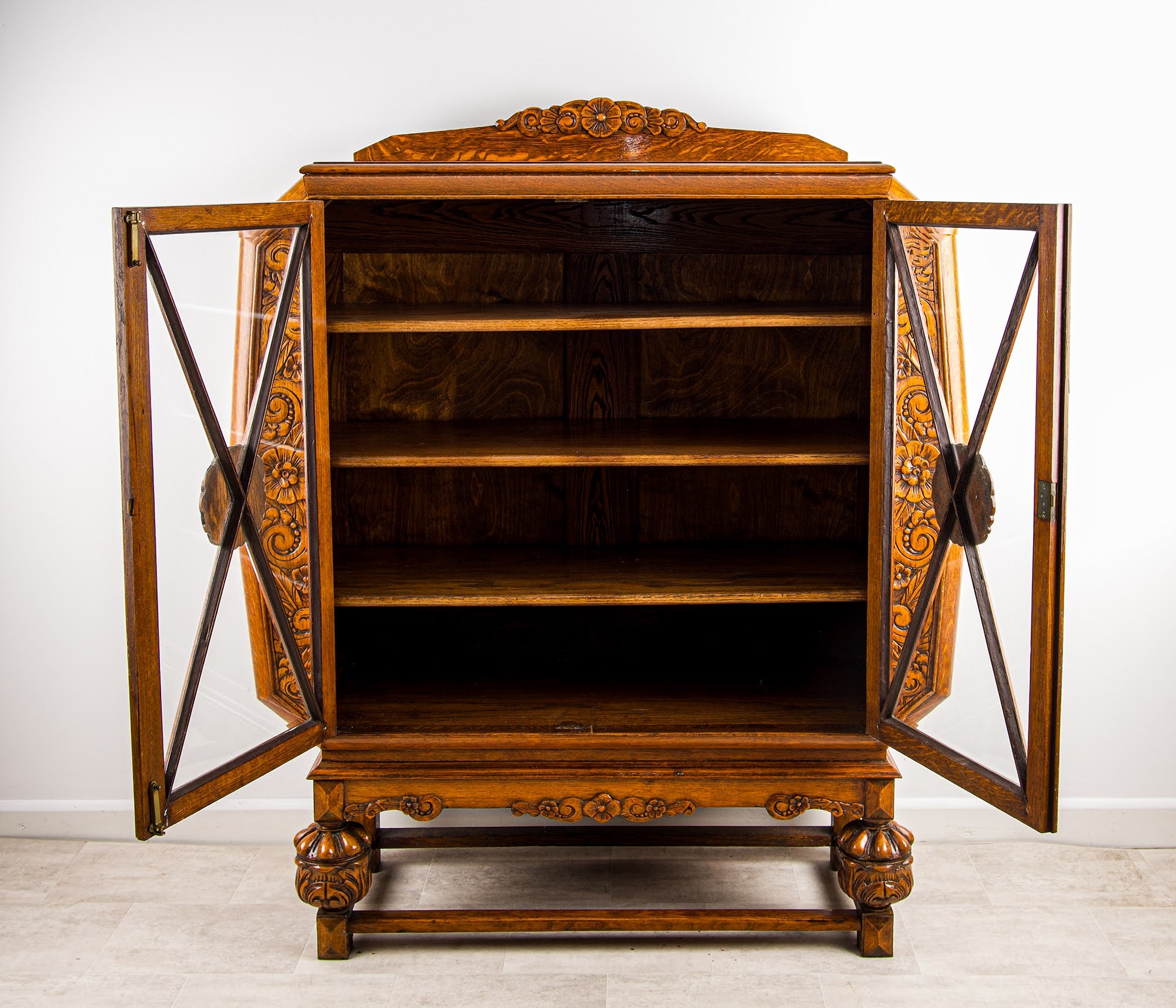 Constructed in solid oak, the cabinet features beautifully carved floral panels to the sides and frieze, complemented by distinctive leaded glazed doors with geometric crossband design and central carved roundels. The rich golden oak colour and grain enhance its warmth and character, making it a standout piece.