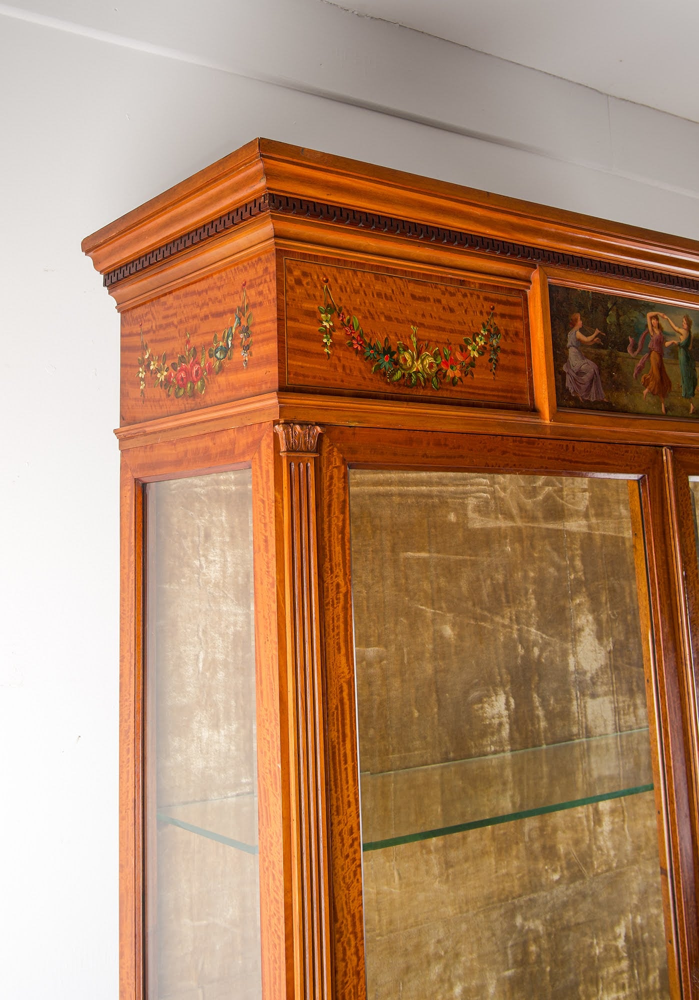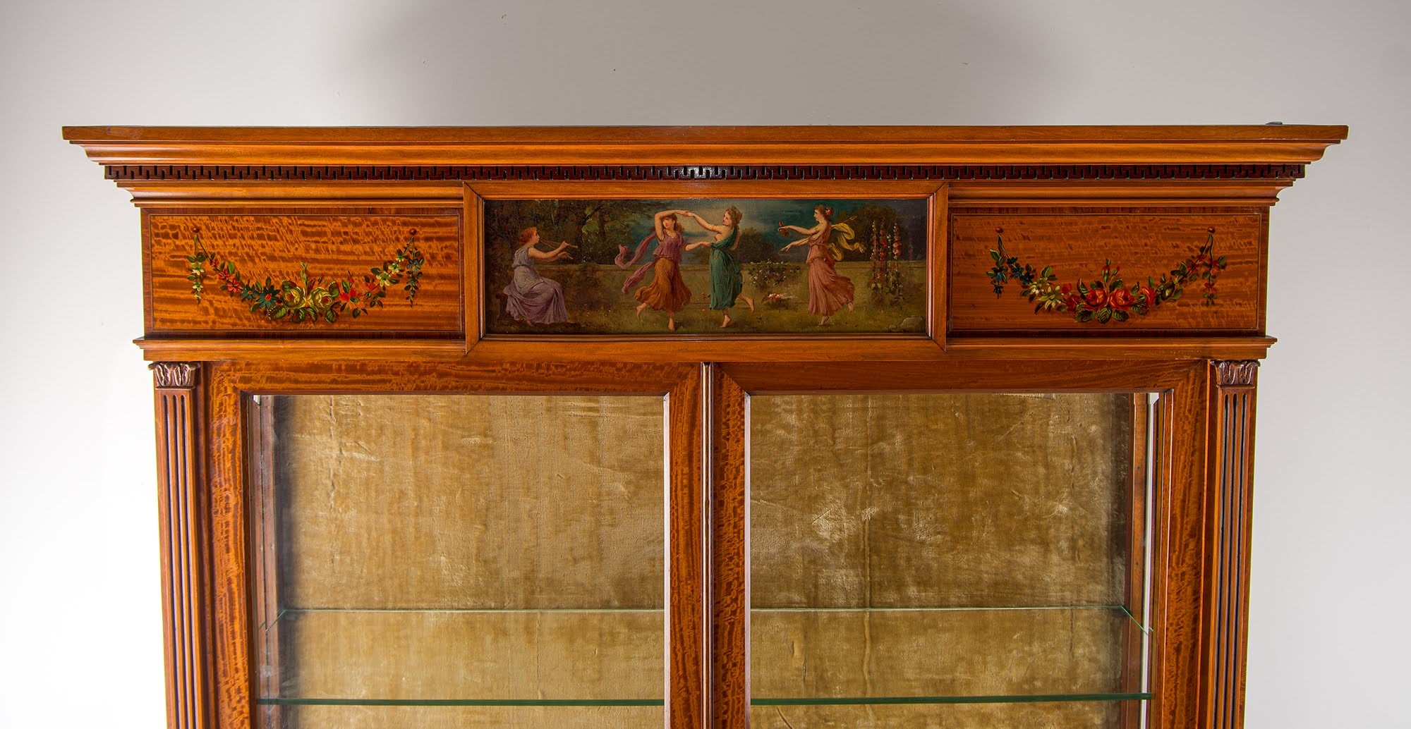 This elegant cabinet is beautifully crafted in satinwood and decorated with delicate hand-painted floral swags and classical ornament. The upper frieze features a charming painted panel depicting dancing figures, adding a distinctive decorative element typical of high-quality Edwardian satinwood furniture.