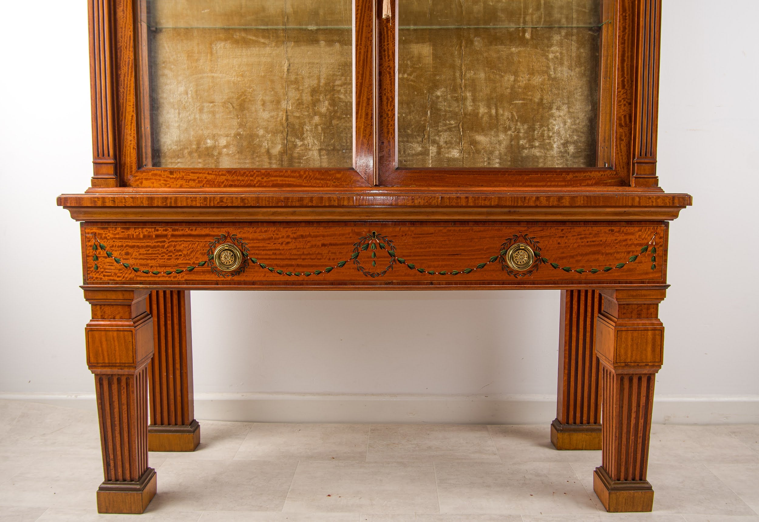The cabinet stands on a separate satinwood base with fluted supports, giving the piece both elegance and presence while maintaining the refined proportions associated with Sheraton revival furniture.
