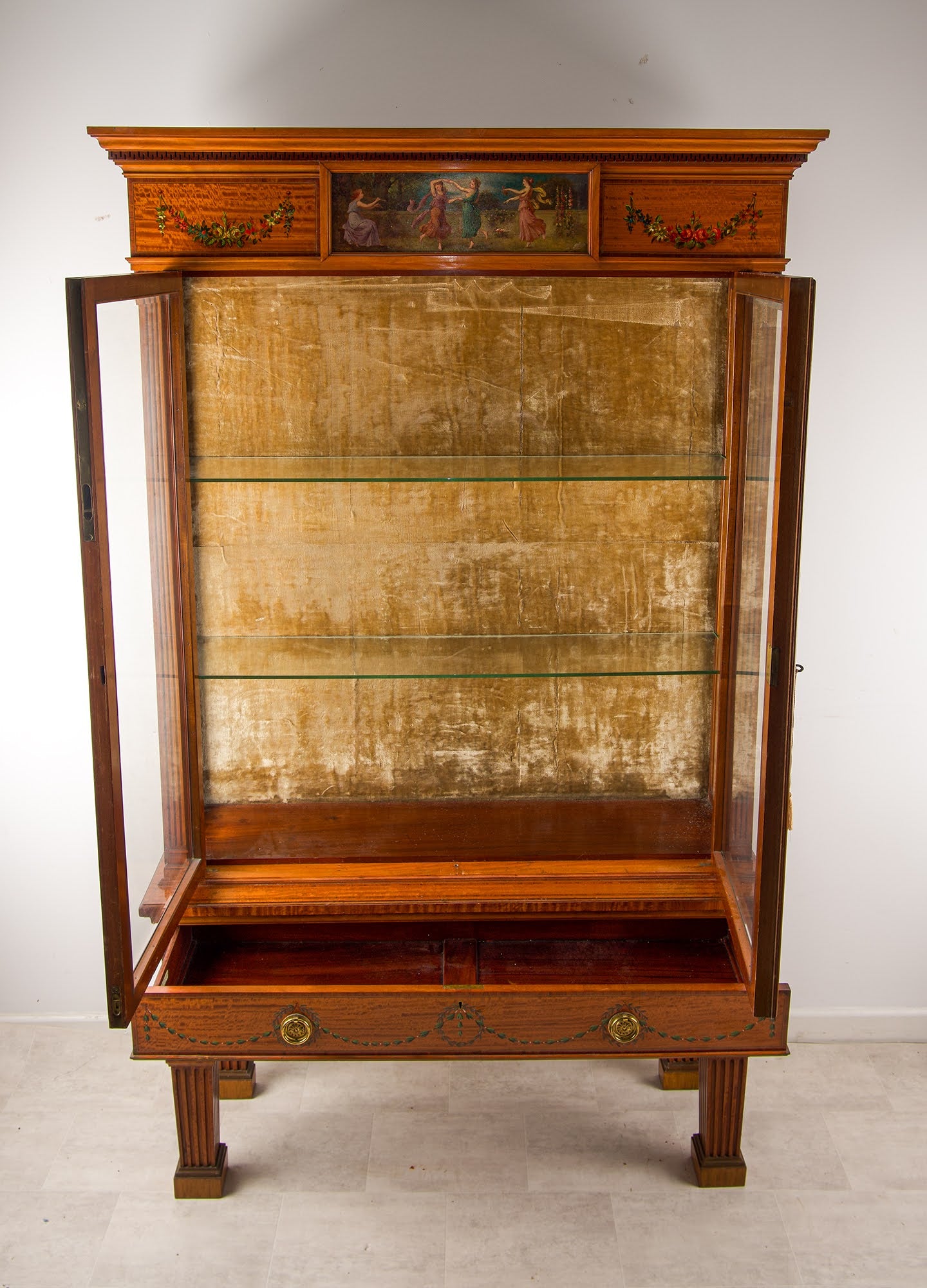 The glazed double doors open to reveal glass display shelves with a luxurious silk-lined interior, ideal for showcasing porcelain, glassware or decorative antiques. Below sits a single drawer with original brass handles and further painted decoration.