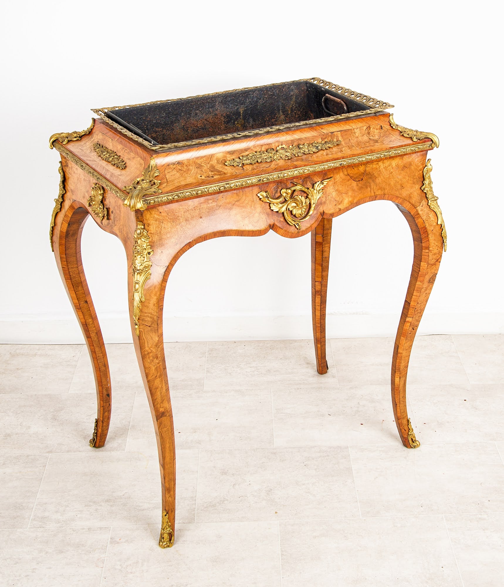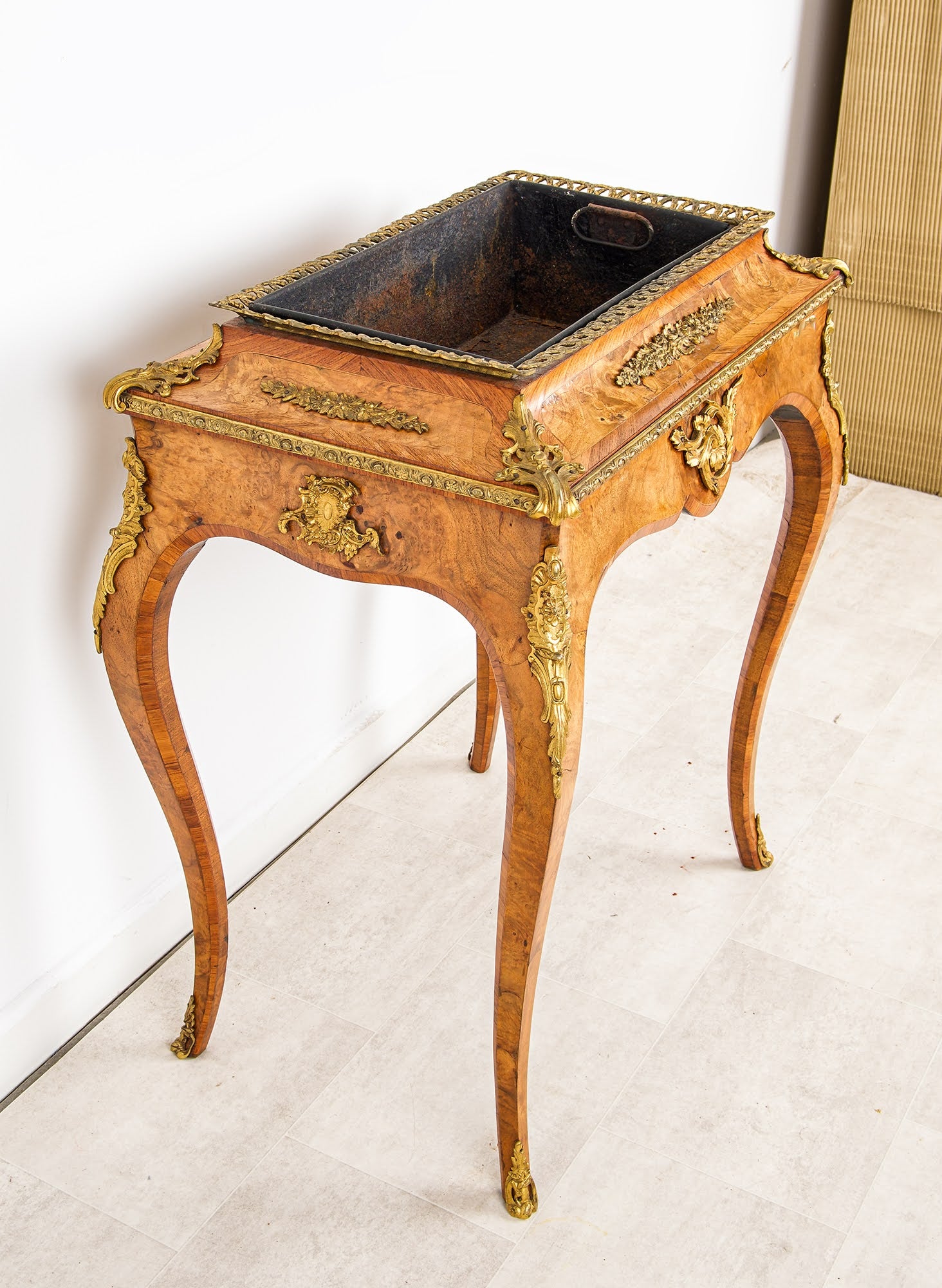 Beautifully veneered in richly figured burr walnut, this antique planter stands on graceful cabriole legs and is adorned with high-quality gilt bronze ormolu mounts, including scrolling foliate decoration and detailed corner mounts. The shaped frieze and refined proportions reflect classic French craftsmanship.