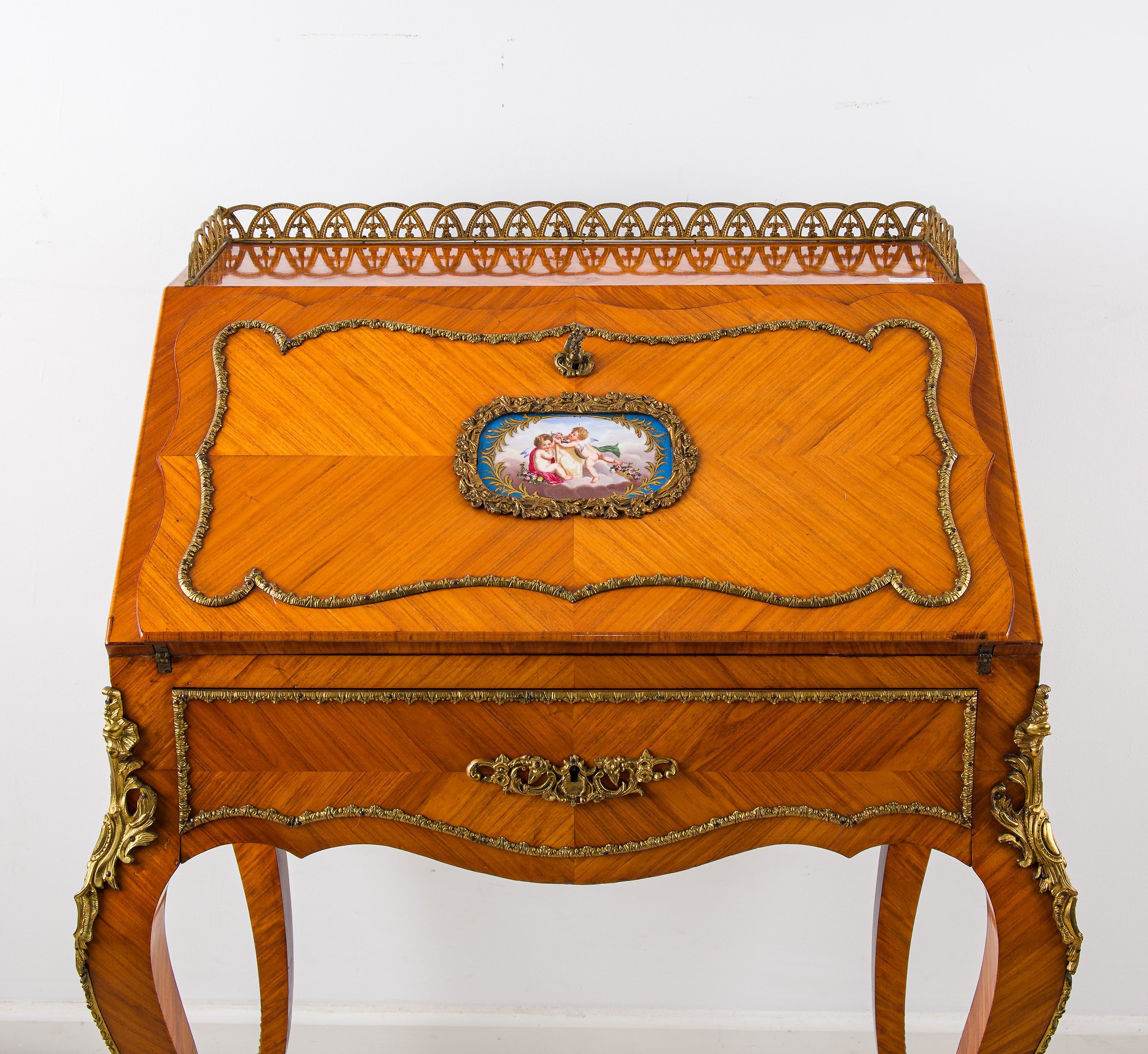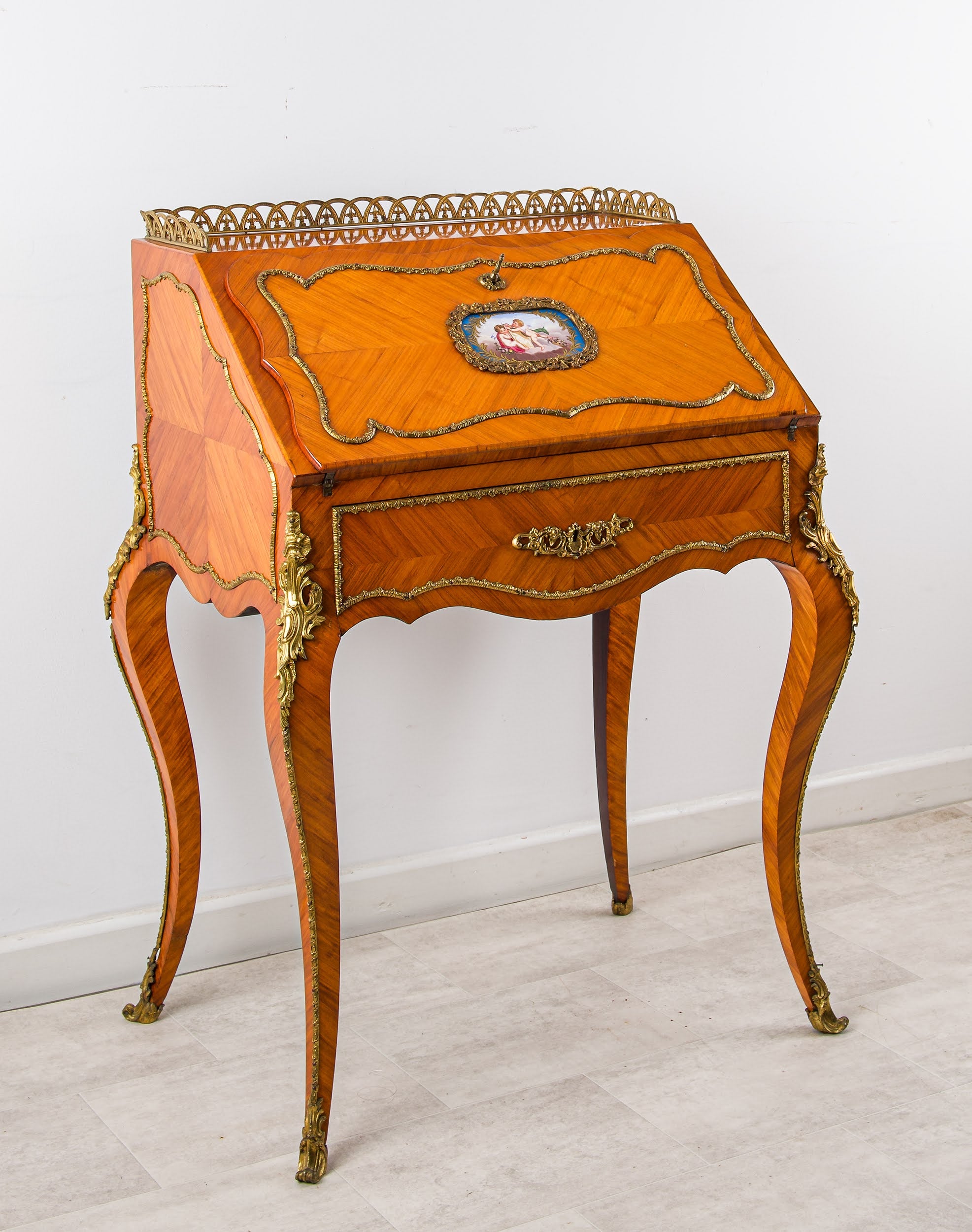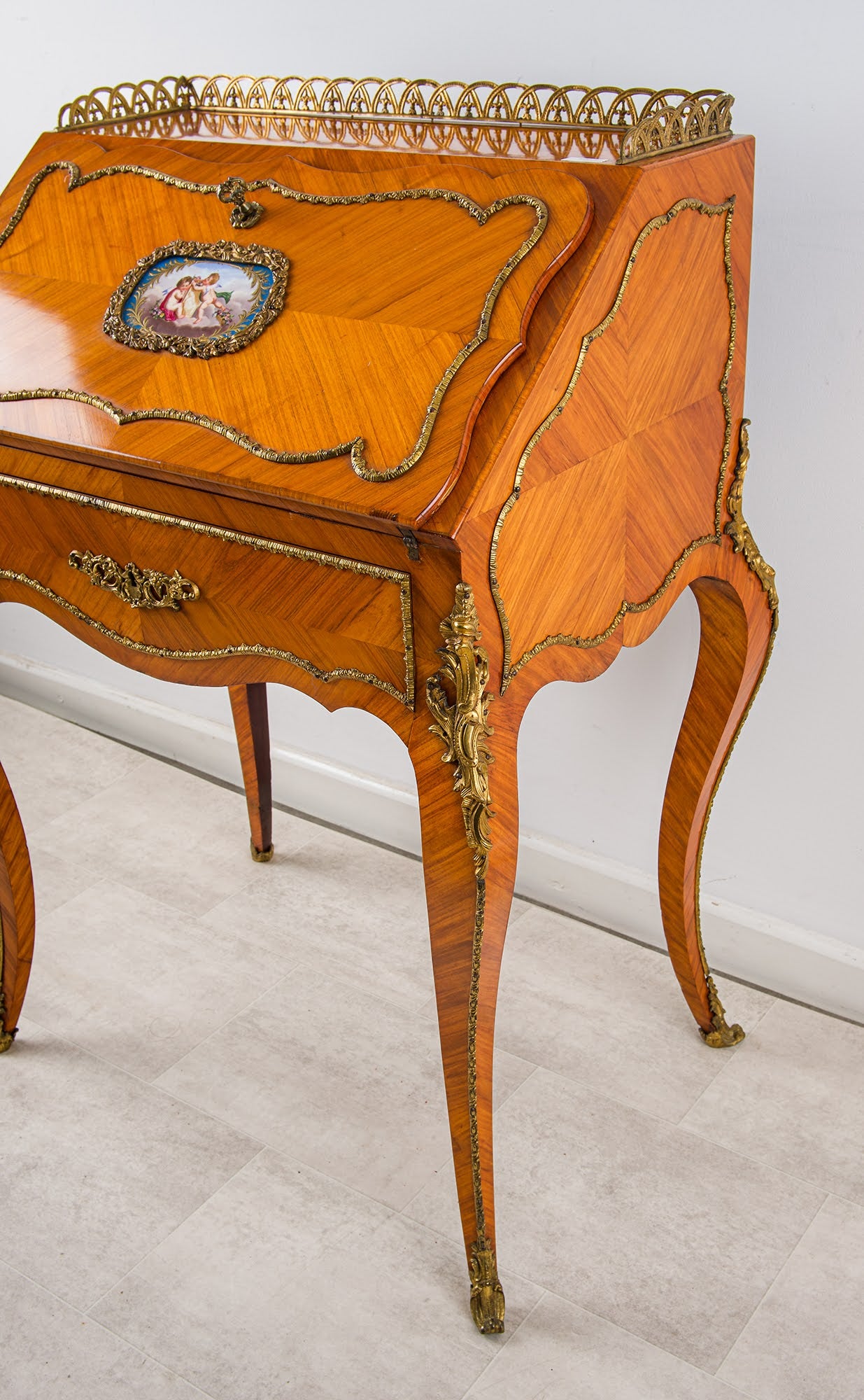 A refined Antique French kingwood bureau de dame, dating from circa 1890, beautifully crafted and richly adorned with finely cast gilt bronze (ormolu) mounts and an elegant hand-painted porcelain plaque depicting cherubs, set within an ornate ormolu frame.