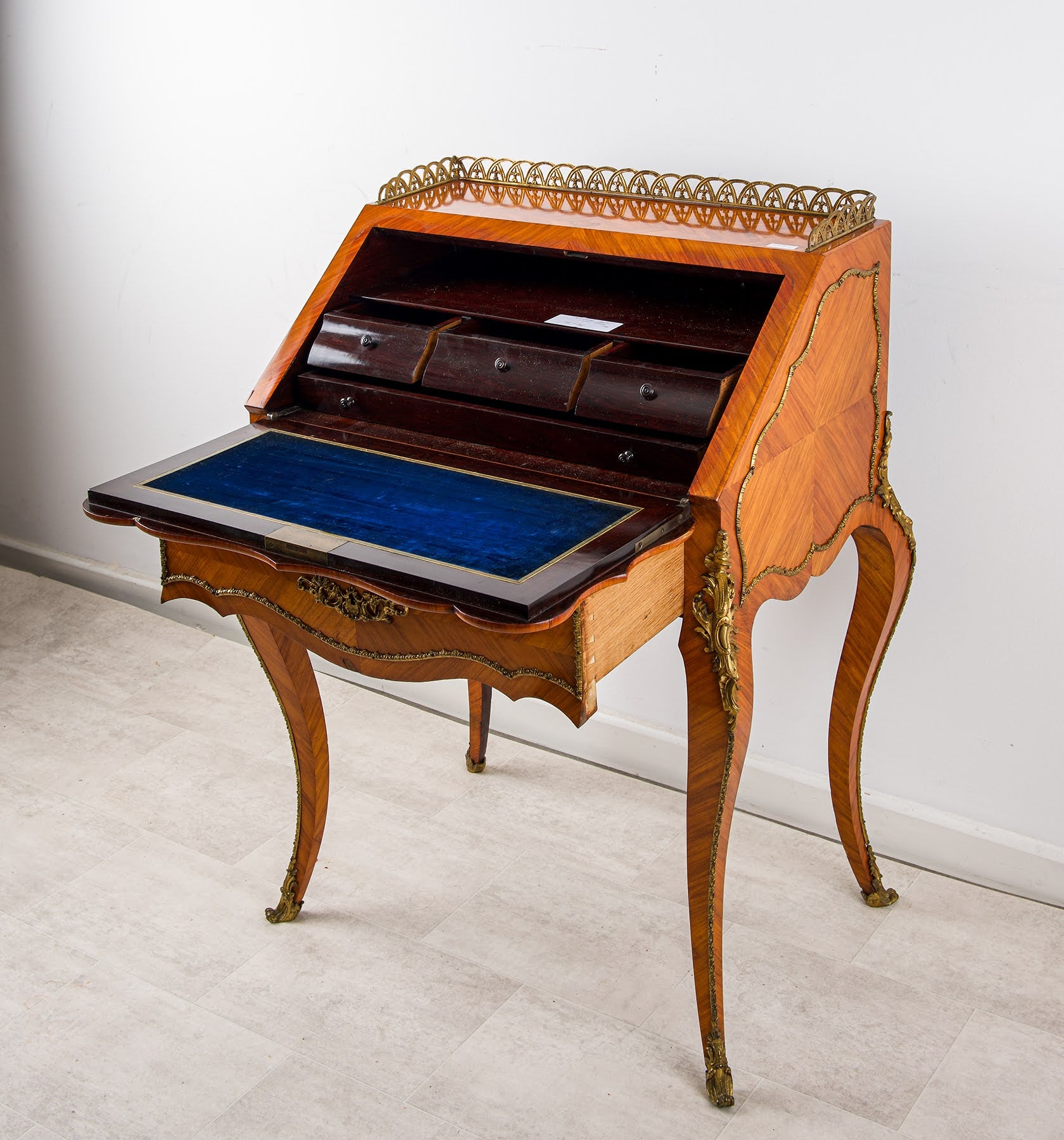 Raised on graceful cabriole legs with ormolu mounts and sabots, the bureau is further enhanced by its pierced brass gallery to the top, adding architectural presence and refinement.