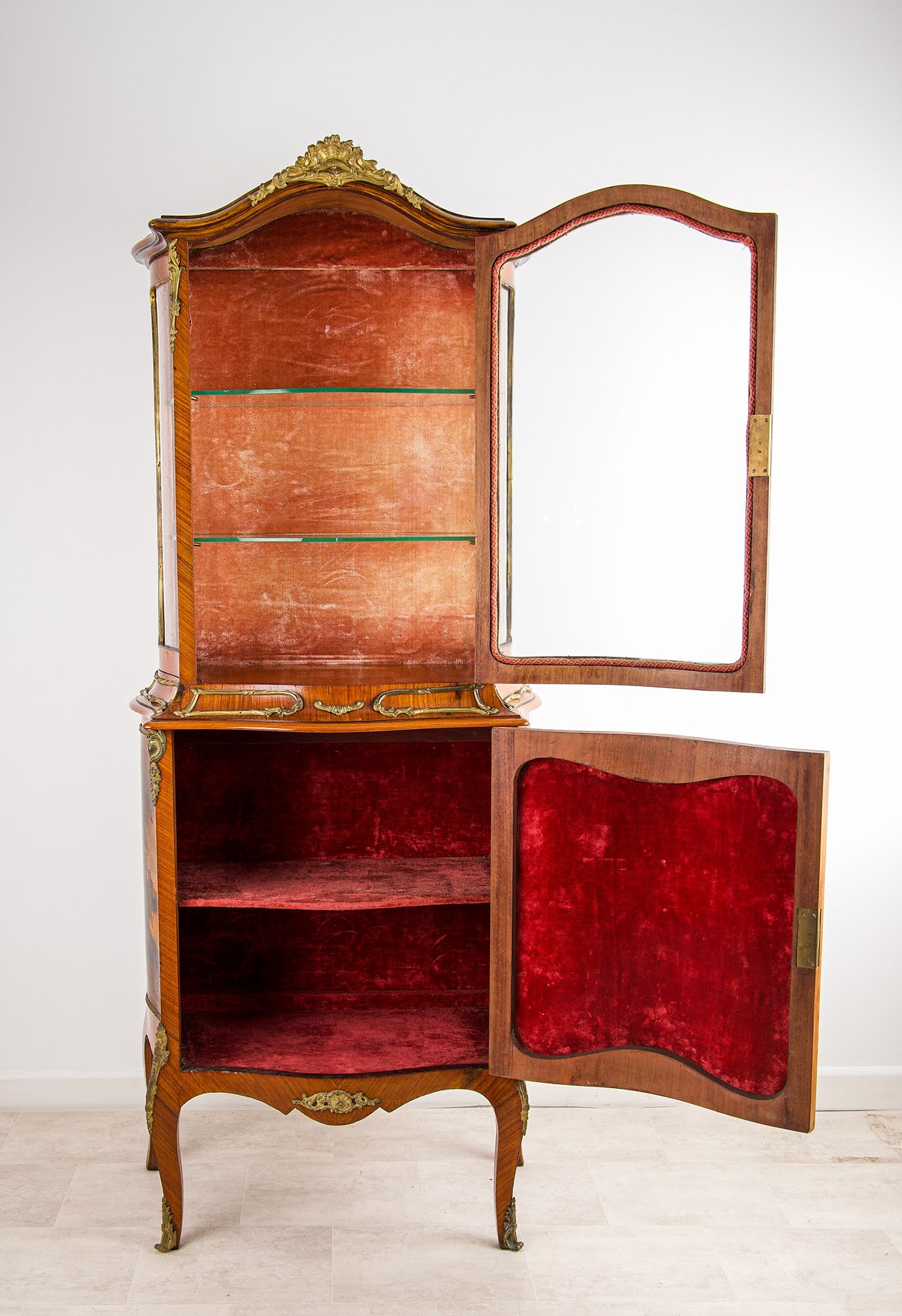 Raised on graceful cabriole legs with ormolu mounts and sabots, the cabinet reflects the elegance of Louis XV style French furniture.