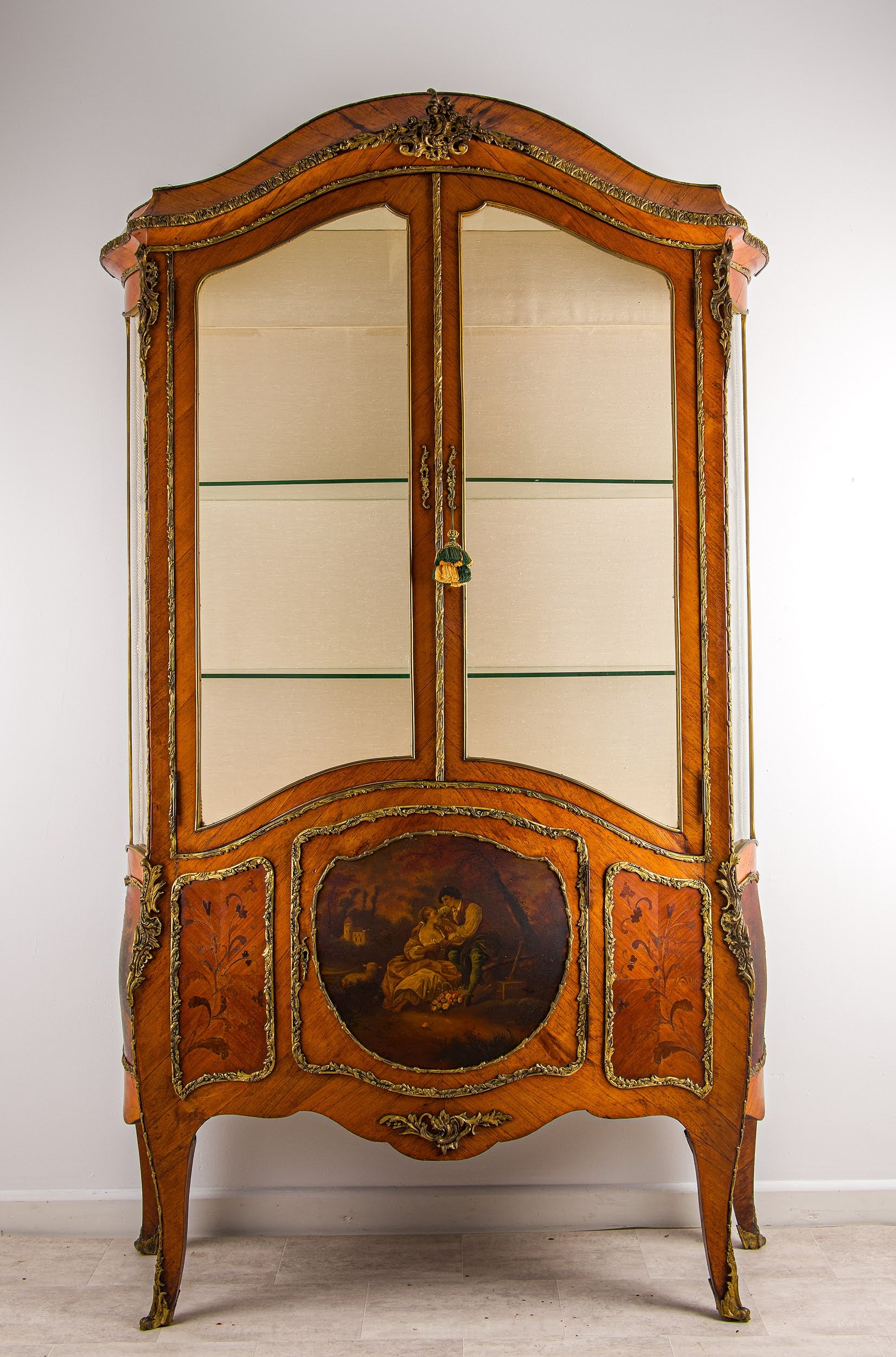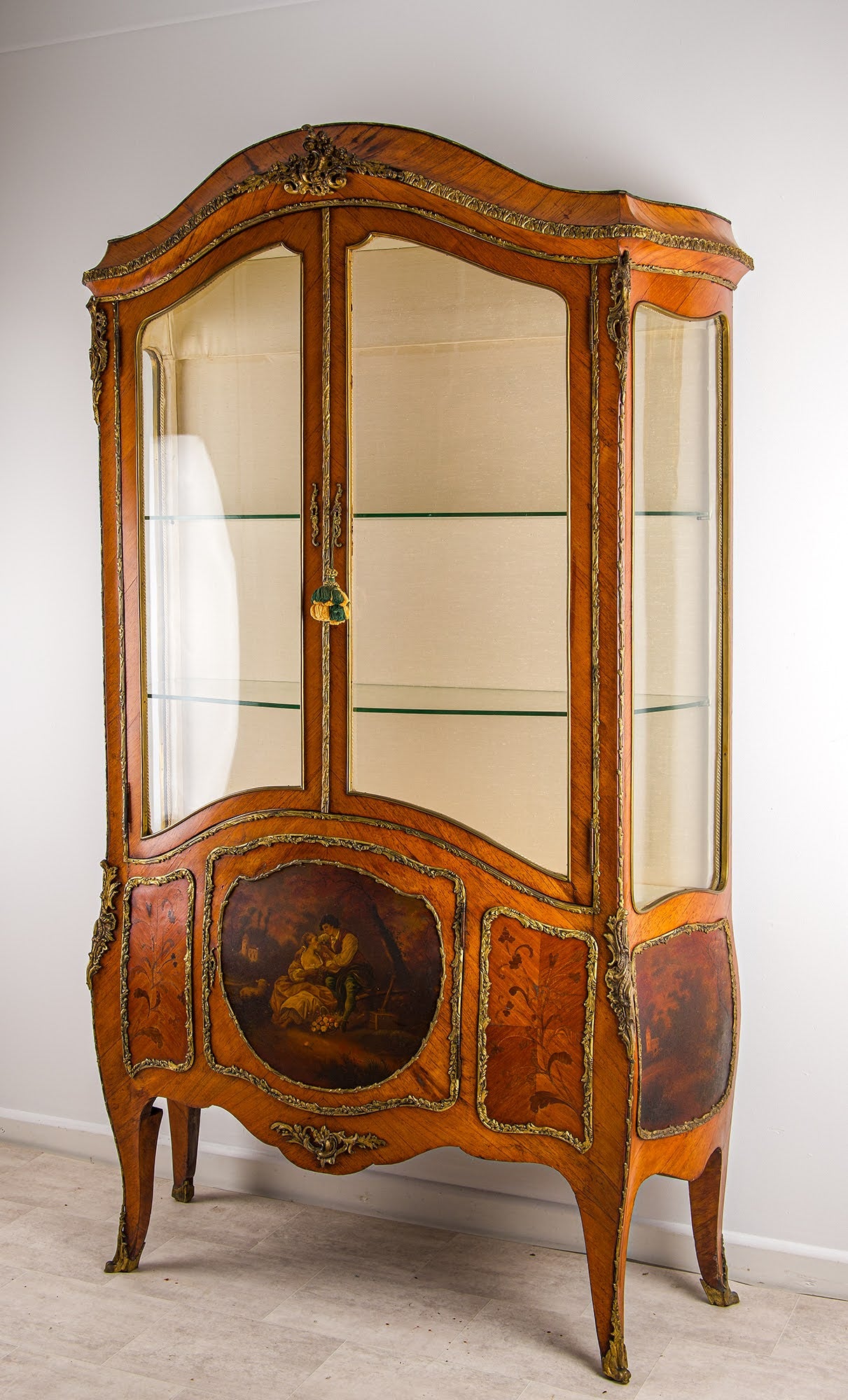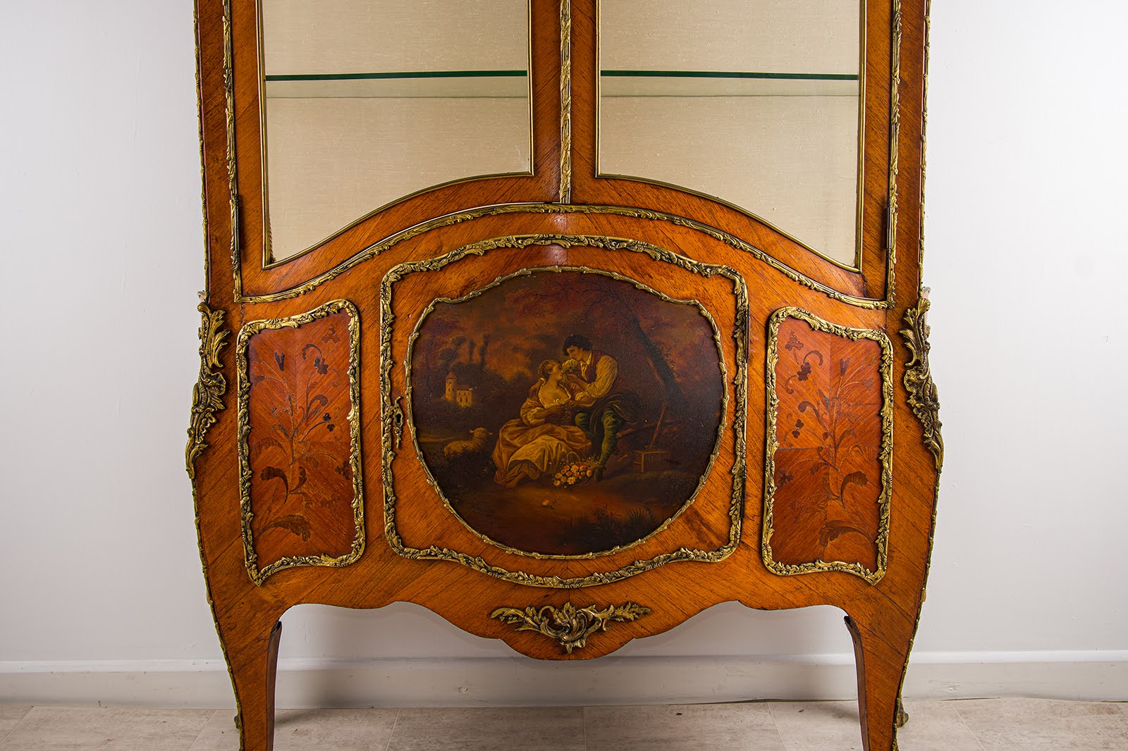 The upper section features glazed doors and sides with glass shelving, ideal for displaying antiques, collectibles, or decorative objects. The lower section is centred with a striking hand-painted Vernis Martin panel depicting a romantic pastoral scene, complemented by additional decorative panels to the sides.