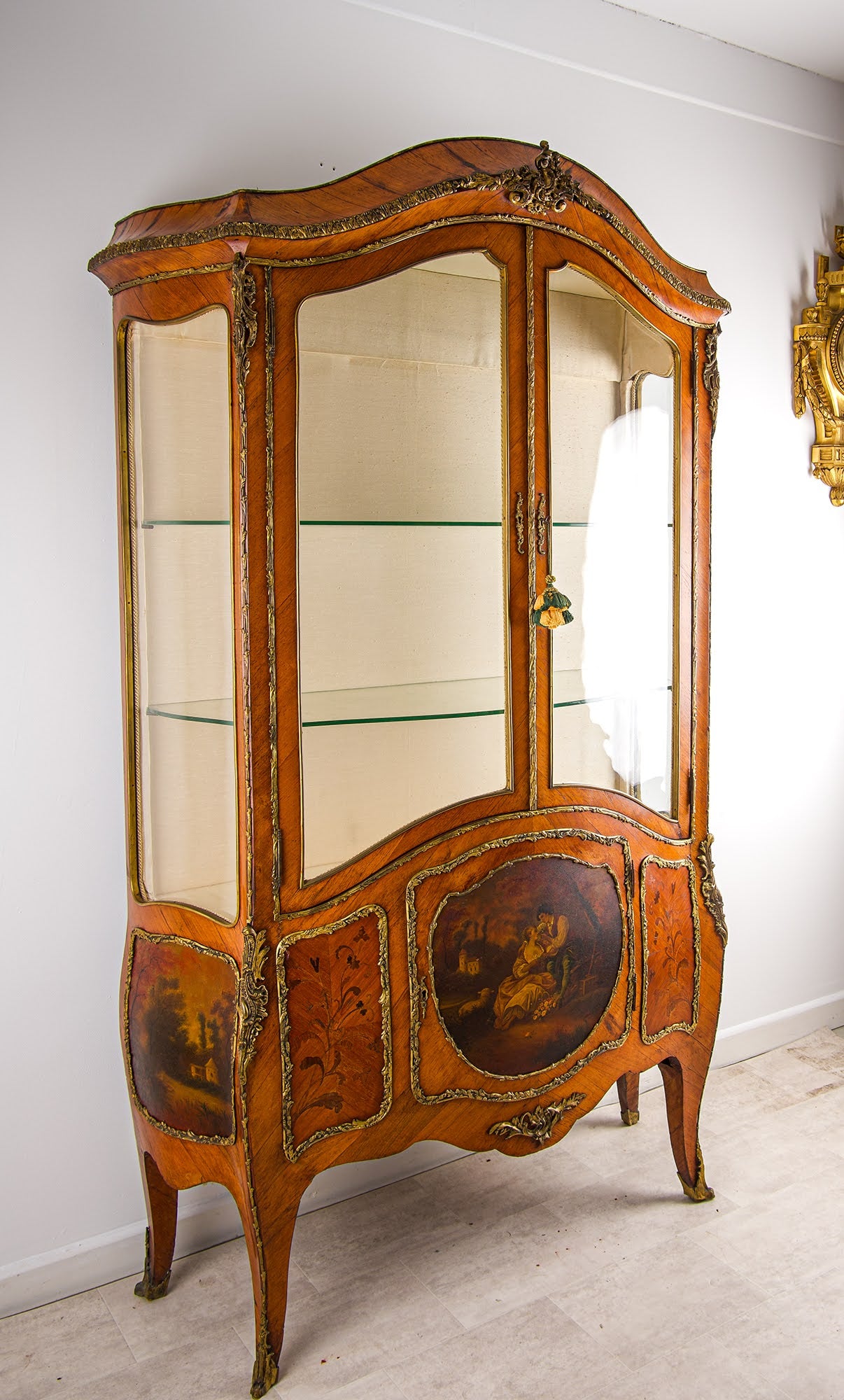 Condition Note: This vitrine presents in good antique condition consistent with its age and quality. The kingwood veneers are sound overall with the natural patination of a well-kept 19th-century piece. The Vernis Martin painting is intact with warm, rich tones; as with all antique painted panels there is some age-related crazing and darkening of the varnish which contributes to the period character of the piece.