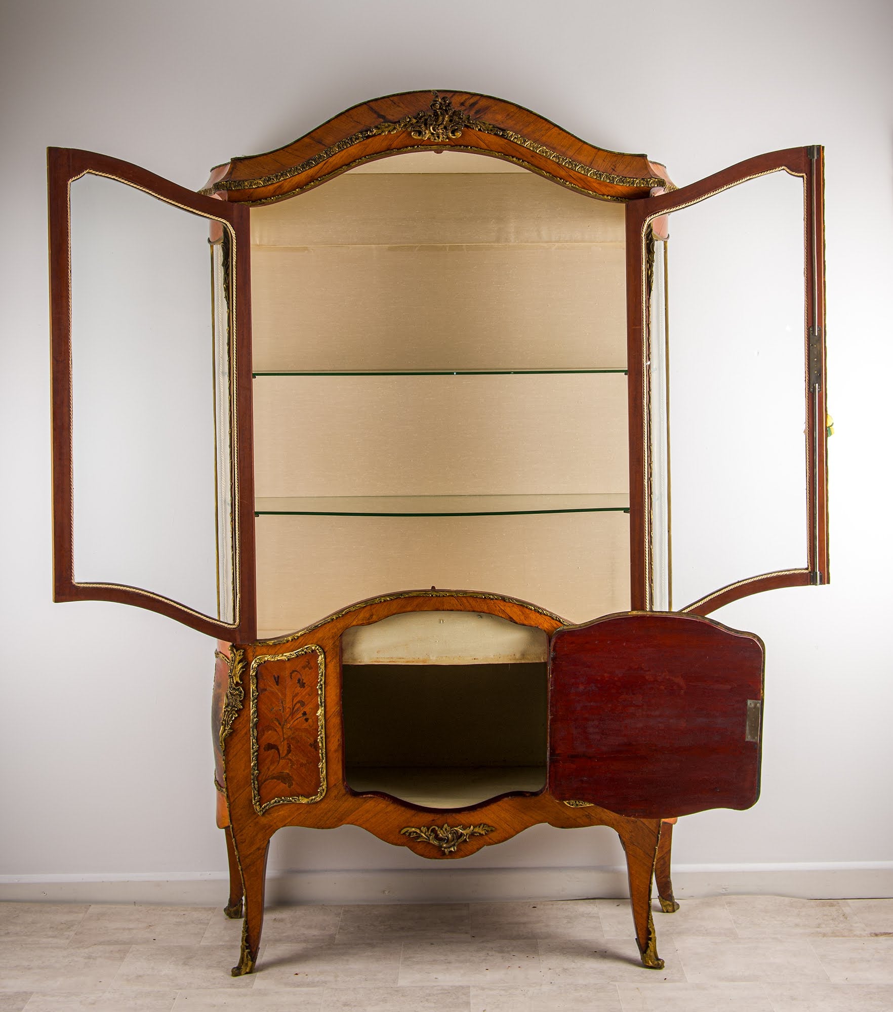 A highly decorative and practical antique French display cabinet, appealing to collectors, interior designers, and those seeking a standout period piece.