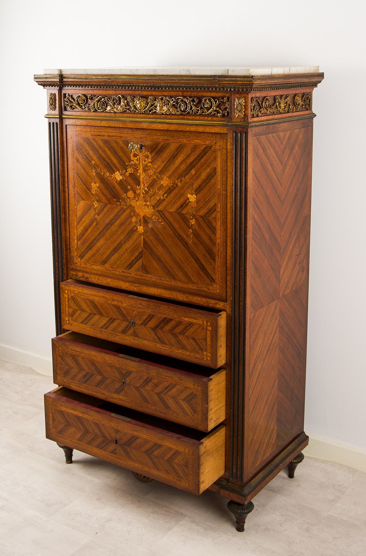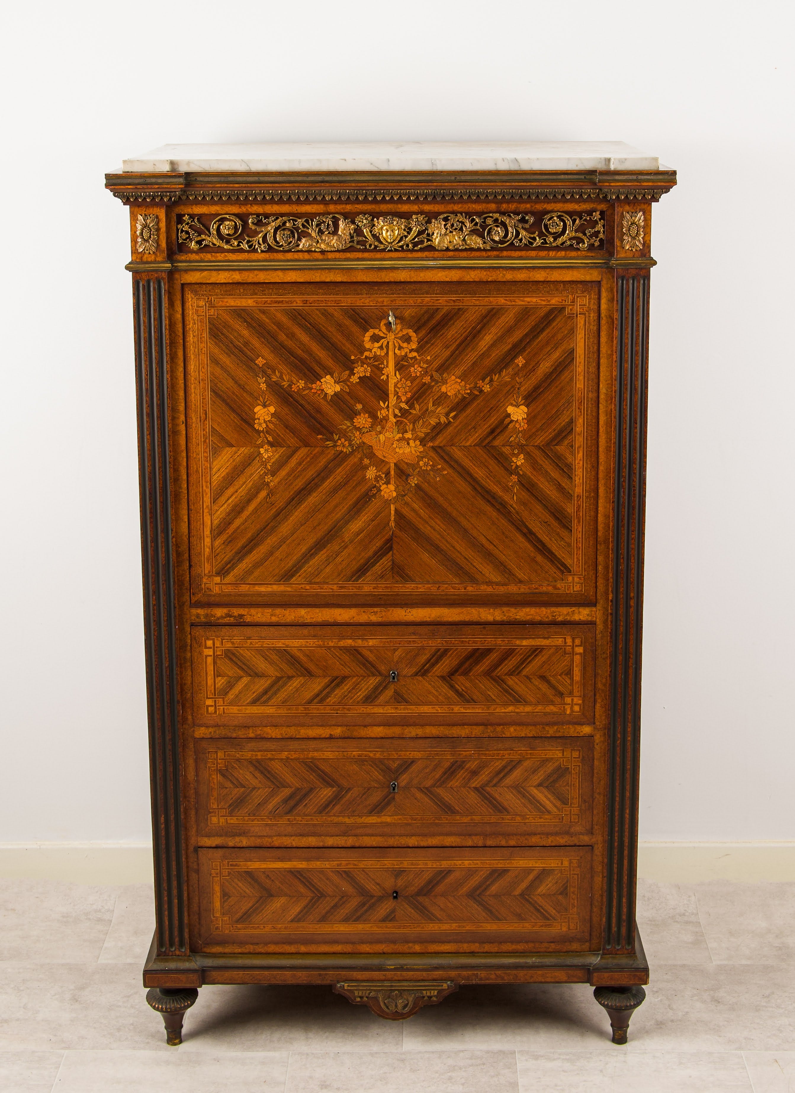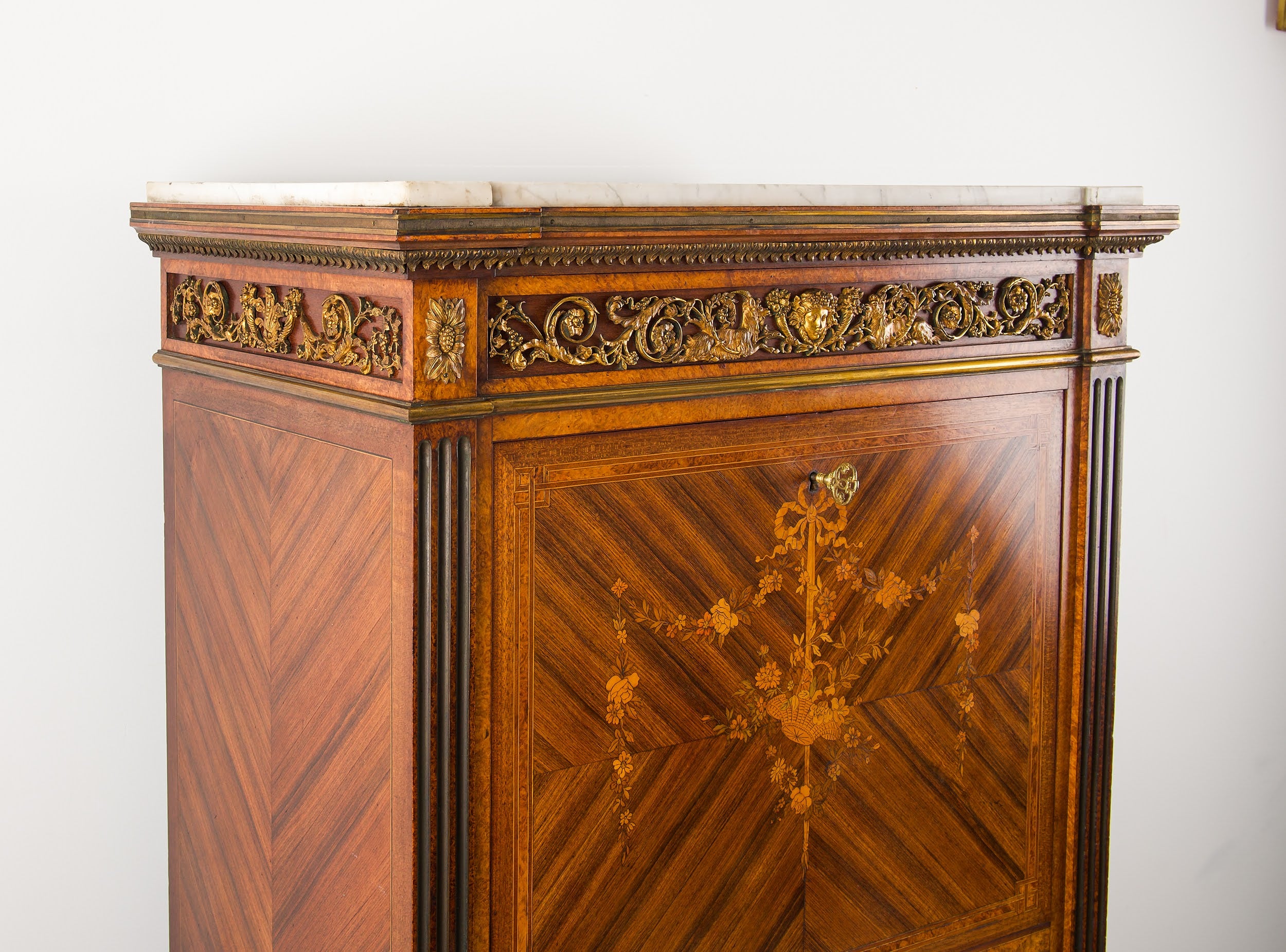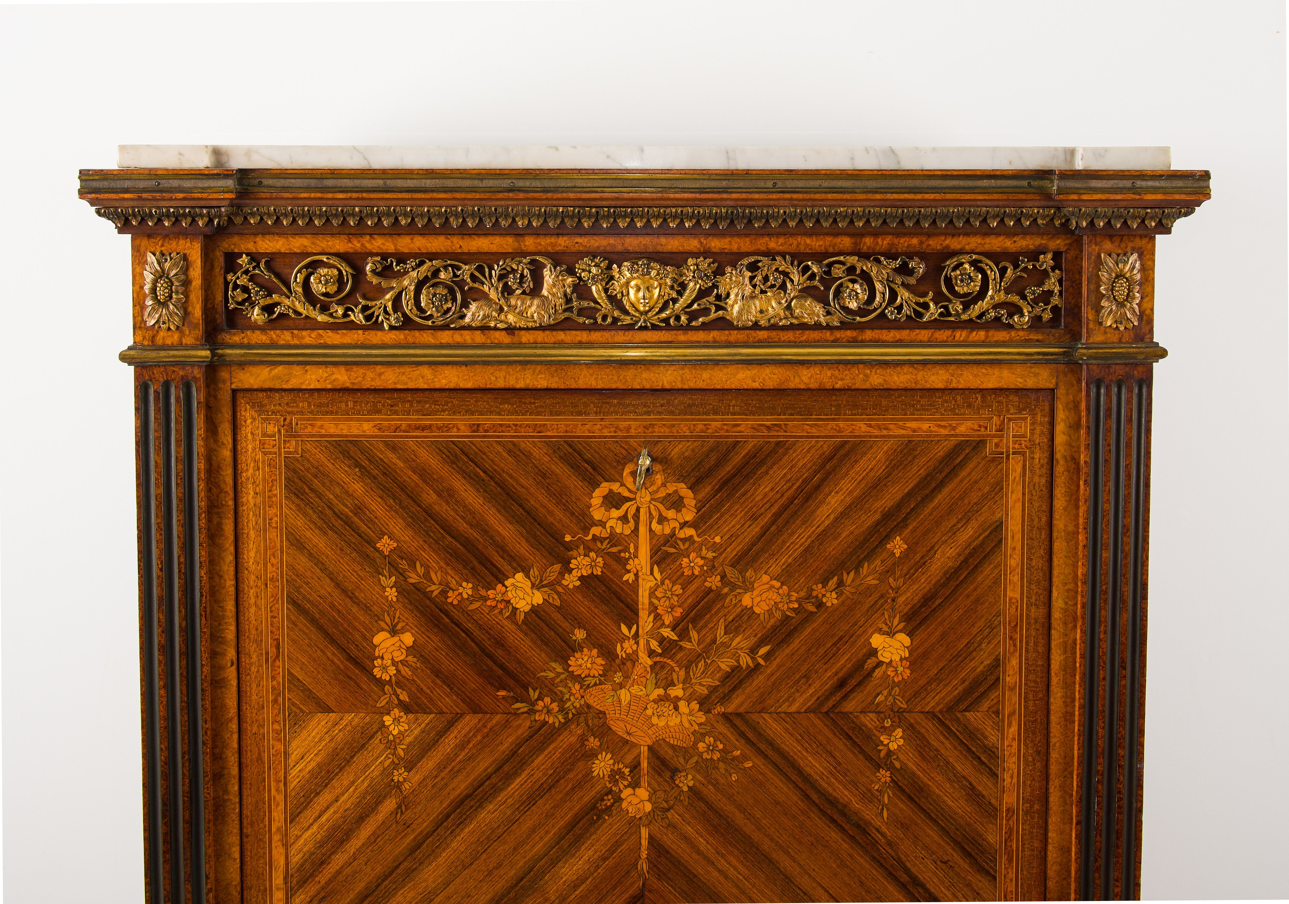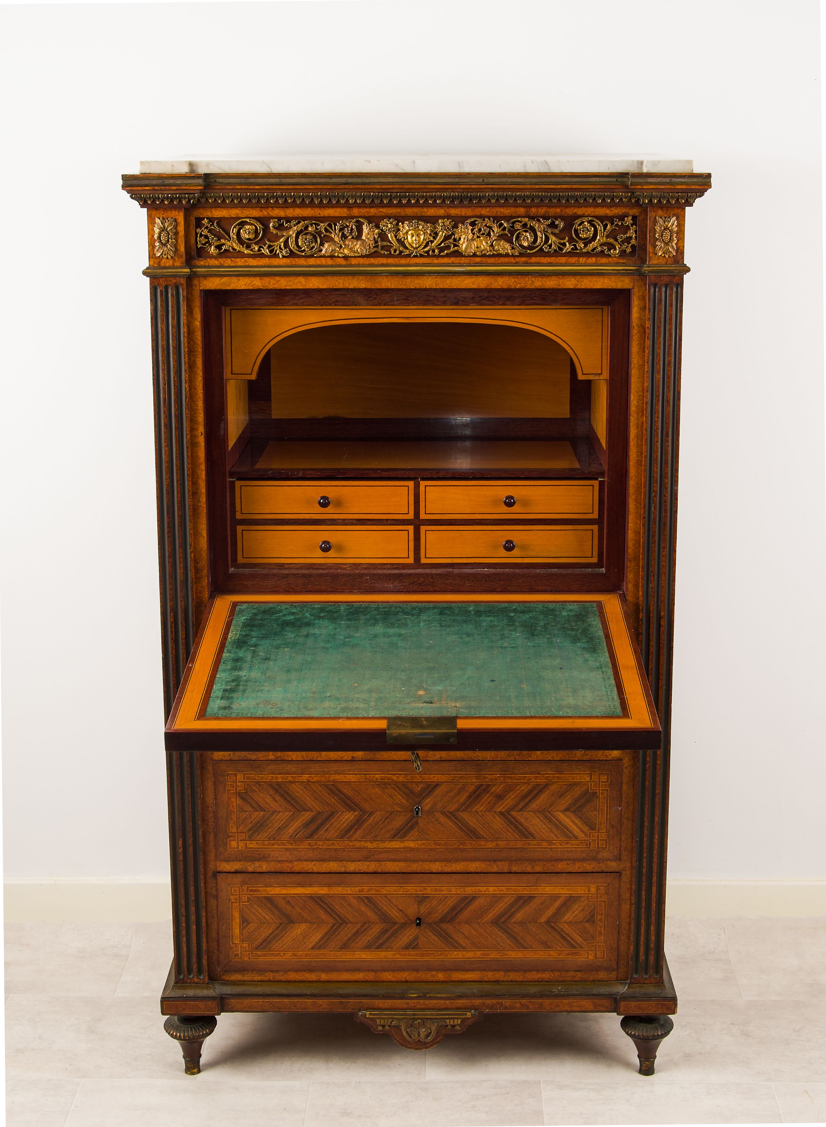 The secrétaire is flanked by fluted pilasters and surmounted by a white marble top, above an ornate gilt-bronze frieze decorated with scrolling foliage and classical masks. Raised on turned feet, the proportions are well balanced and imposing without being overpowering.