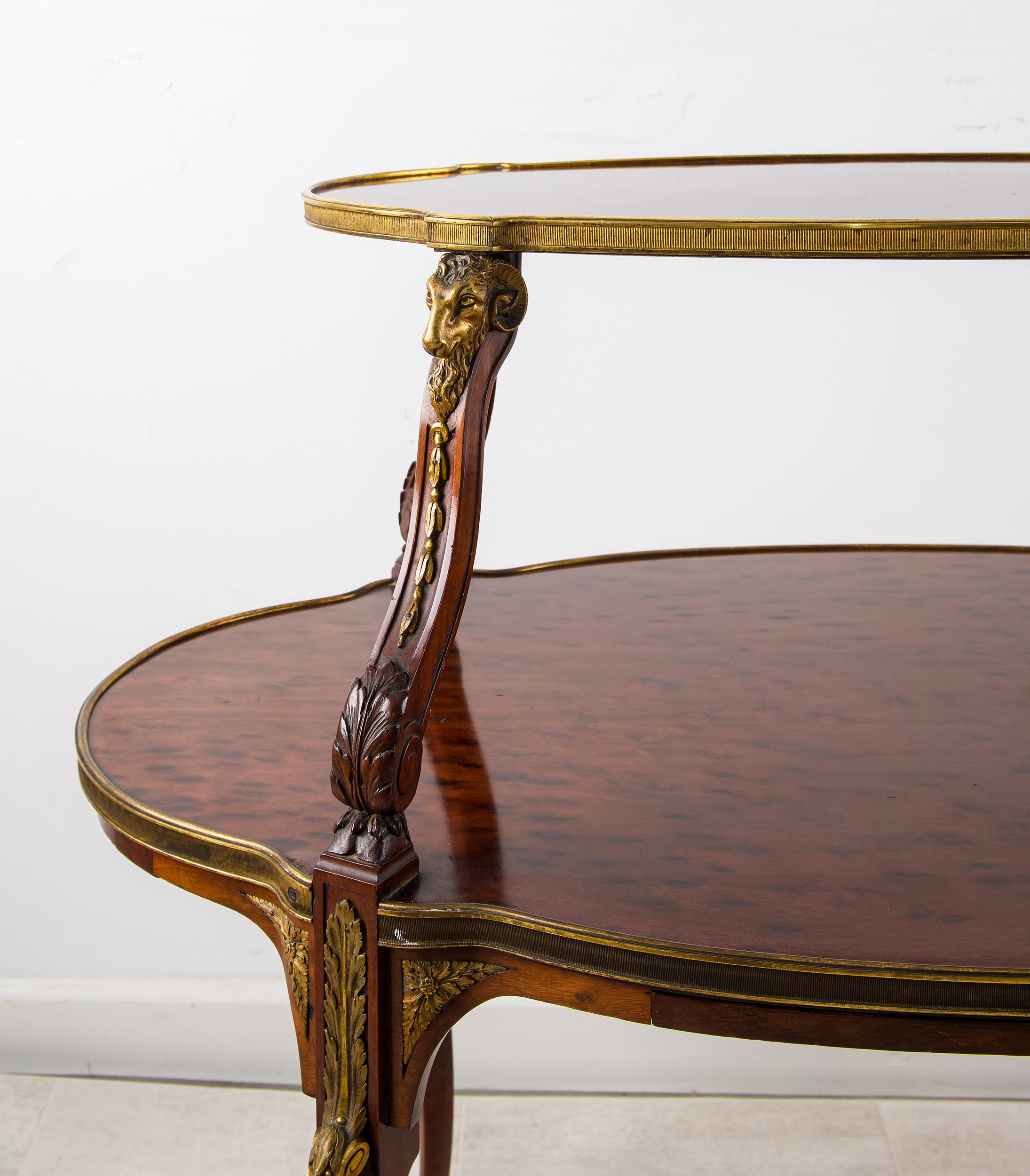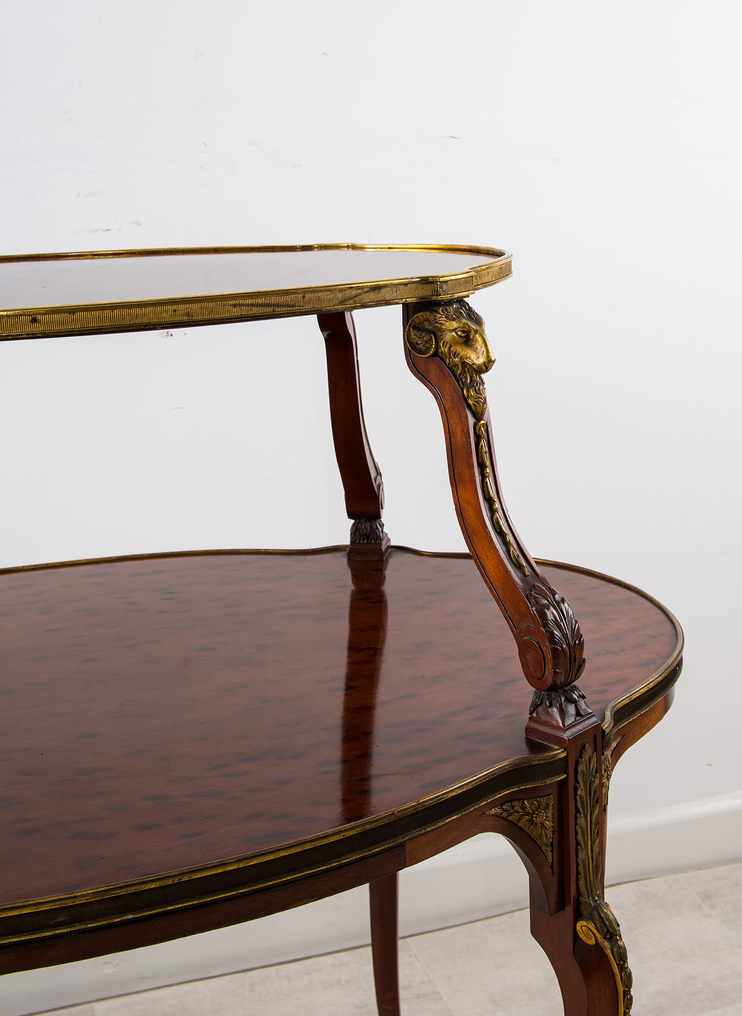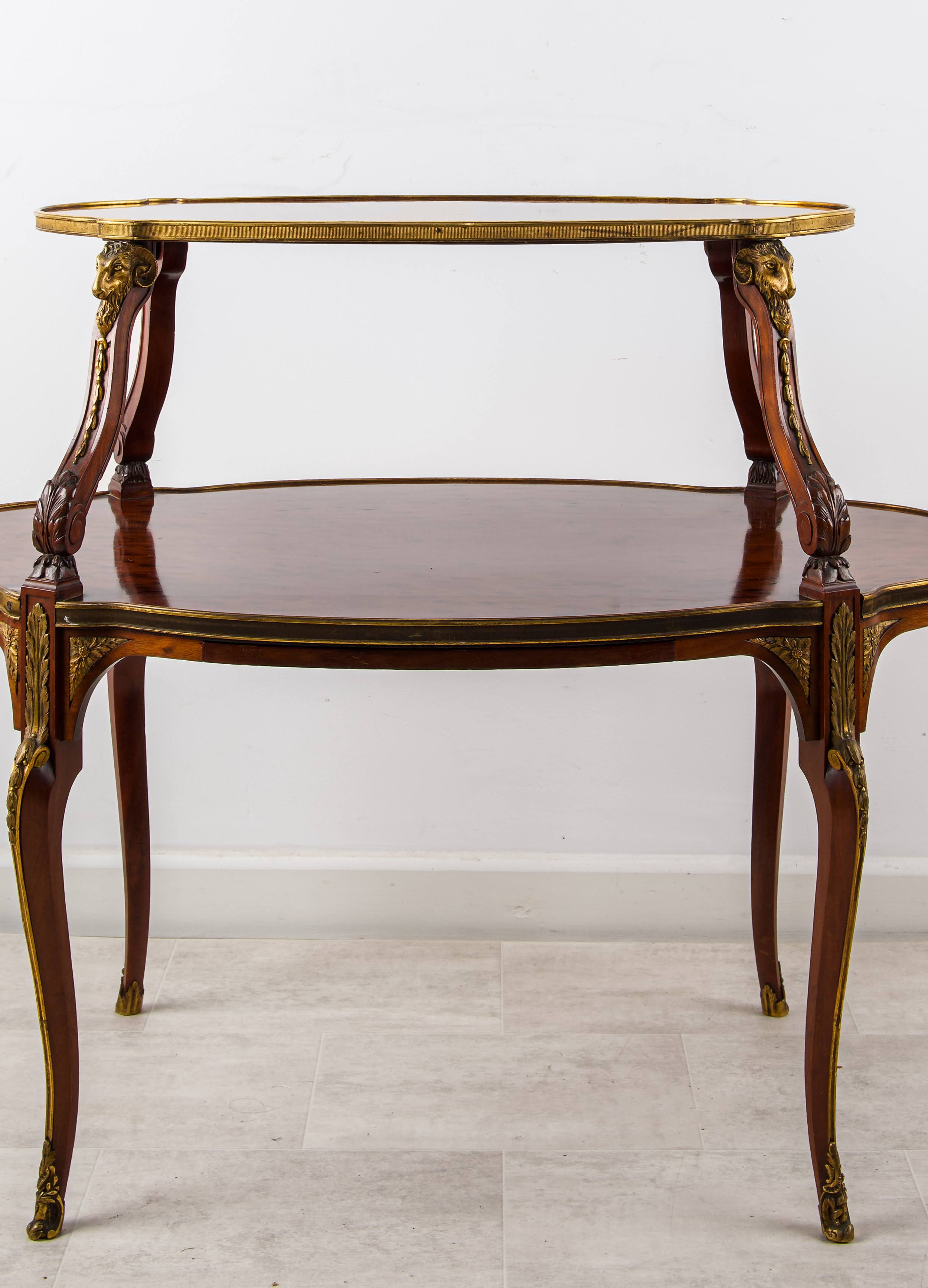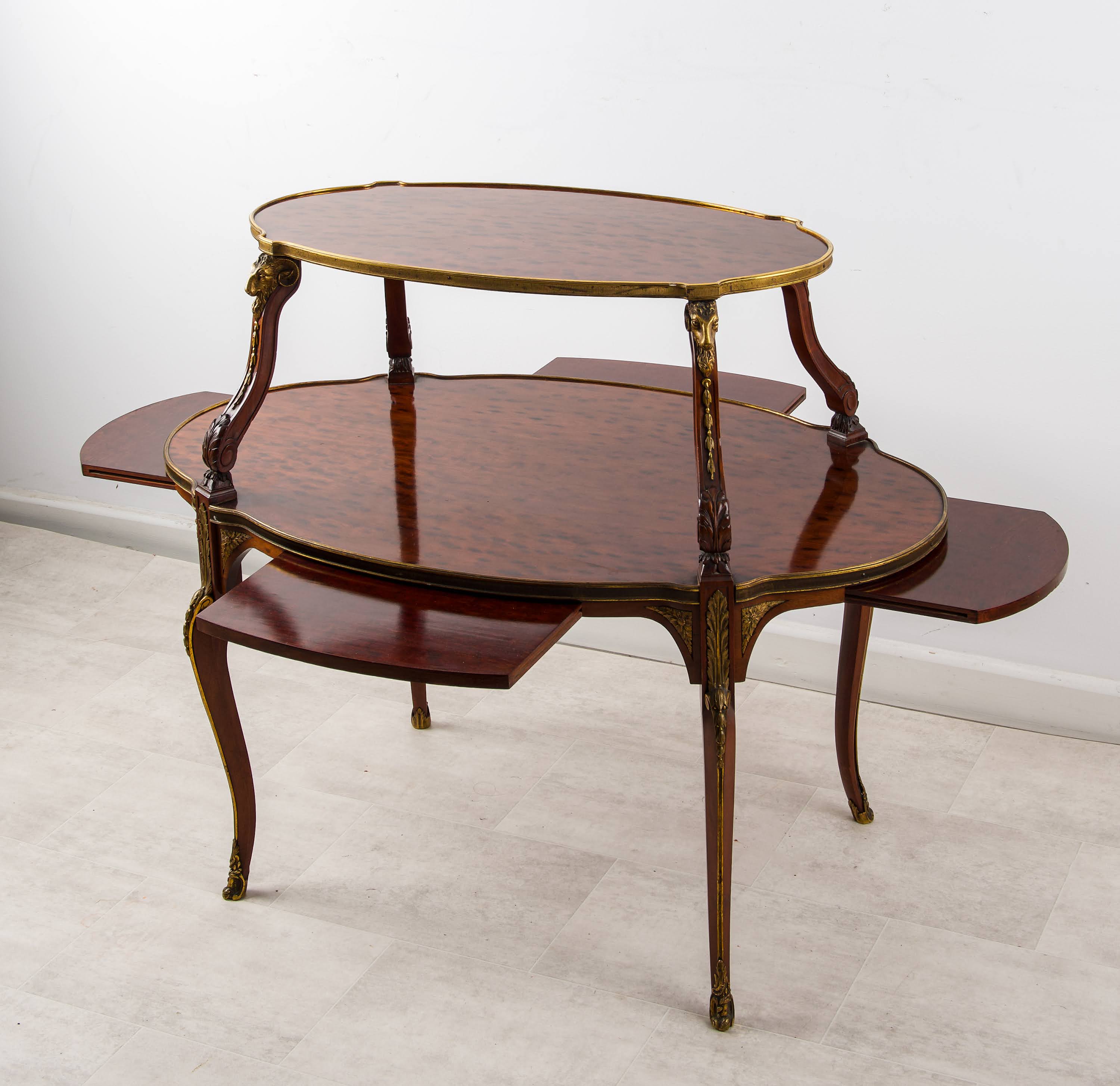 The table features two generously sized tiers with a beautifully polished surface, supported by elegant cabriole legs with finely cast gilt bronze mounts. Four pull-out slides extend smoothly from the lower tier, providing additional practical surface space while retaining excellent proportions.