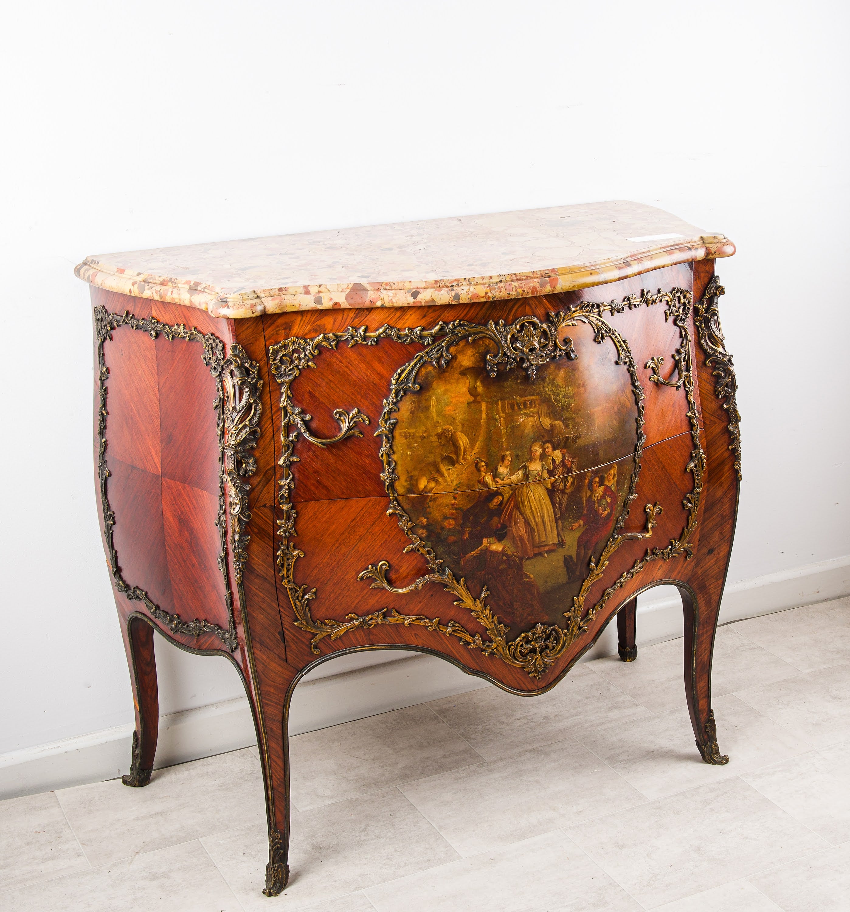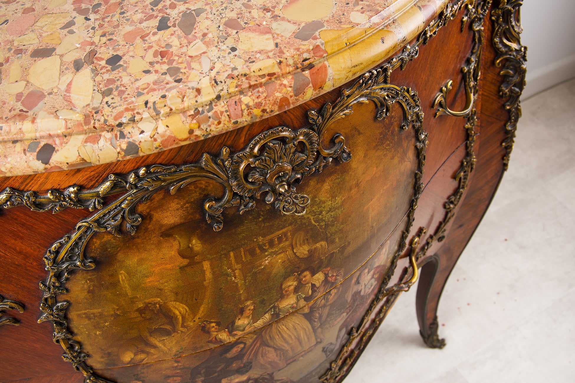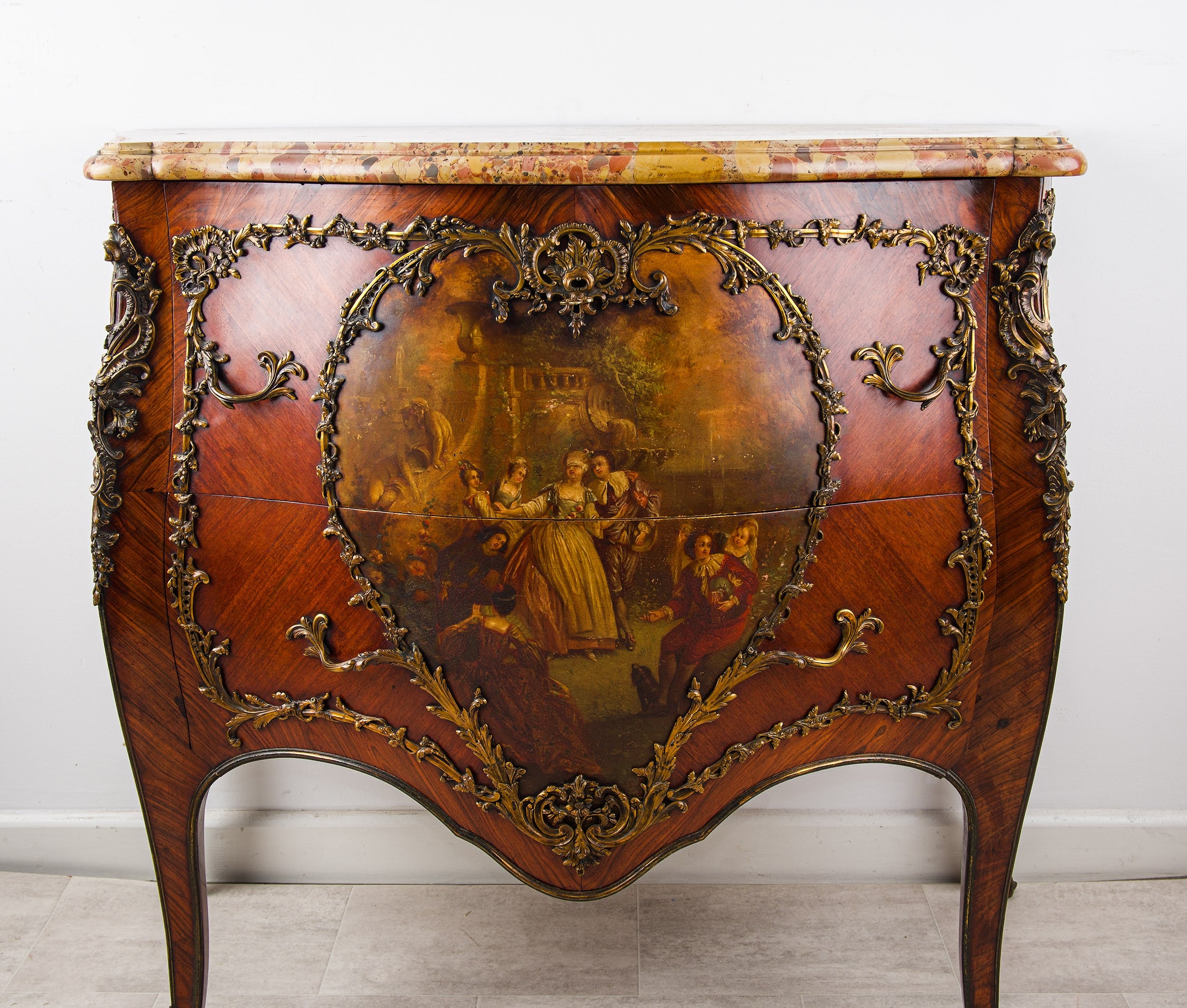 The commode is surmounted by a shaped breccia marble top in warm cream, rose and honey tones. The façade features a beautifully executed Vernis Martin scene depicting elegant figures within a pastoral setting, enclosed by scrolling ormolu mounts of excellent quality. Further gilt bronze mounts enrich the corners, legs and apron, enhancing the sculptural bombe form.