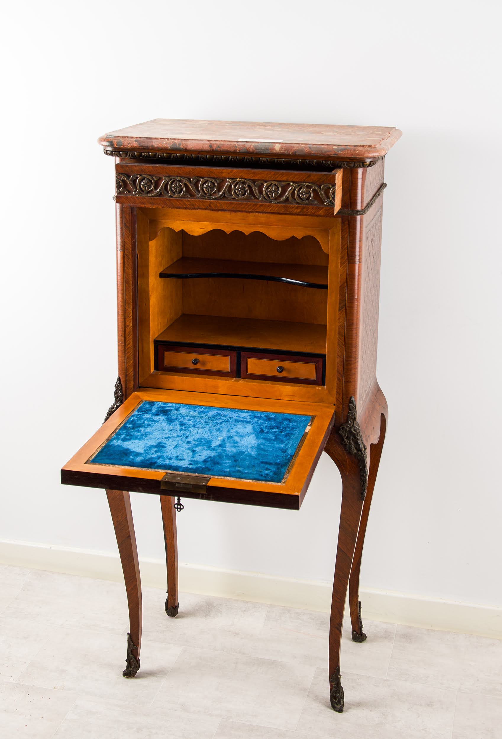 Raised on slender legs with applied ormolu mounts and decorative detailing, this cabinet is both decorative and practical, ideal as a small writing desk, hall piece, or bedroom secretaire.