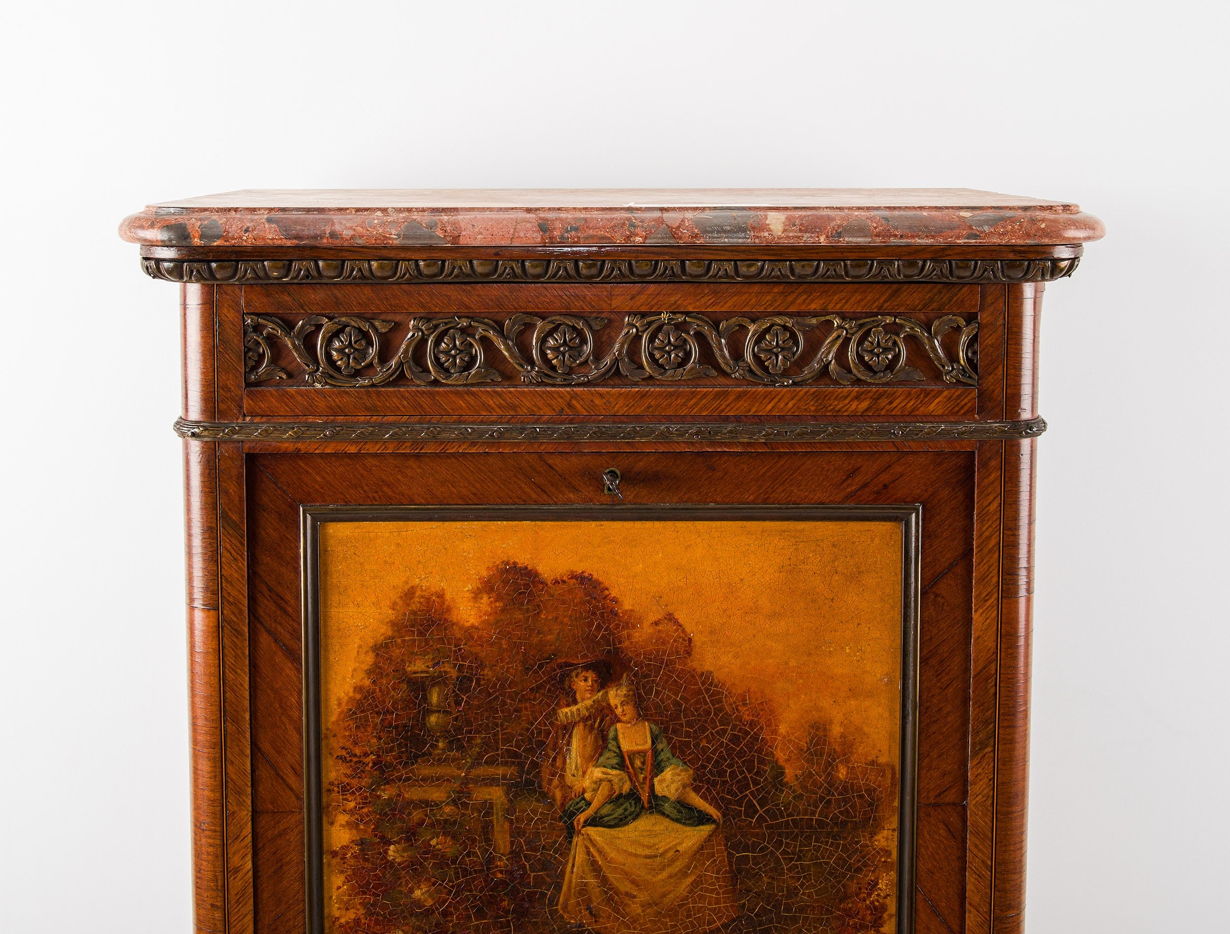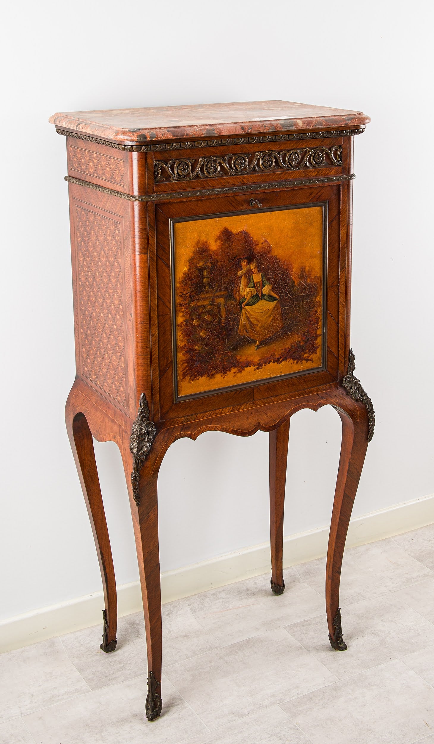 The cabinet features a finely painted Vernis Martin panel to the front, depicting a romantic pastoral scene, framed within richly figured timber. The drop-front opens to reveal a fitted writing interior with shelving and drawers, retaining its original blue velvet writing surface.