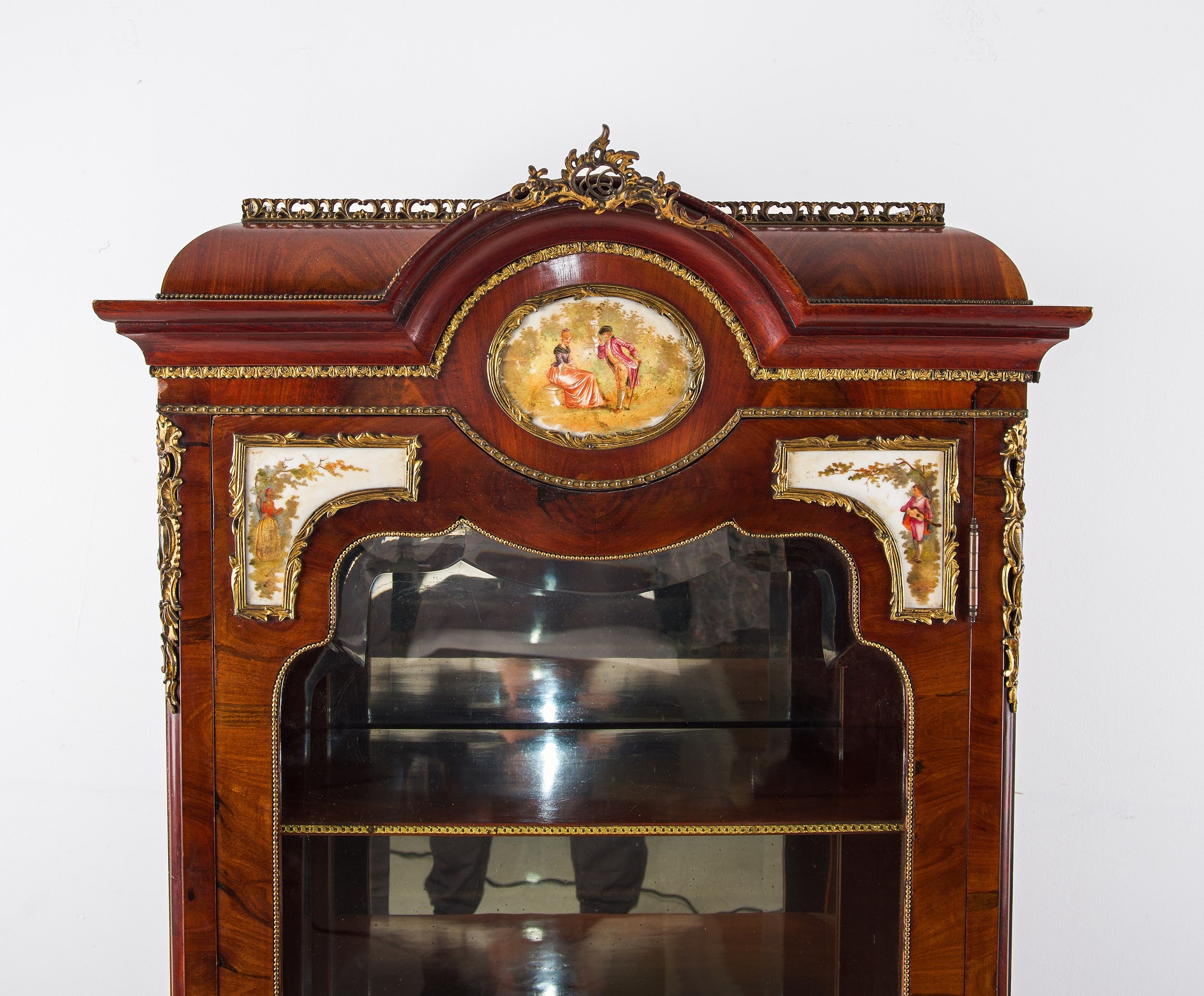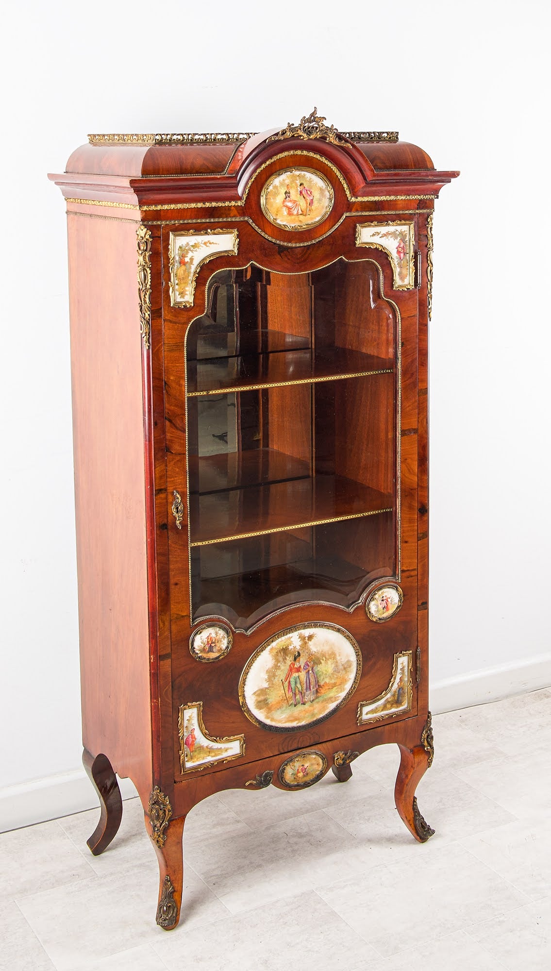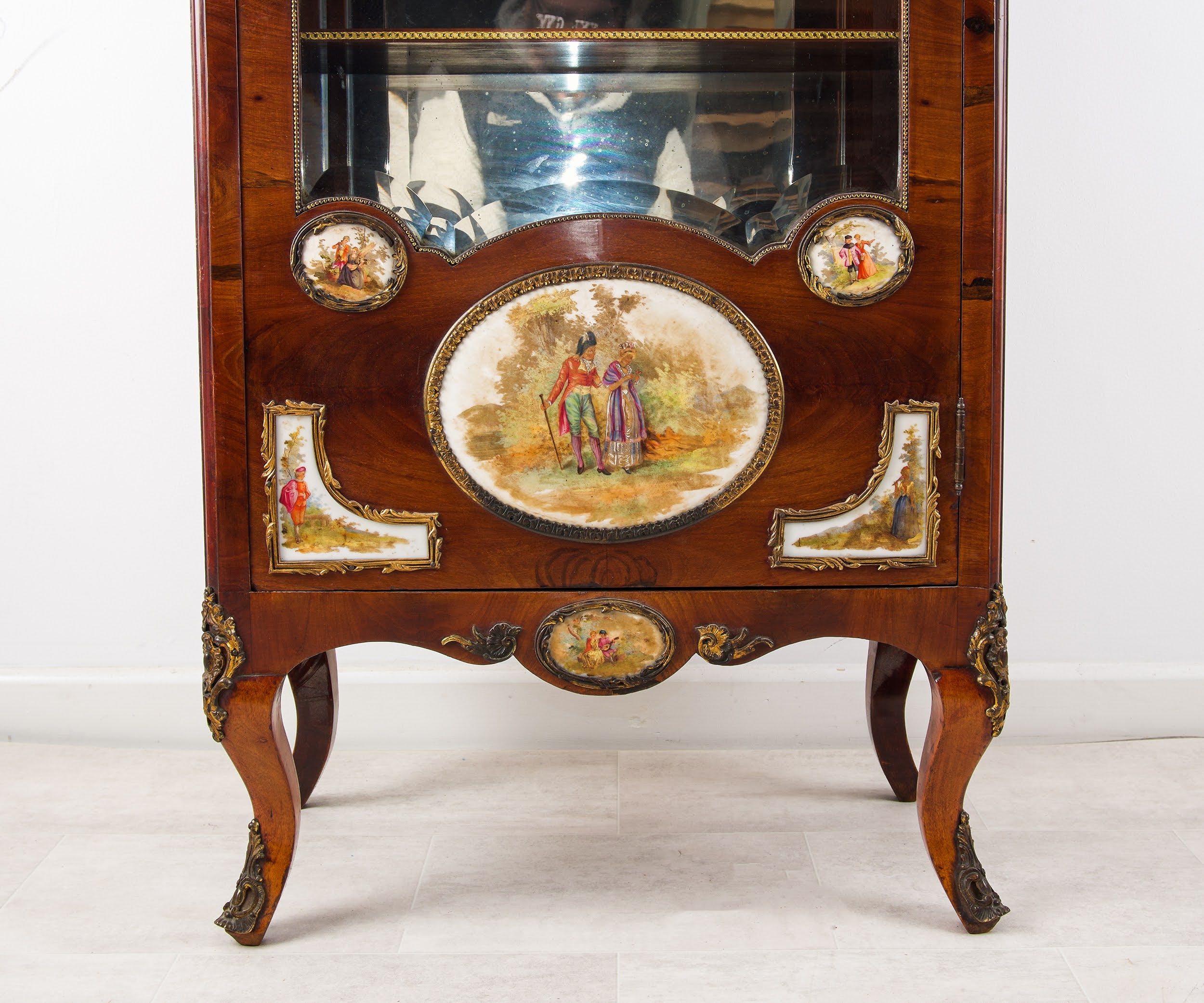 Antique French Walnut Vitrine Cabinet with Porcelain Plaques & Ormolu, c.1910
