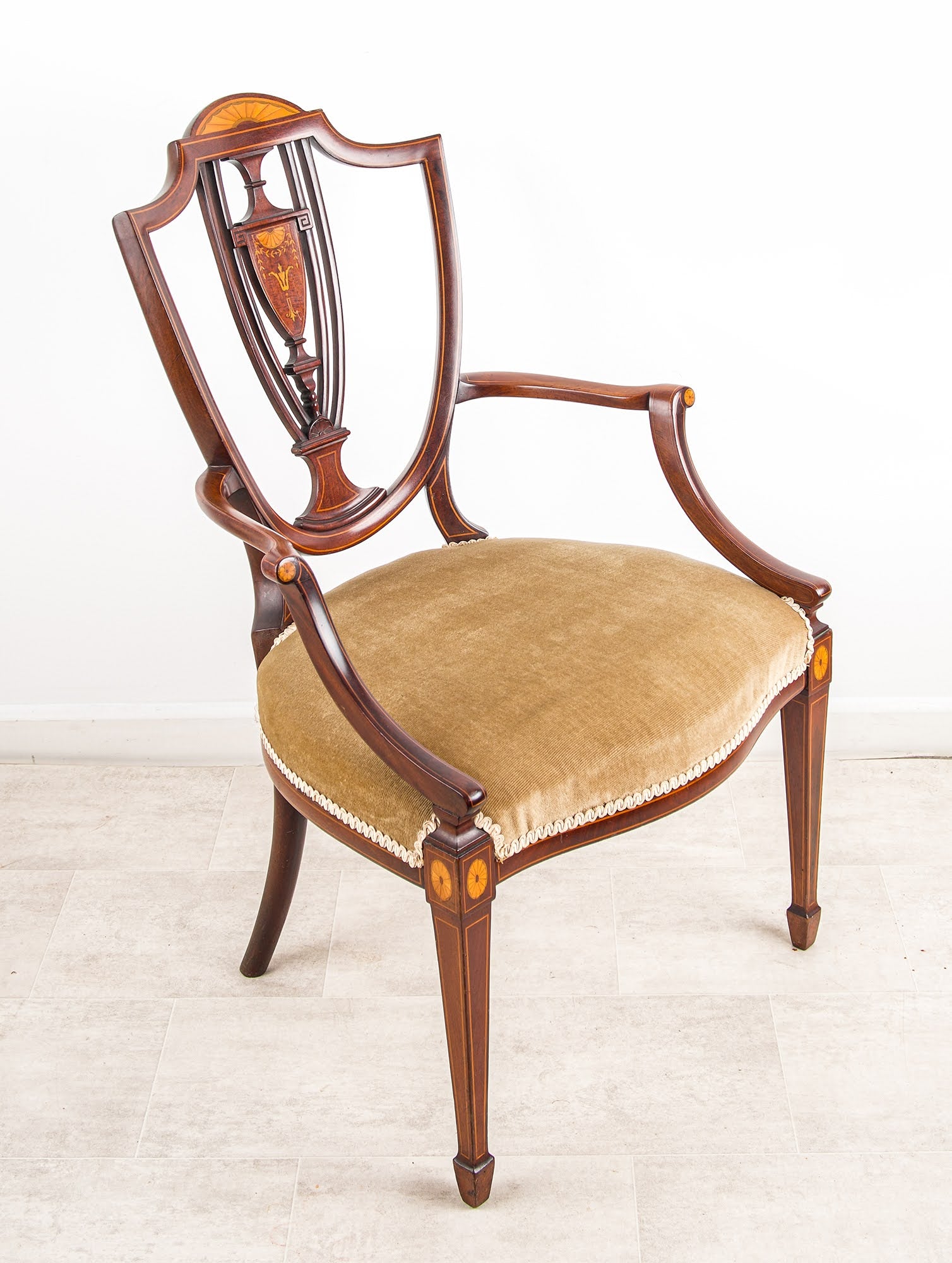 Antique Mahogany Hepplewhite Shield Back Armchair - Satinwood Inlay, English Open Arm Chair c.1900
