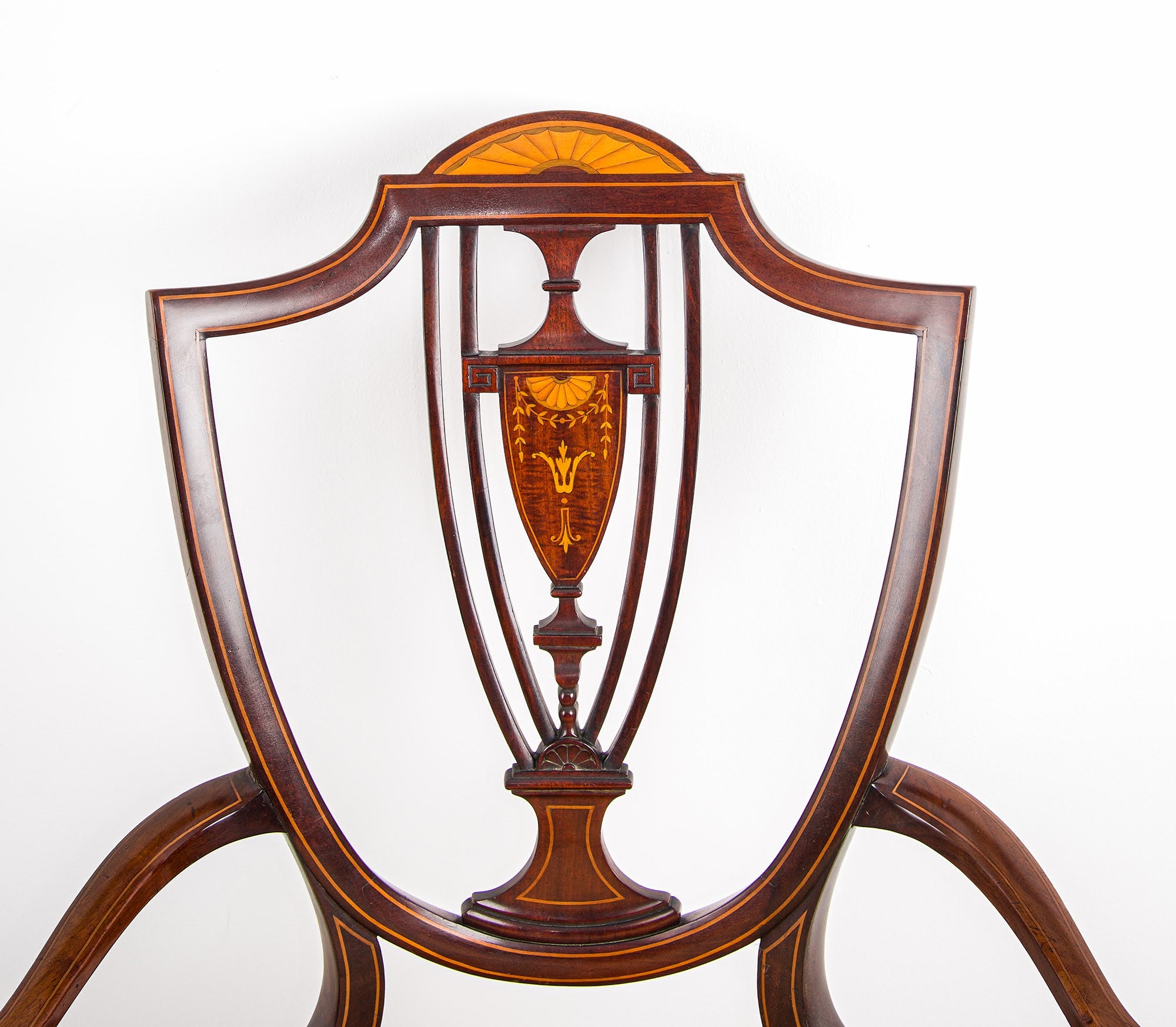 The chair features a classic shield-shaped back with a finely detailed satinwood inlaid urn splat, decorated with delicate husk swags and fan motifs. Additional satinwood inlay can be seen throughout, including oval paterae to the arms and legs, highlighting the quality and craftsmanship of this piece.