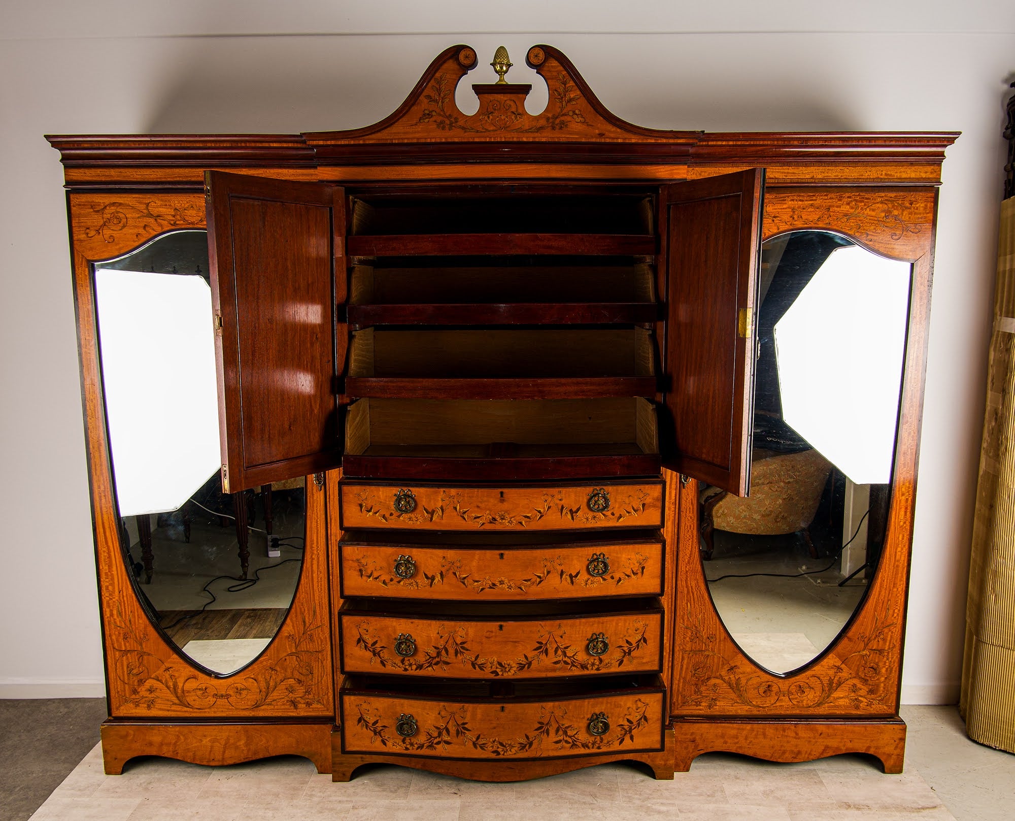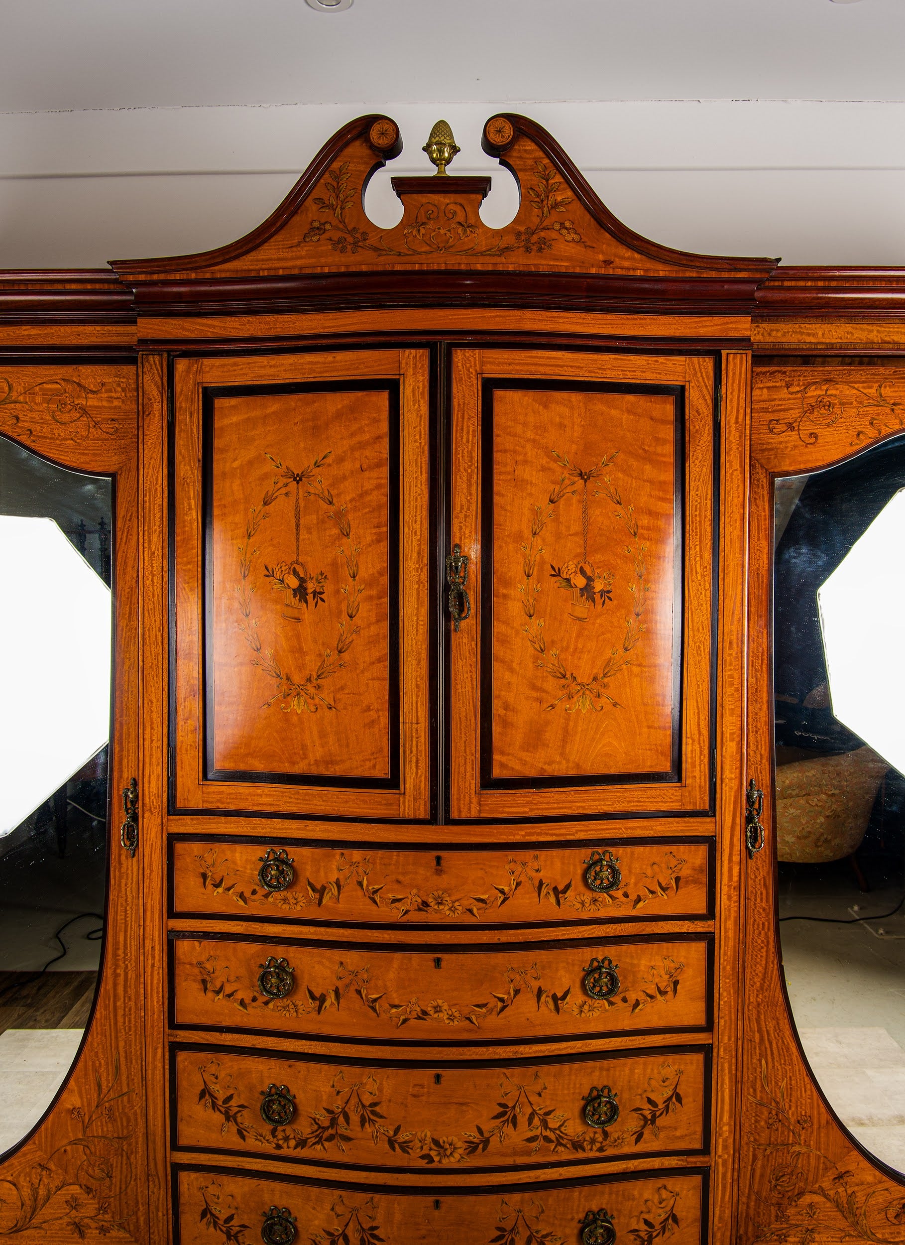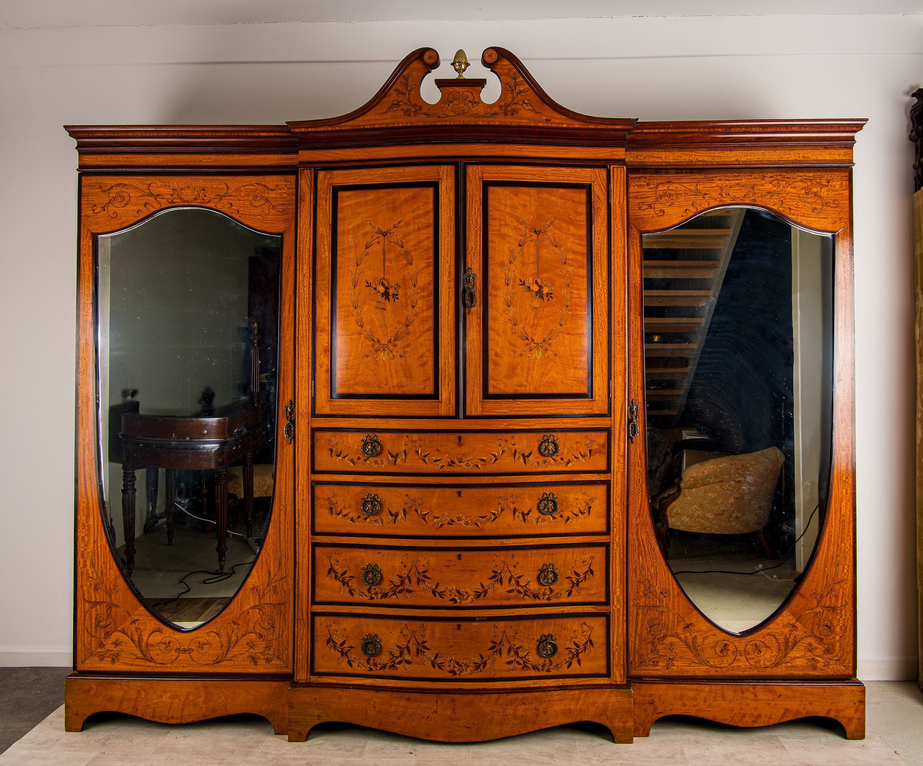 Condition Note: The compactum is in good antique condition commensurate with its age of over 100 years. The satinwood veneer is sound and well-preserved throughout with the warm golden patina of age. The marquetry inlay is intact across all surfaces - the floral swags, scrolling acanthus and foliate motifs are all clearly defined and well-preserved with no significant losses. The four drawers run smoothly. The central cupboard and flanking hanging sections are fully functional with their original fittings intact. The oval mirrored doors to the flanking sections retain their original mirror plates. The gilt acorn finial is present and intact. An honest description from a specialist dealer with 60+ years of family experience.