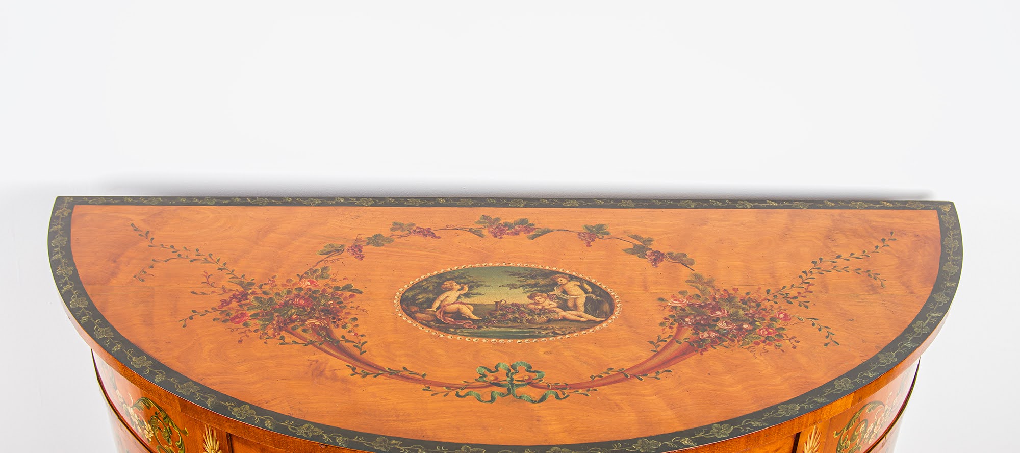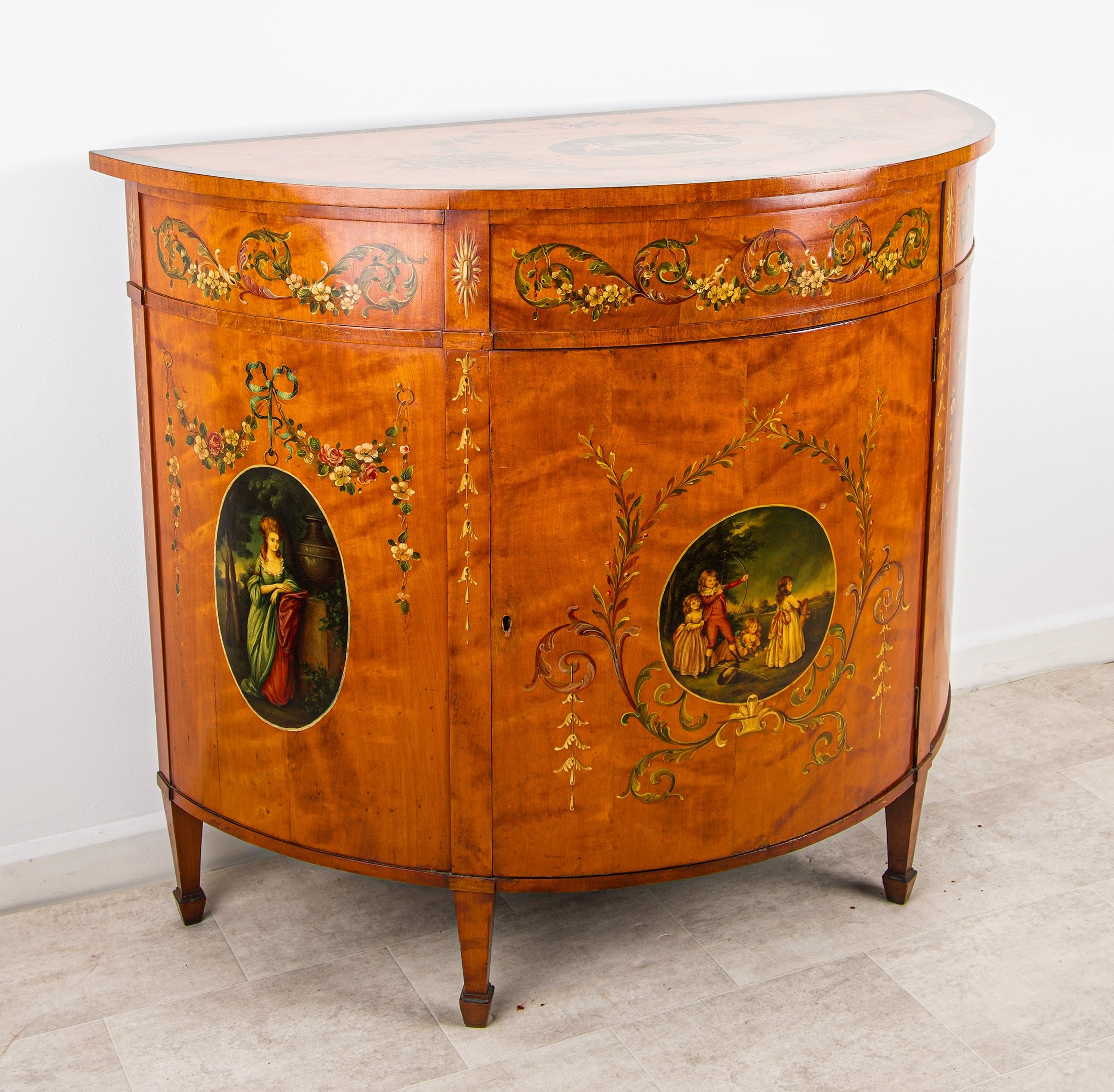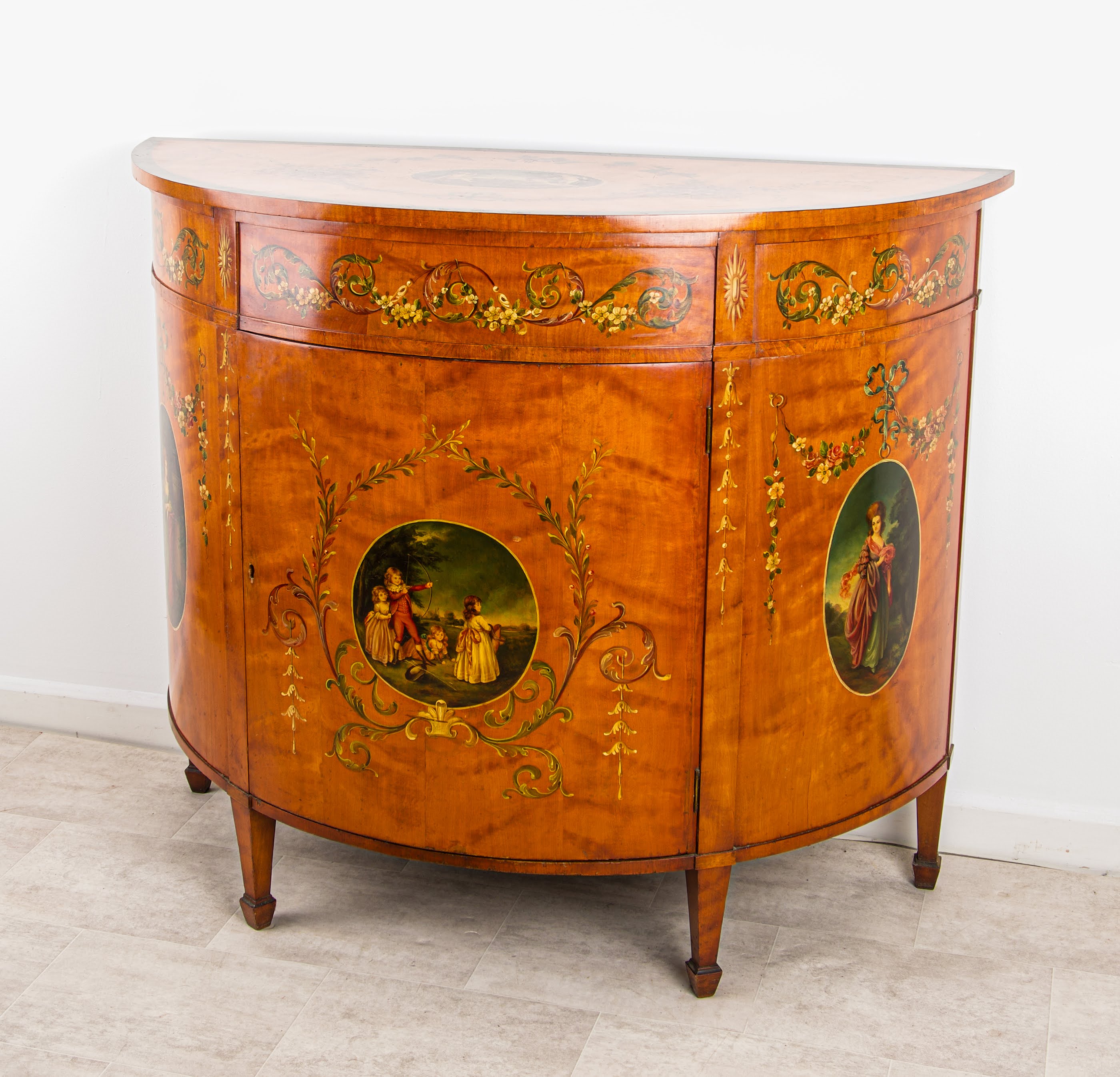 This finely made half-moon cabinet is veneered in satinwood, renowned for its rich golden tone and smooth lustrous finish. The piece is exquisitely hand-painted with delicate floral swags and classical motifs, centred with decorative oval panels depicting romantic scenes, showcasing exceptional craftsmanship and attention to detail.
