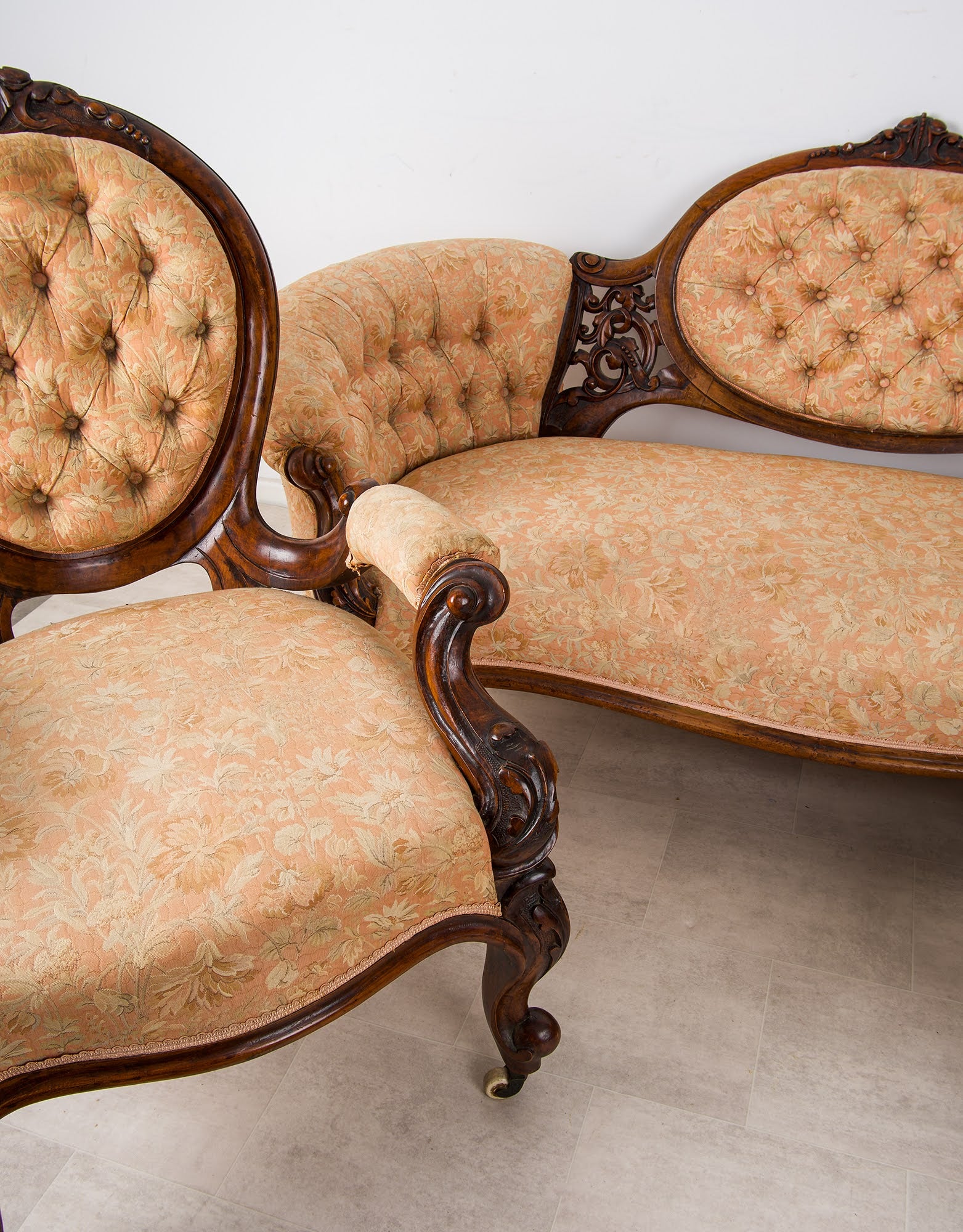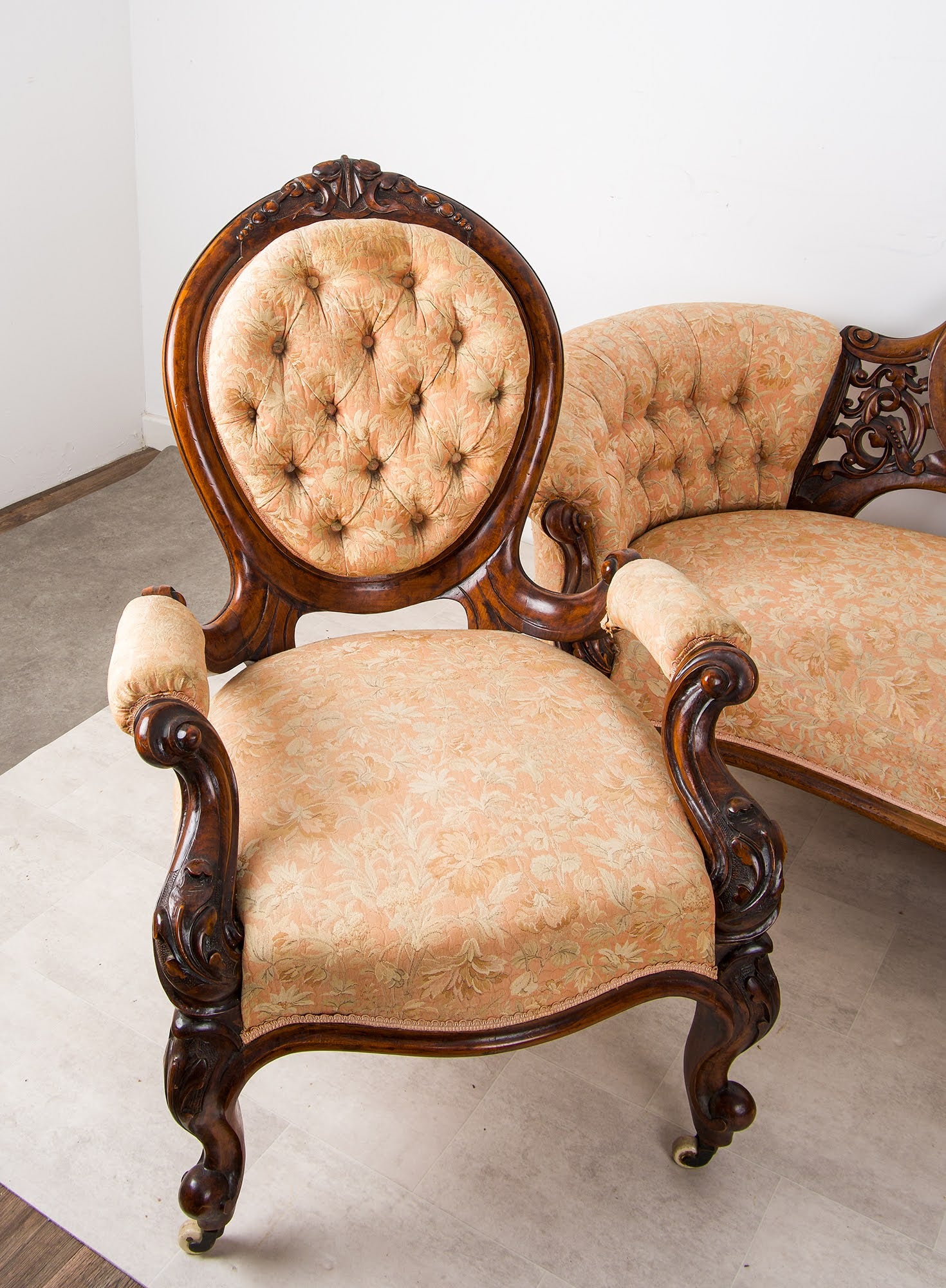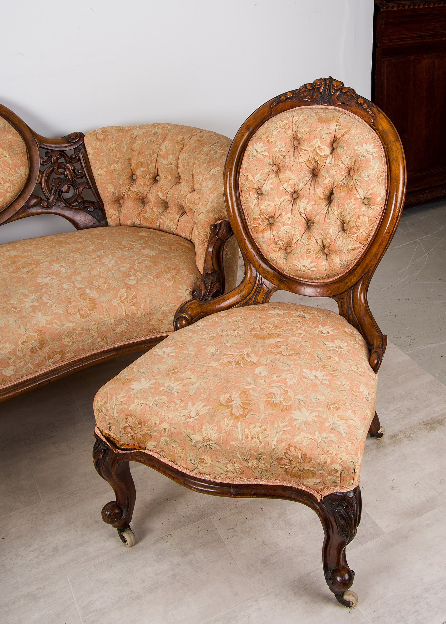 The suite is beautifully crafted in solid walnut with rich colour and patina, featuring deep scroll carving, shaped cabriole legs and original castors. The serpentine-fronted settee is centred by an oval upholstered back panel, flanked by finely pierced and carved splats, while the chairs echo the same design language throughout.