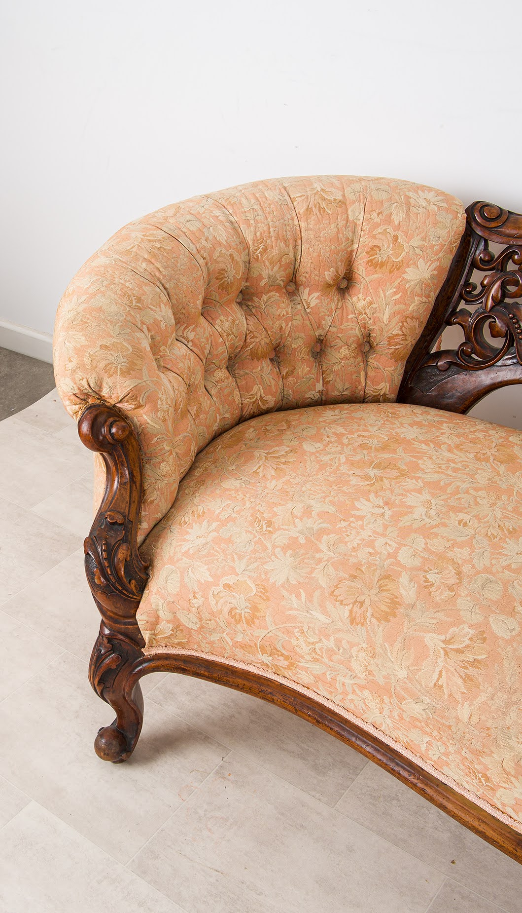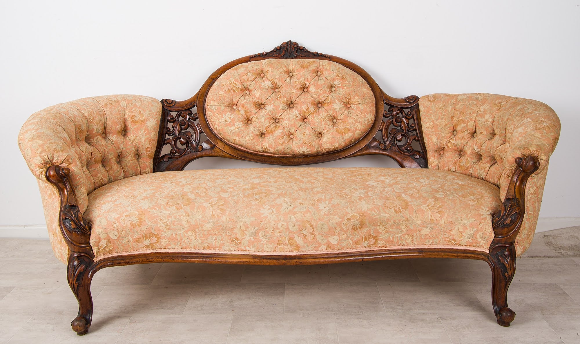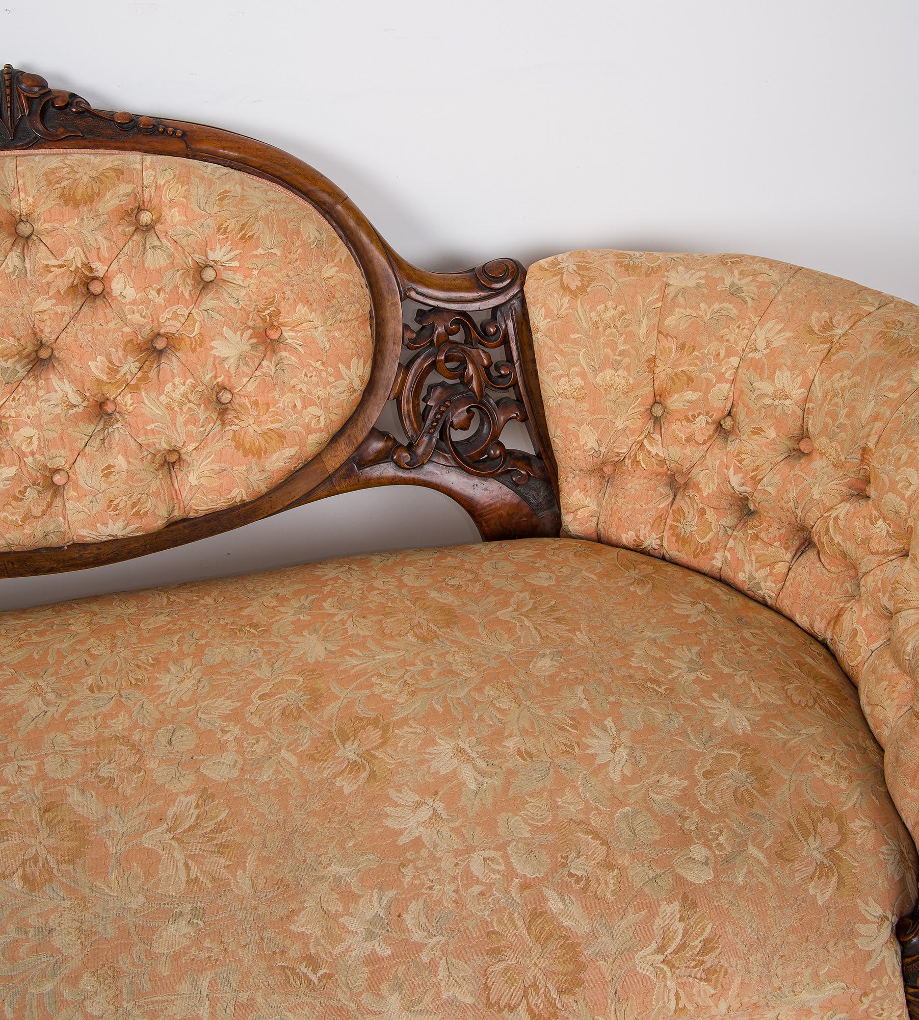 The suite is beautifully crafted in solid walnut with rich colour and patina, featuring deep scroll carving, shaped cabriole legs and original castors. The serpentine-fronted settee is centred by an oval upholstered back panel, flanked by finely pierced and carved splats, while the chairs echo the same design language throughout.
