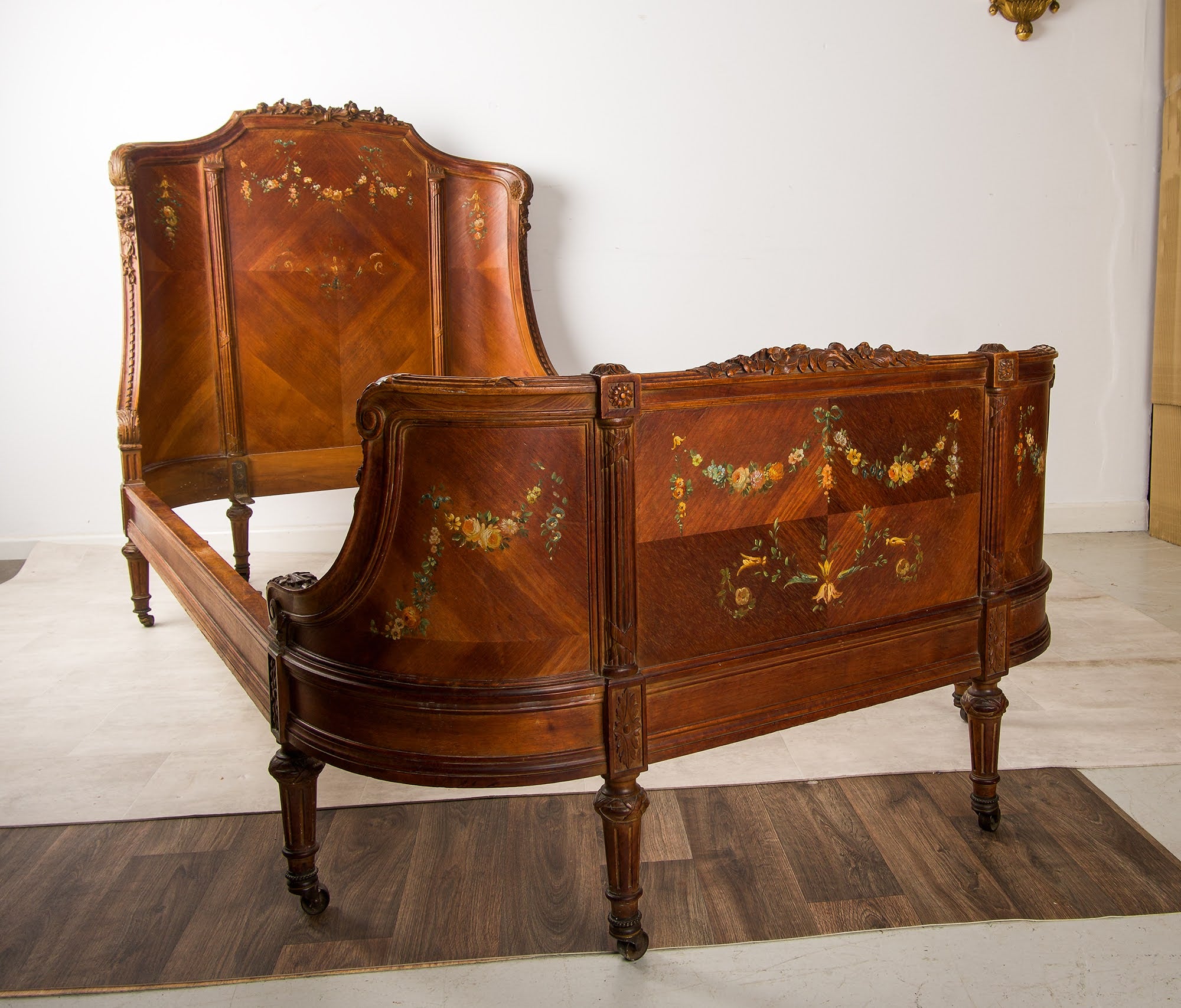 The shaped headboard and footboard are beautifully enhanced with delicate hand-painted floral garlands and bouquets. The flowing serpentine form and carved cresting give the piece elegance and movement, while the warm timber tones contrast attractively with the painted detailing.