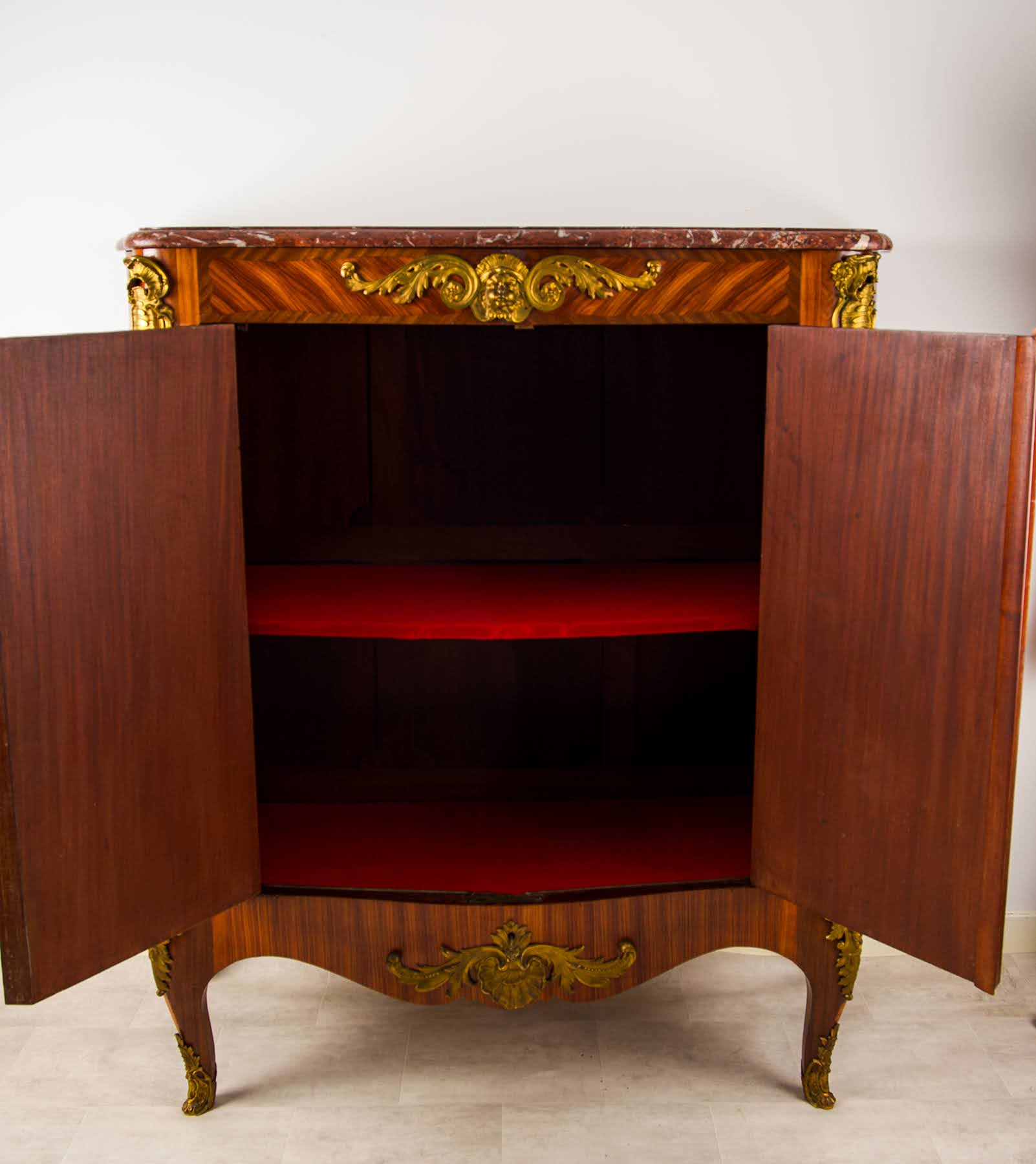 The two doors open to reveal a shelved interior, offering practical storage while maintaining the cabinet’s elegant proportions. Raised on graceful cabriole legs with gilt-bronze feet, the cabinet presents a harmonious balance of luxury and refinement.