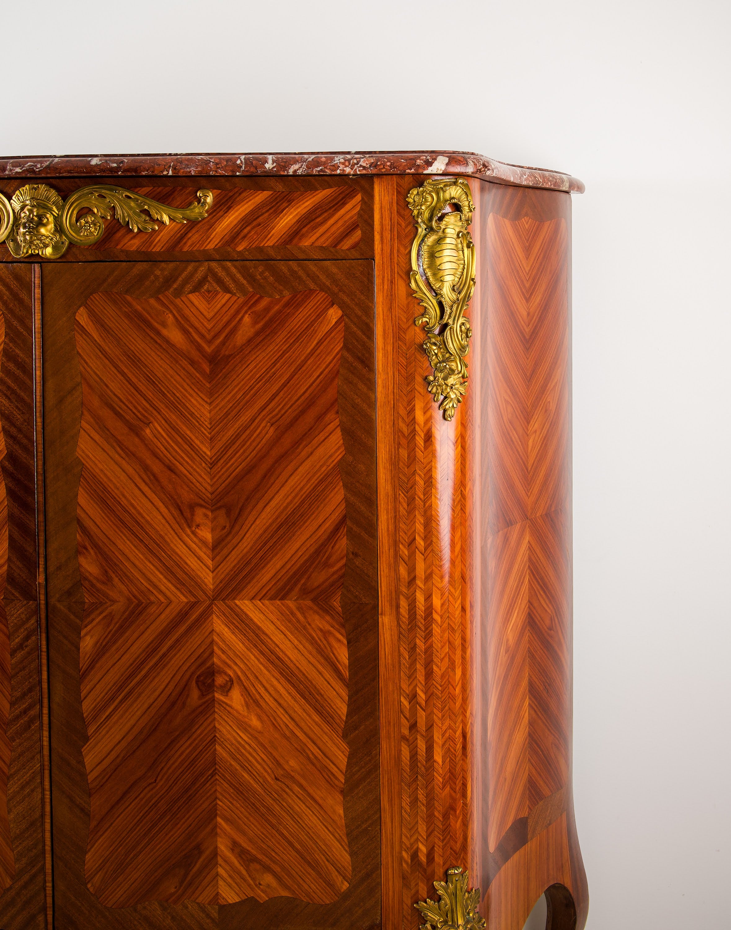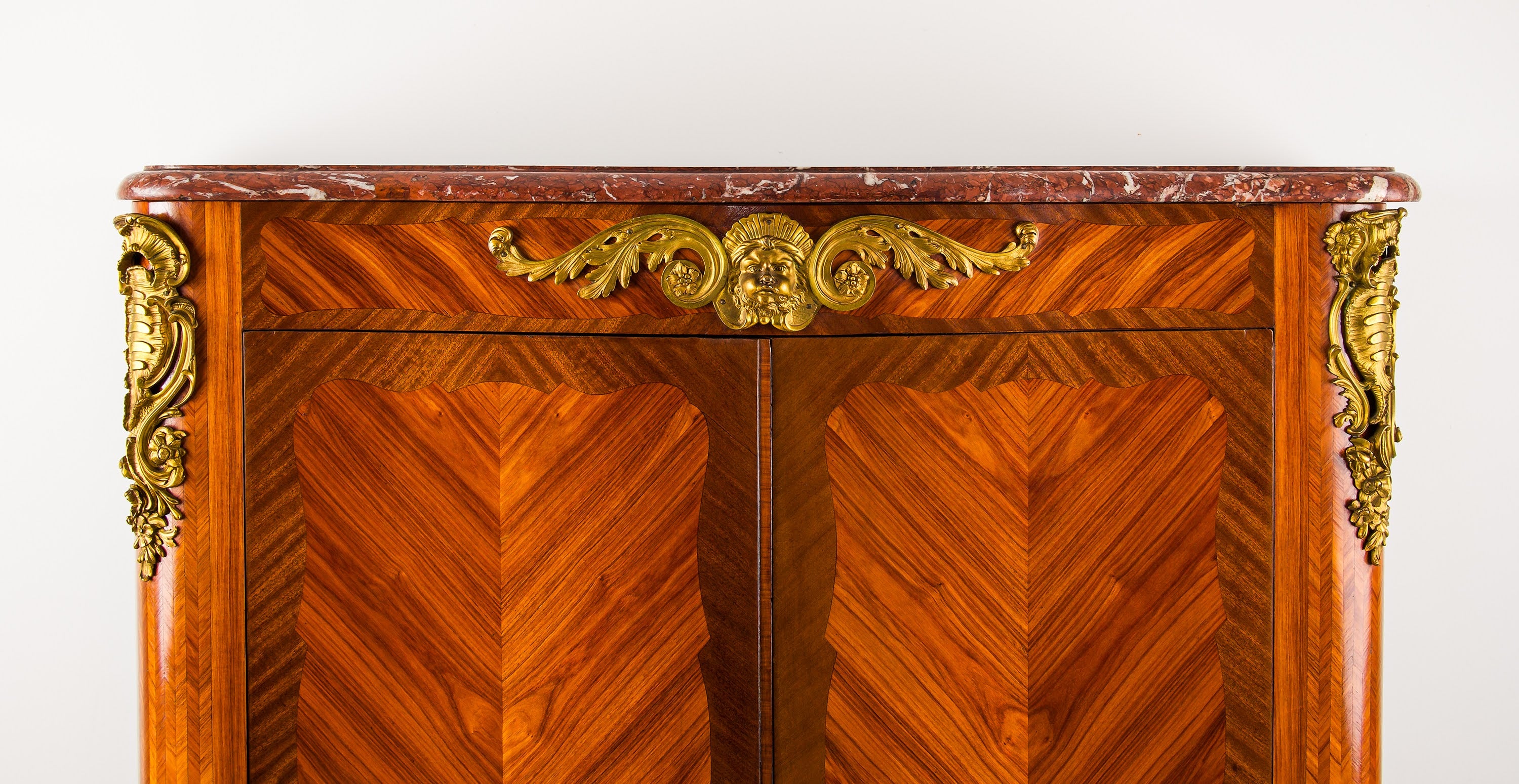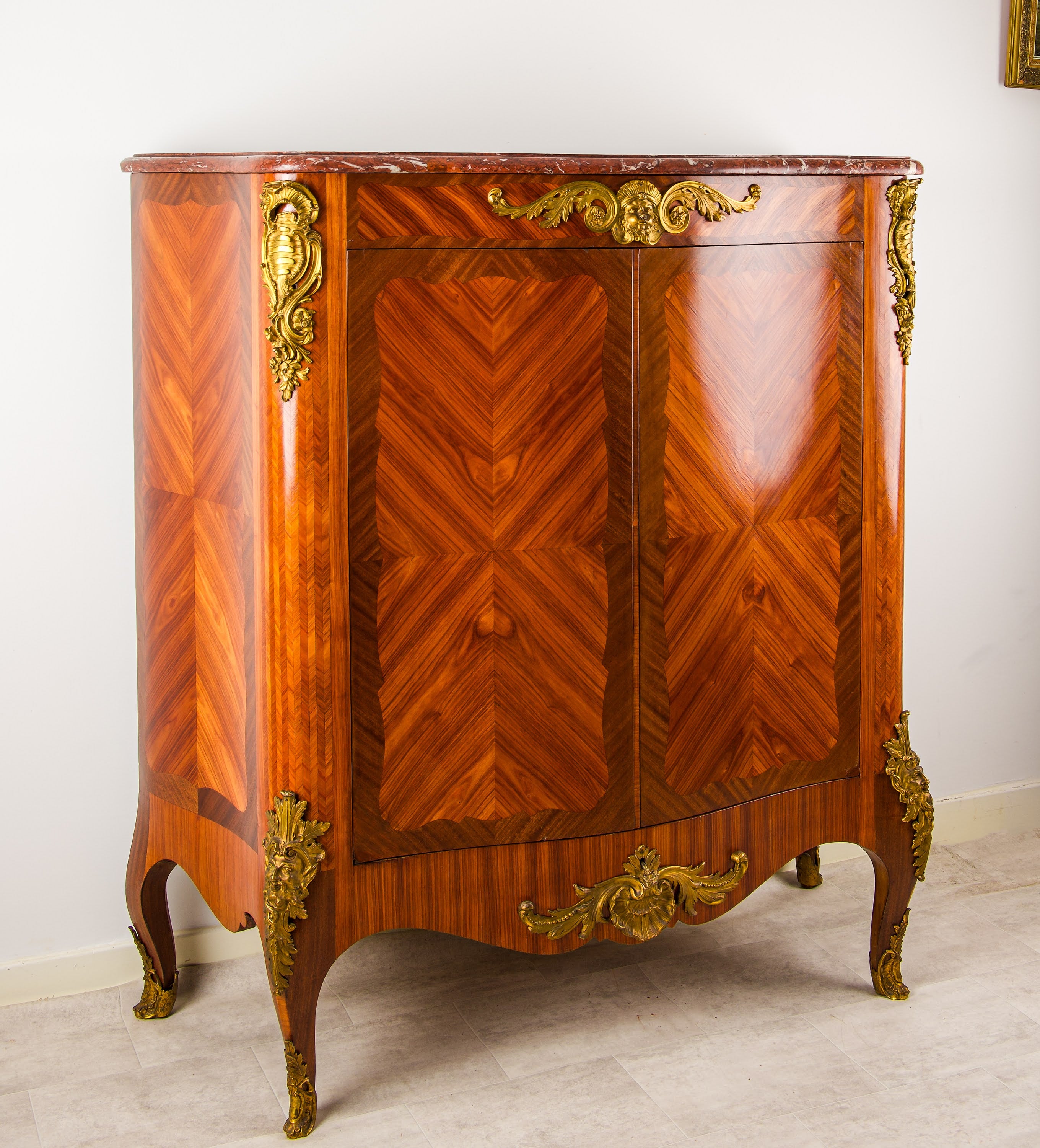 The cabinet displays superb craftsmanship throughout, with carefully book-matched kingwood panels arranged in a refined geometric parquetry pattern, framed by elegant cross-banding. The gently serpentine form is complemented by a richly veined red marble top, providing a striking contrast to the warm tones of the timber.