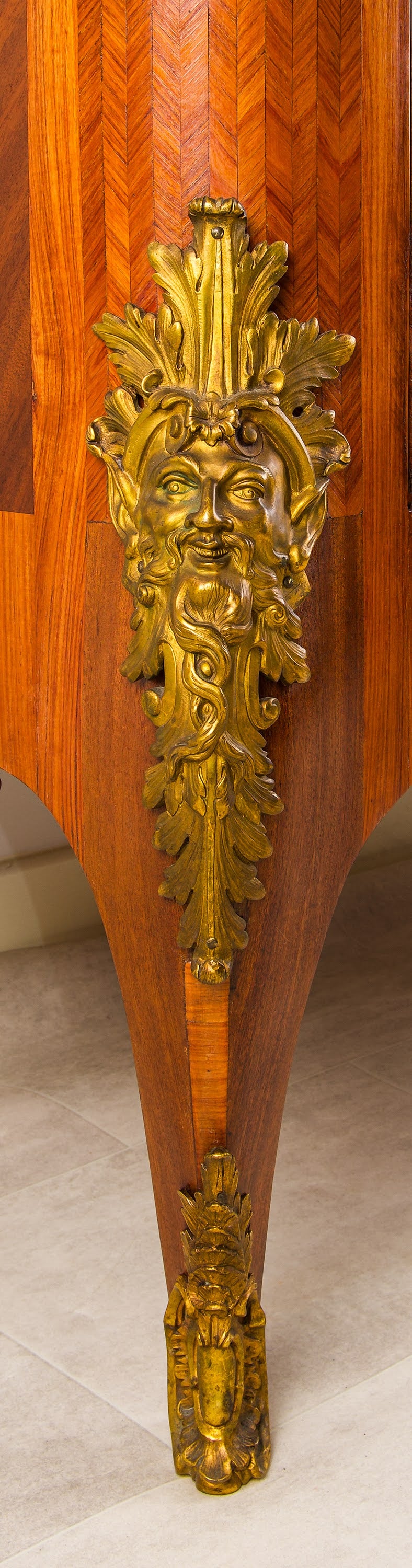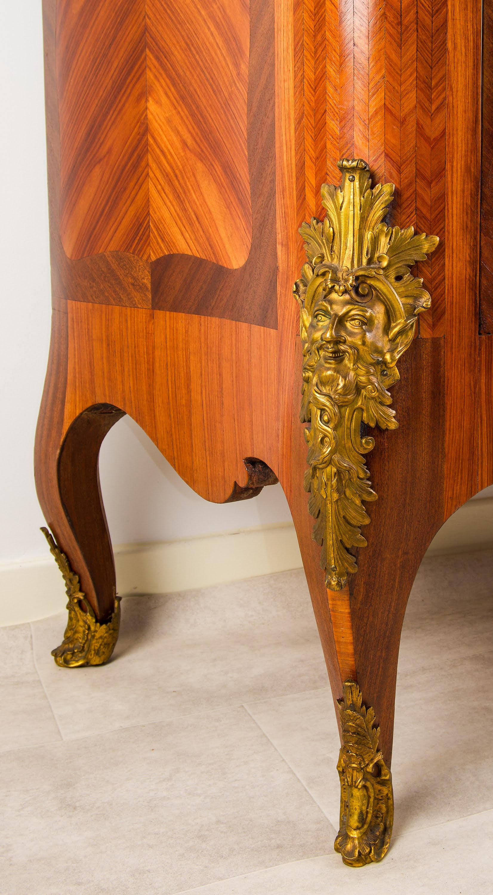 The piece is adorned with high-quality gilt-bronze mounts, including finely modelled masks, scrolling foliage, corner mounts and sabots, all crisply cast and retaining a rich, original gilded finish. These mounts are entirely consistent with the production of Maison Millet, one of the most respected Parisian ébénistes of the 19th century.