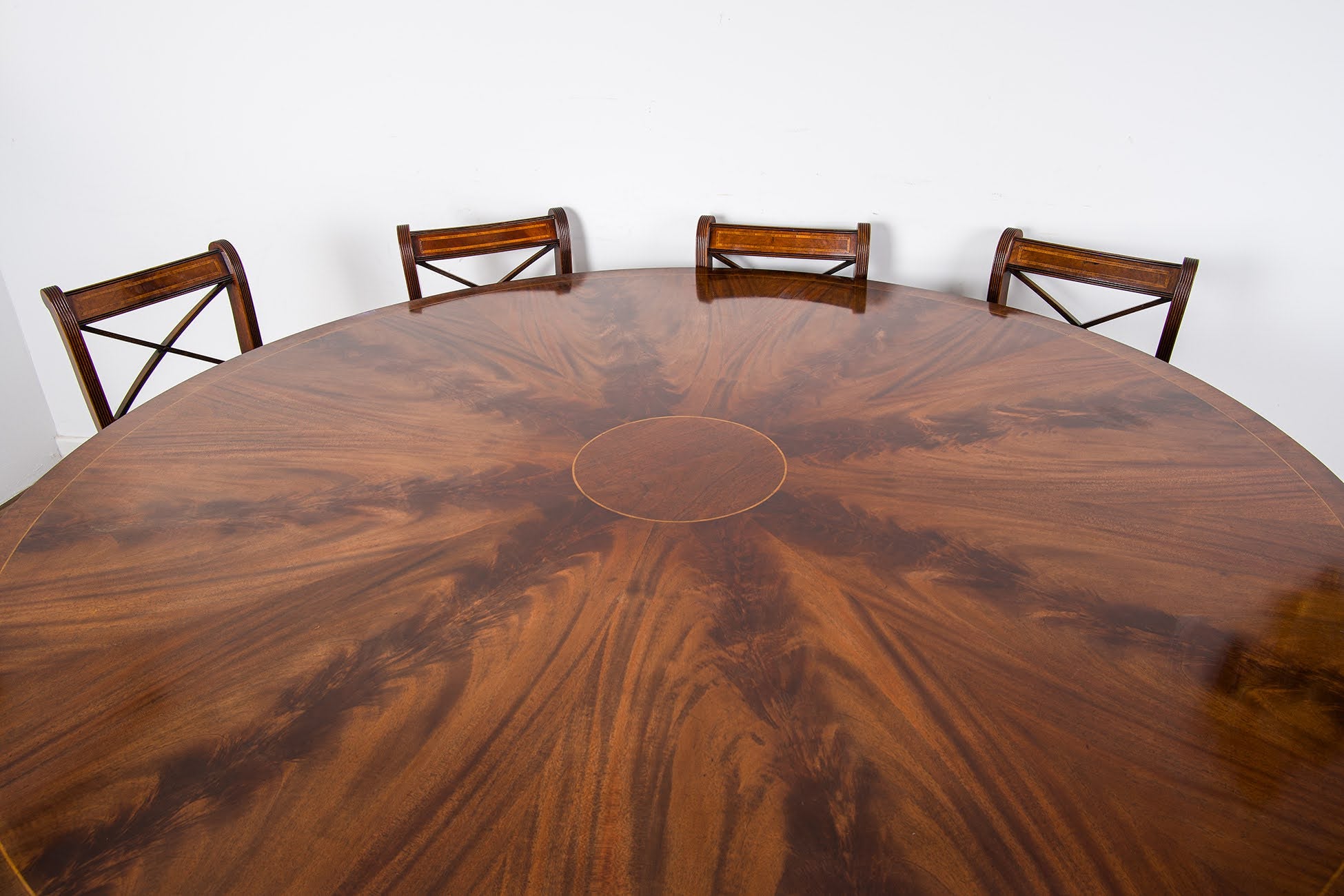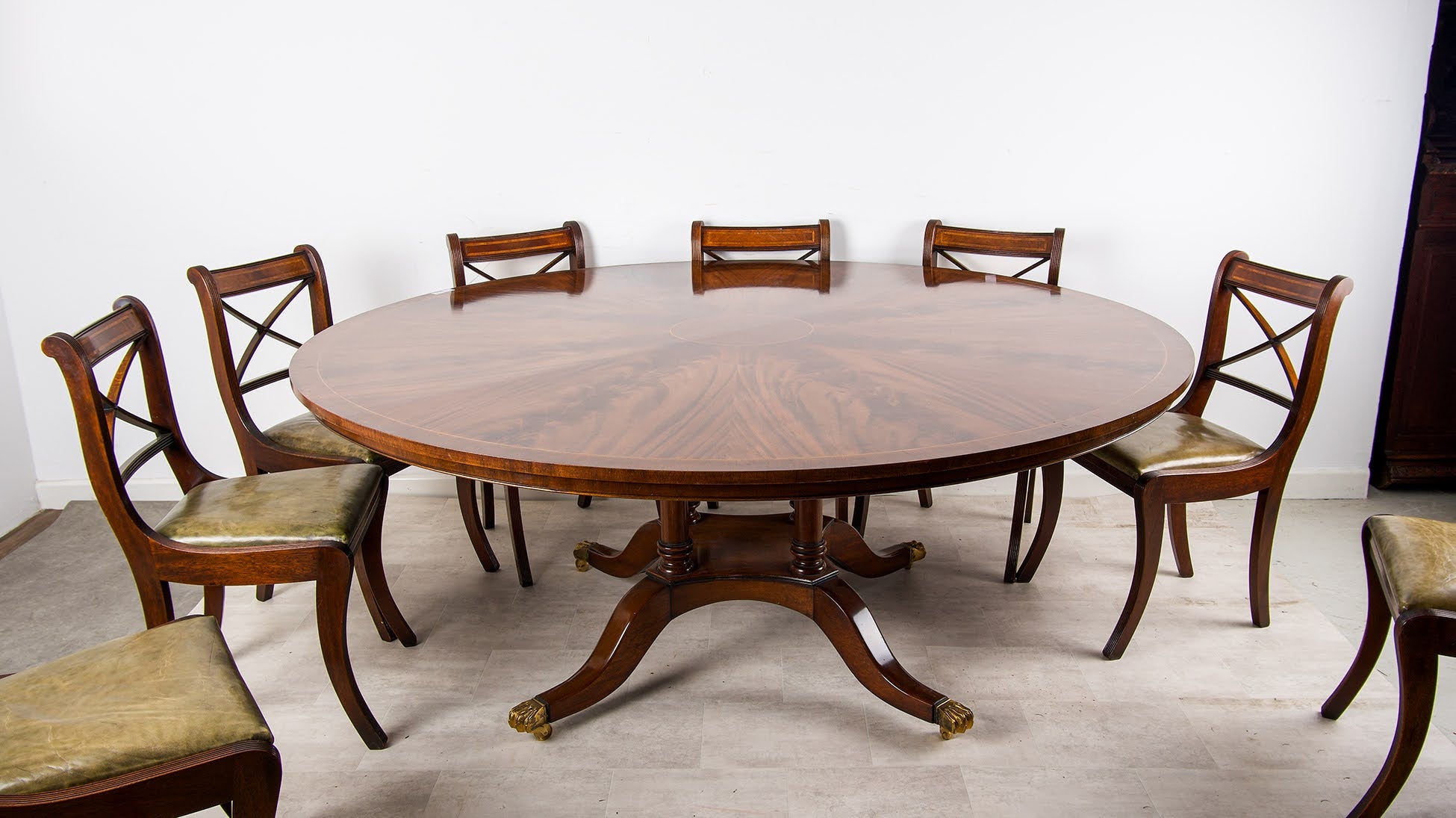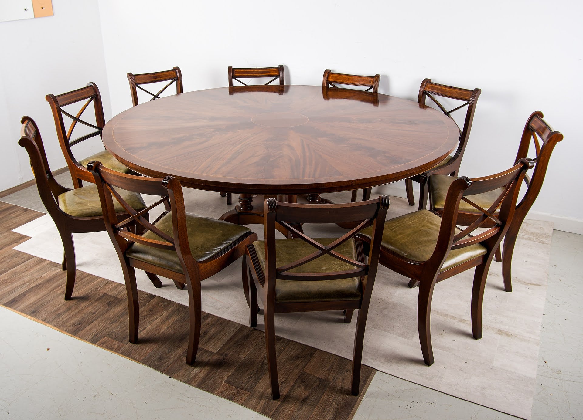 Exceptional Large Regency-Style Circular Flame Mahogany Dining Table & Set of Ten Chairs