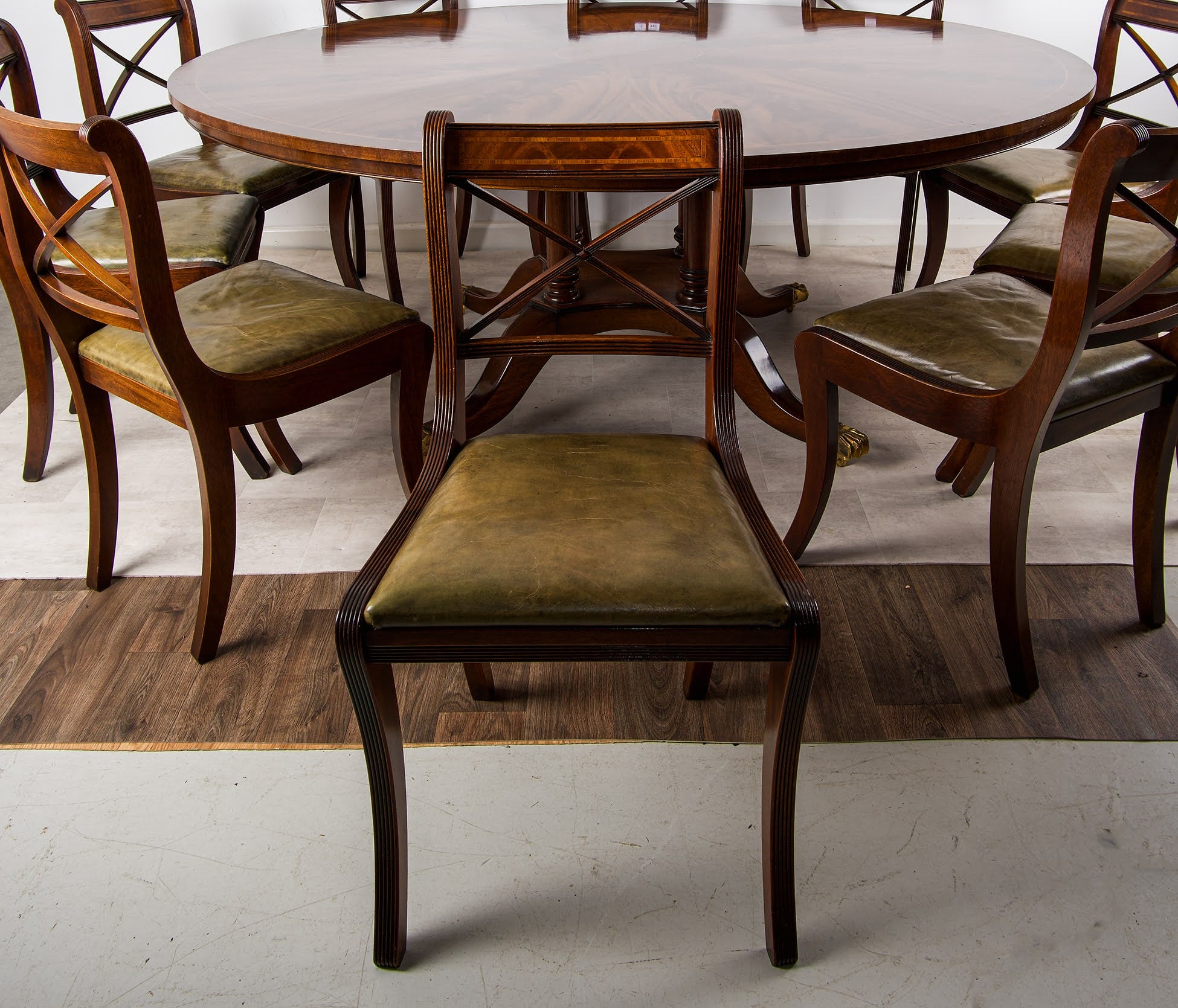 Accompanying the table is a matching set of ten Regency-style inlaid mahogany dining chairs, late 20th century, each with tulipwood banded top rails, elegant X-backs, reeded lower rails and uprights, and reeded sabre legs. The drop-in seats are upholstered in olive green leather, offering both comfort and visual contrast.