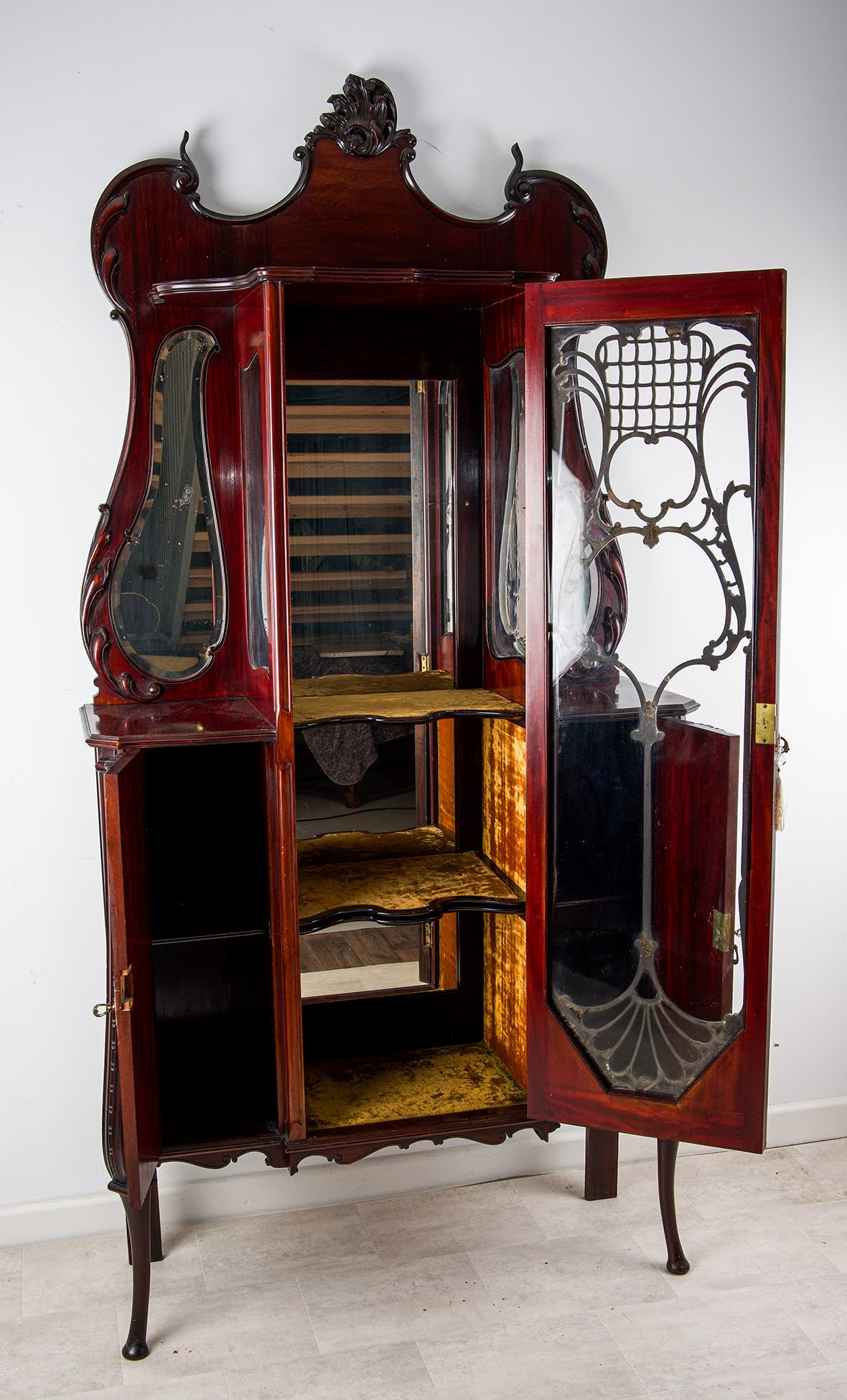 Exceptional Victorian Carved Mahogany Display Cabinet with Mirrored Sides & Velvet Interior, c.1900