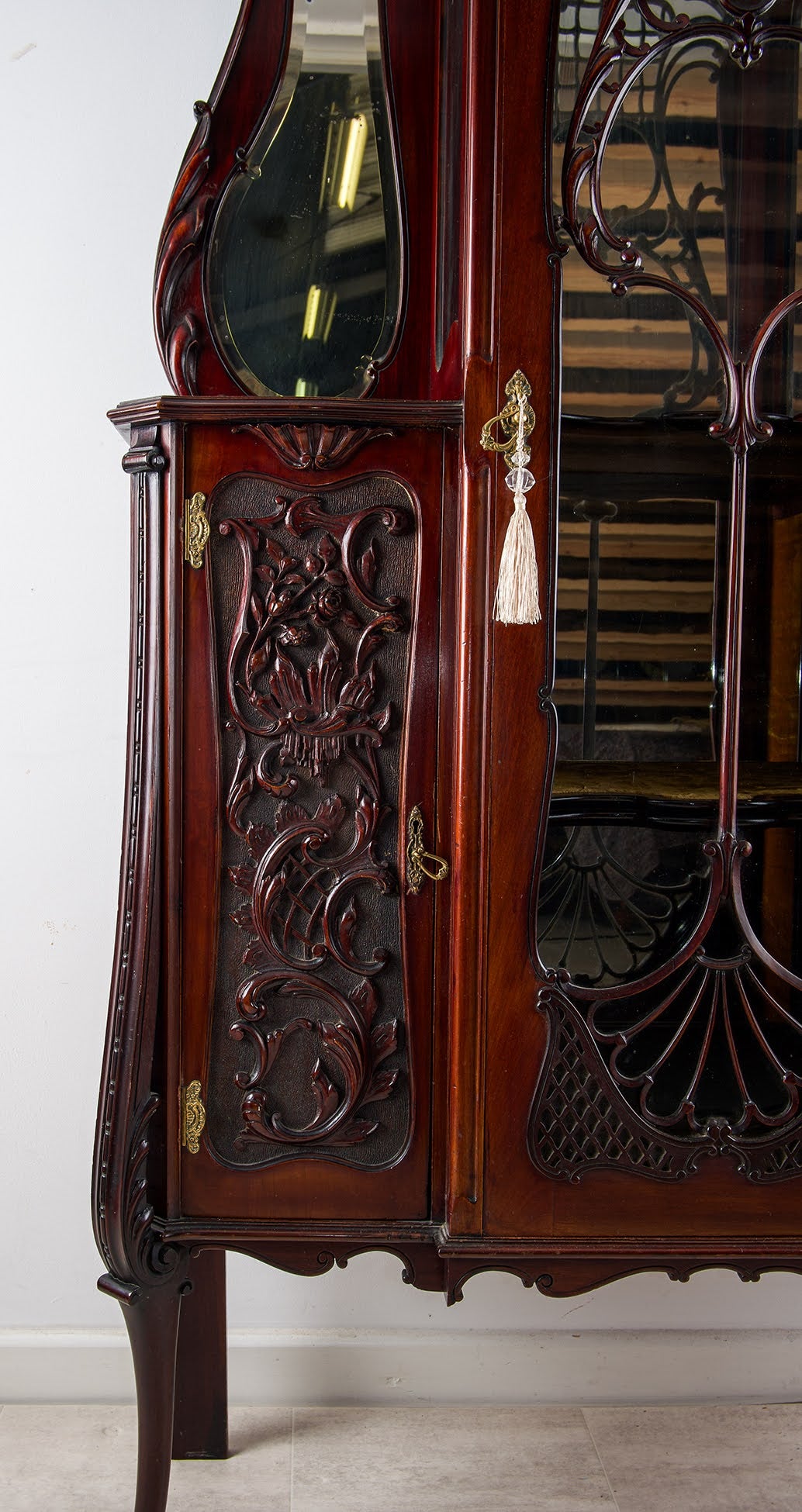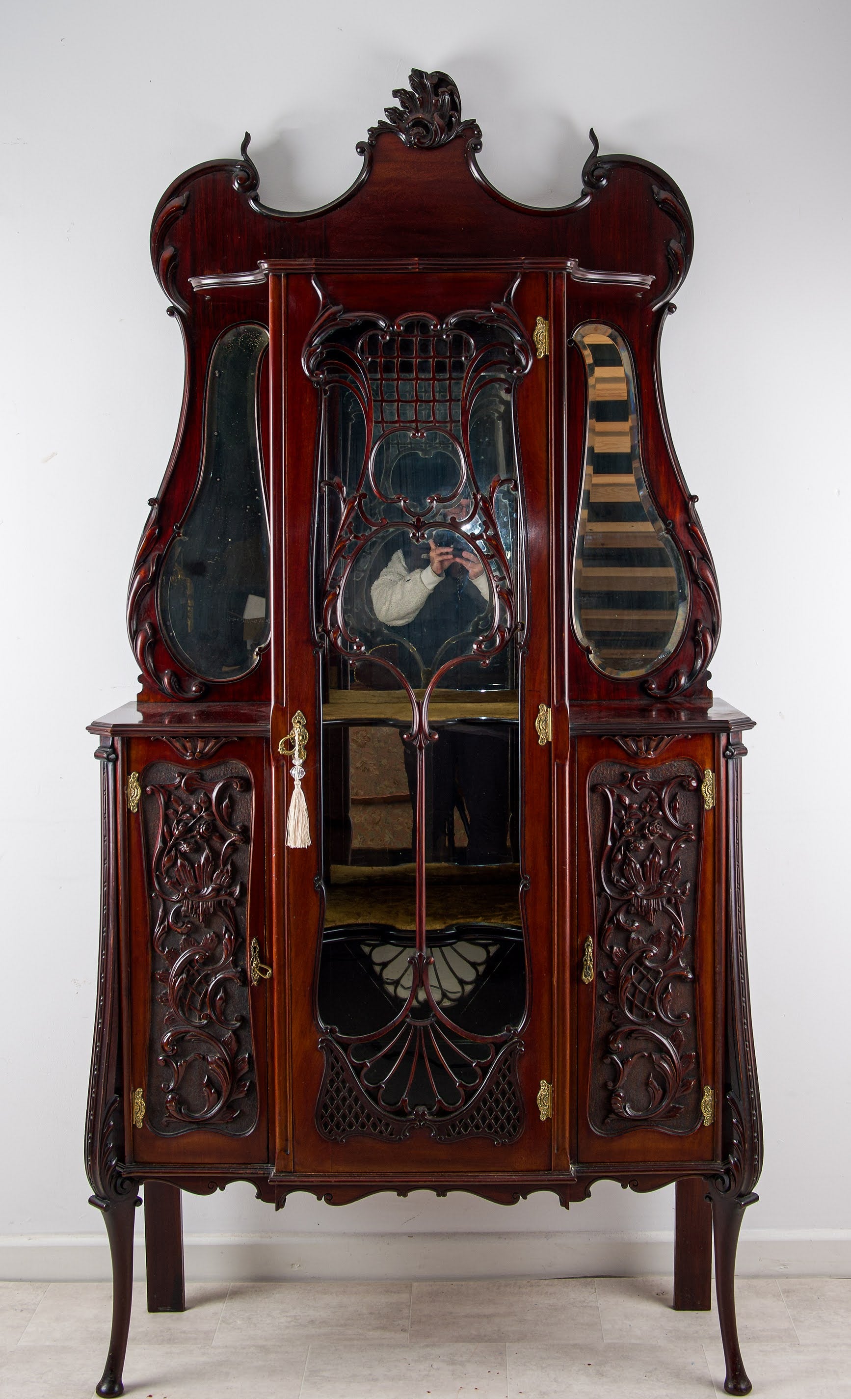 The cabinet is crafted from solid mahogany with richly carved foliate panels, elegant cabriole legs, and a striking architectural crest. The central glazed door features shaped and pierced detailing, flanked by beautifully formed mirrored side panels which enhance light and visual depth.