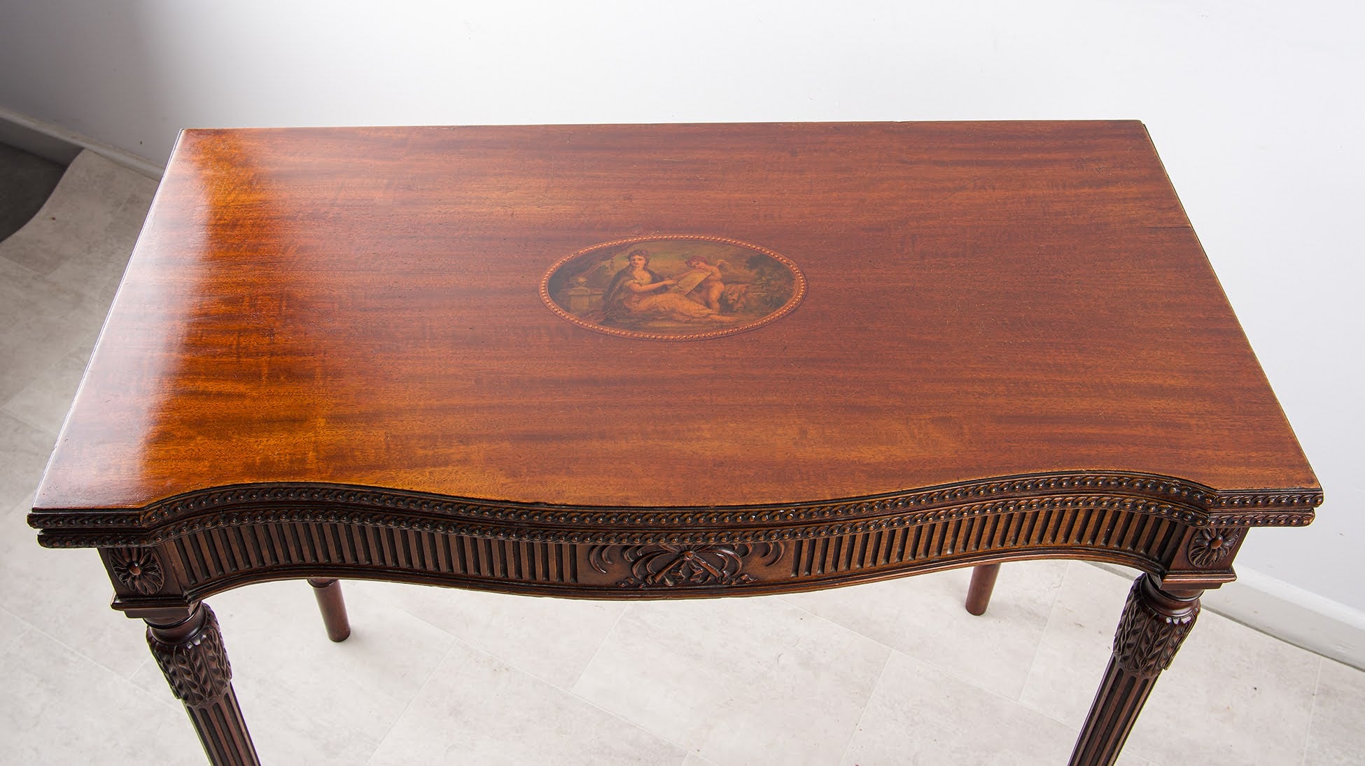 featuring a painted oval medallion of classical figures. The top opens to reveal its original green baize playing surface.