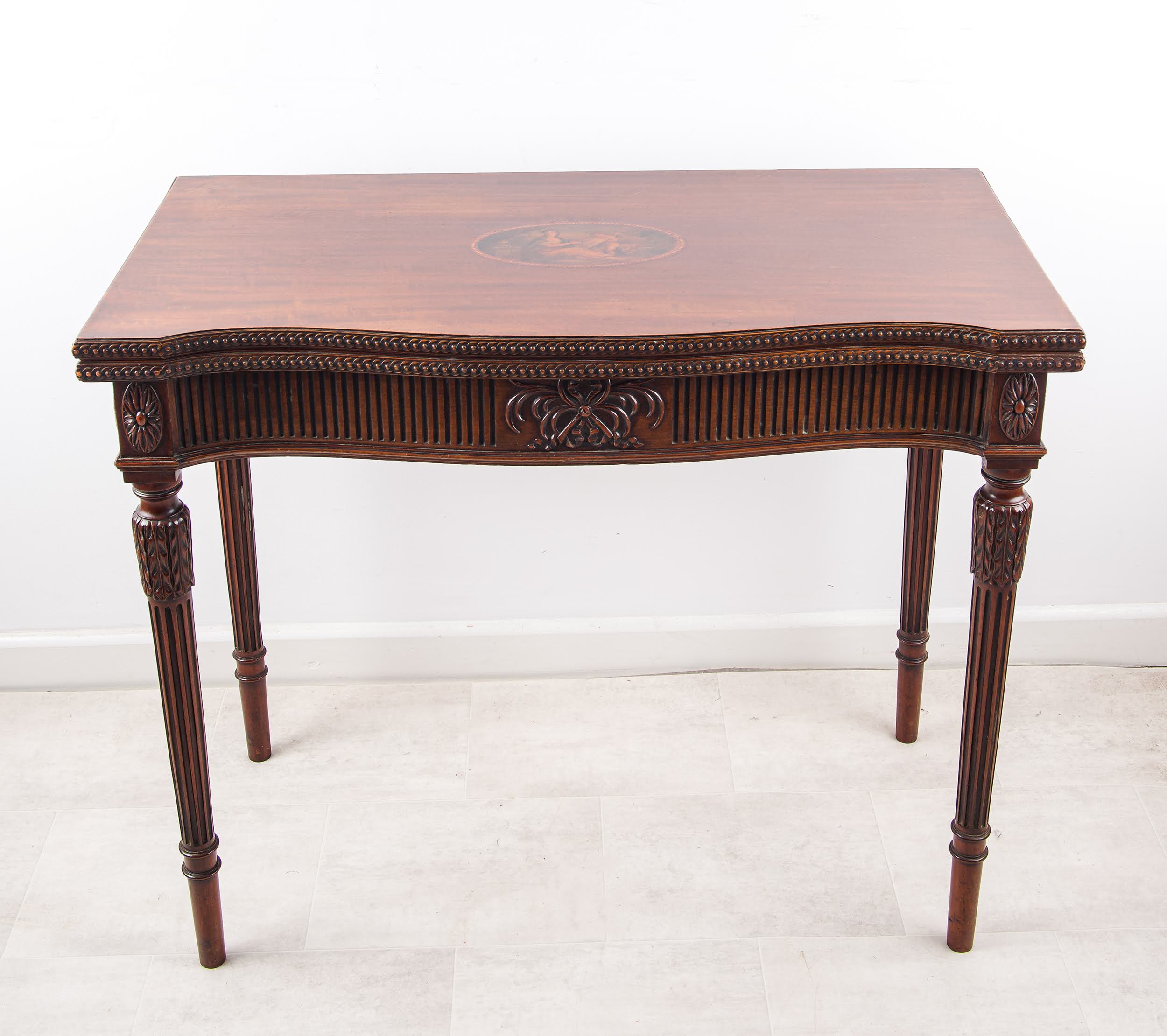 A beautiful Edwardian mahogany fold-over card table in the Hepplewhite style, dating from circa 1910. The serpentine front with finely carved fluted detail and a central bow motif, standing on elegant tapering fluted legs.