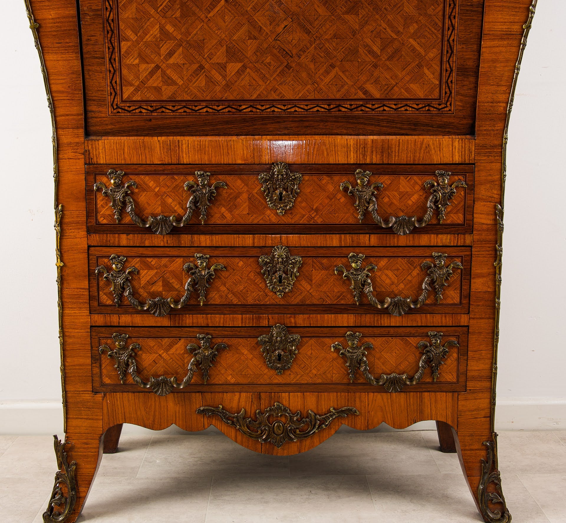 A fine quality French secrétaire abattant, dating from the late 19th to early 20th century, beautifully constructed in kingwood with intricate parquetry throughout and richly mounted with finely cast gilt bronze ormolu.