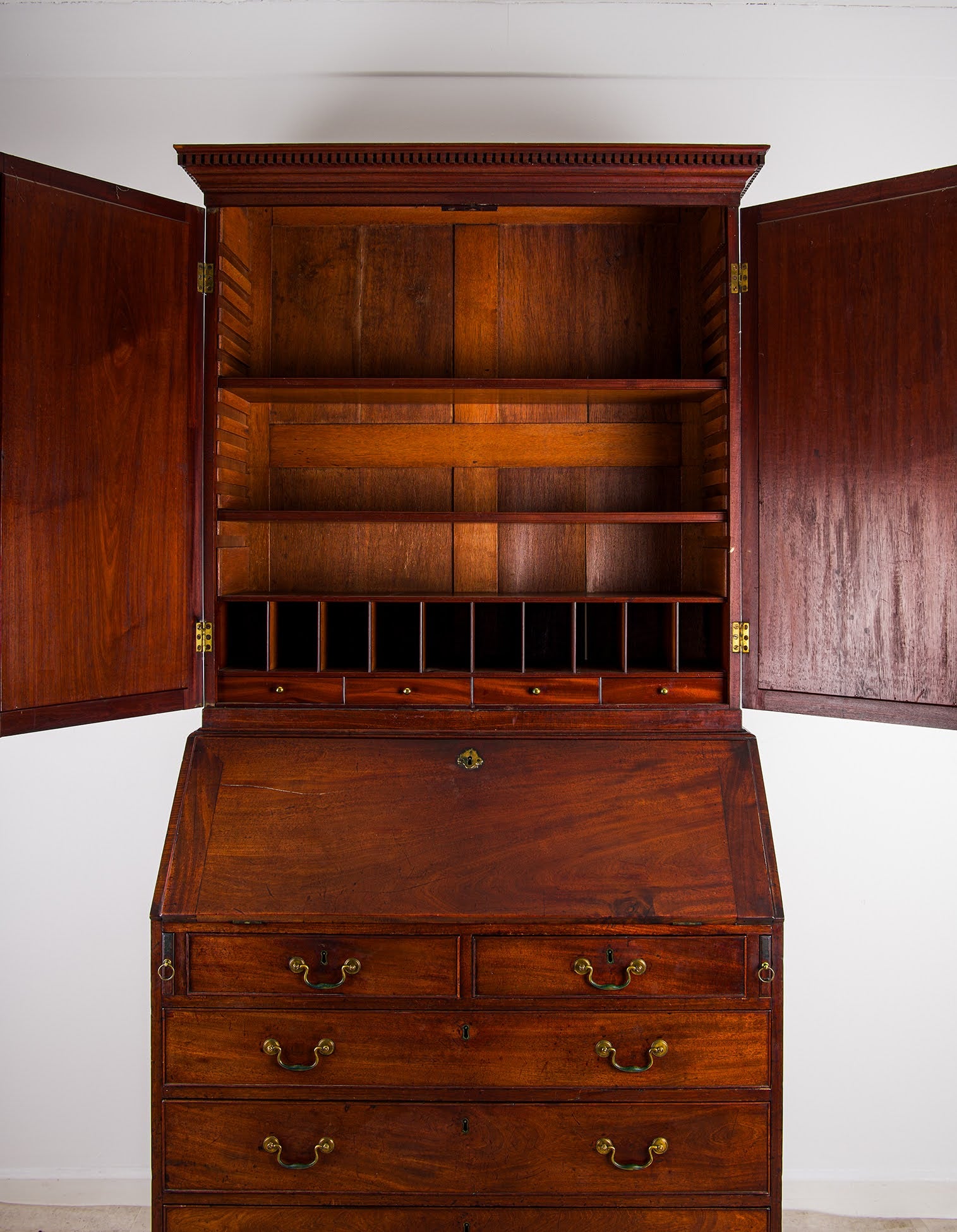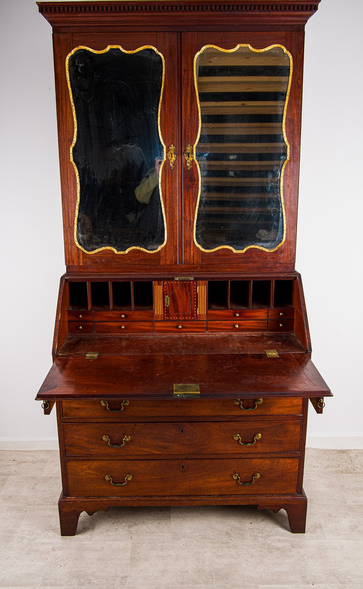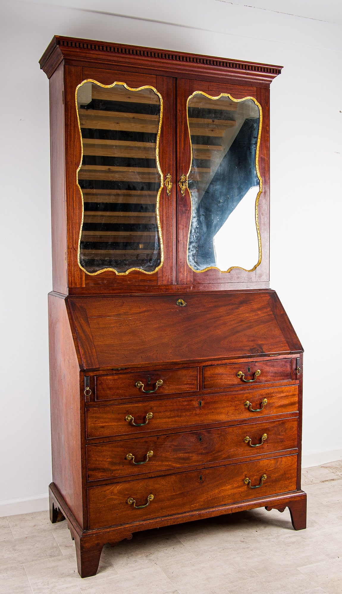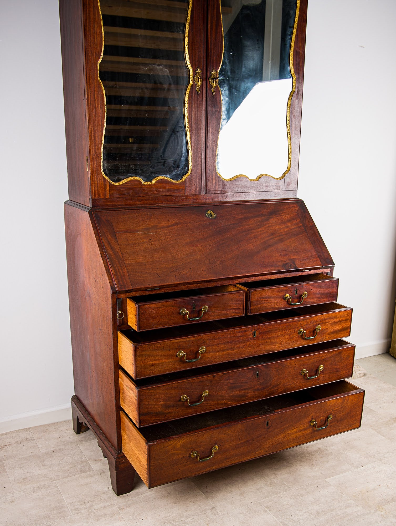 Condition Note: The bureau bookcase is in good antique condition commensurate with its age of approximately 260 years. The mahogany throughout retains a rich deep patina of genuine age - the flame-figured grain of the drawer fronts and fall front well-preserved and characterful. The dentil cornice is intact and complete. The gilded mirror door borders retain their gilding with the patina of age. The fitted interior is complete - all pigeonholes, small drawers and the central cupboard present and functional. The fall front opens and closes correctly on its brass quadrant stays. The five base drawers run smoothly. The brass handles and escutcheons are in good order. The bracket feet are sound. There is honest wear and patination consistent with a piece of this age - exactly what one expects and values in genuine 18th century furniture. An honest description from a specialist dealer with 60+ years of family experience.