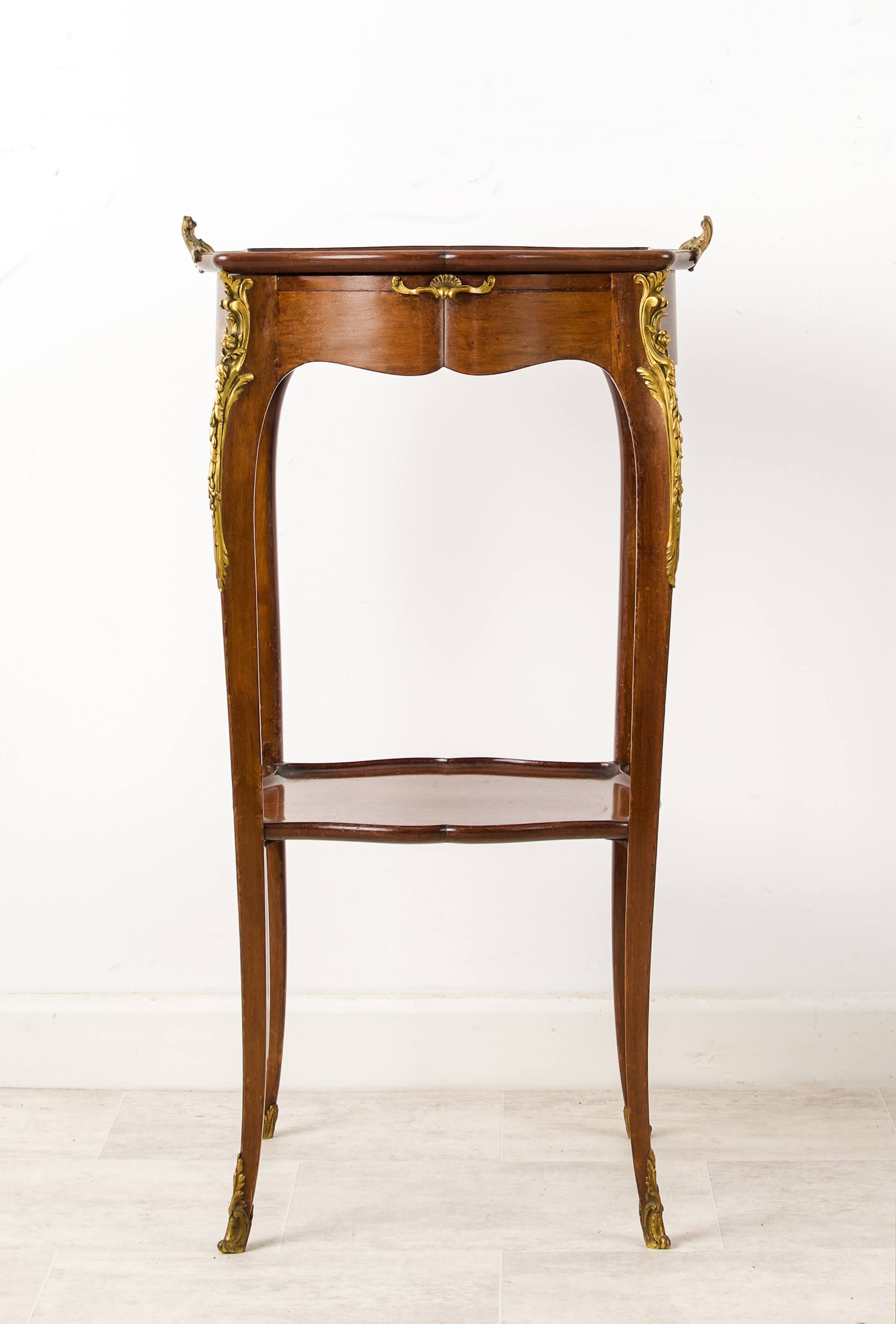 The table is raised on four slender cabriole legs, each enriched with crisply detailed gilt-bronze mounts terminating in decorative sabots. A discreetly contoured frieze houses a single drawer, fitted with its original ormolu handle, adding both functionality and refinement to the design.
