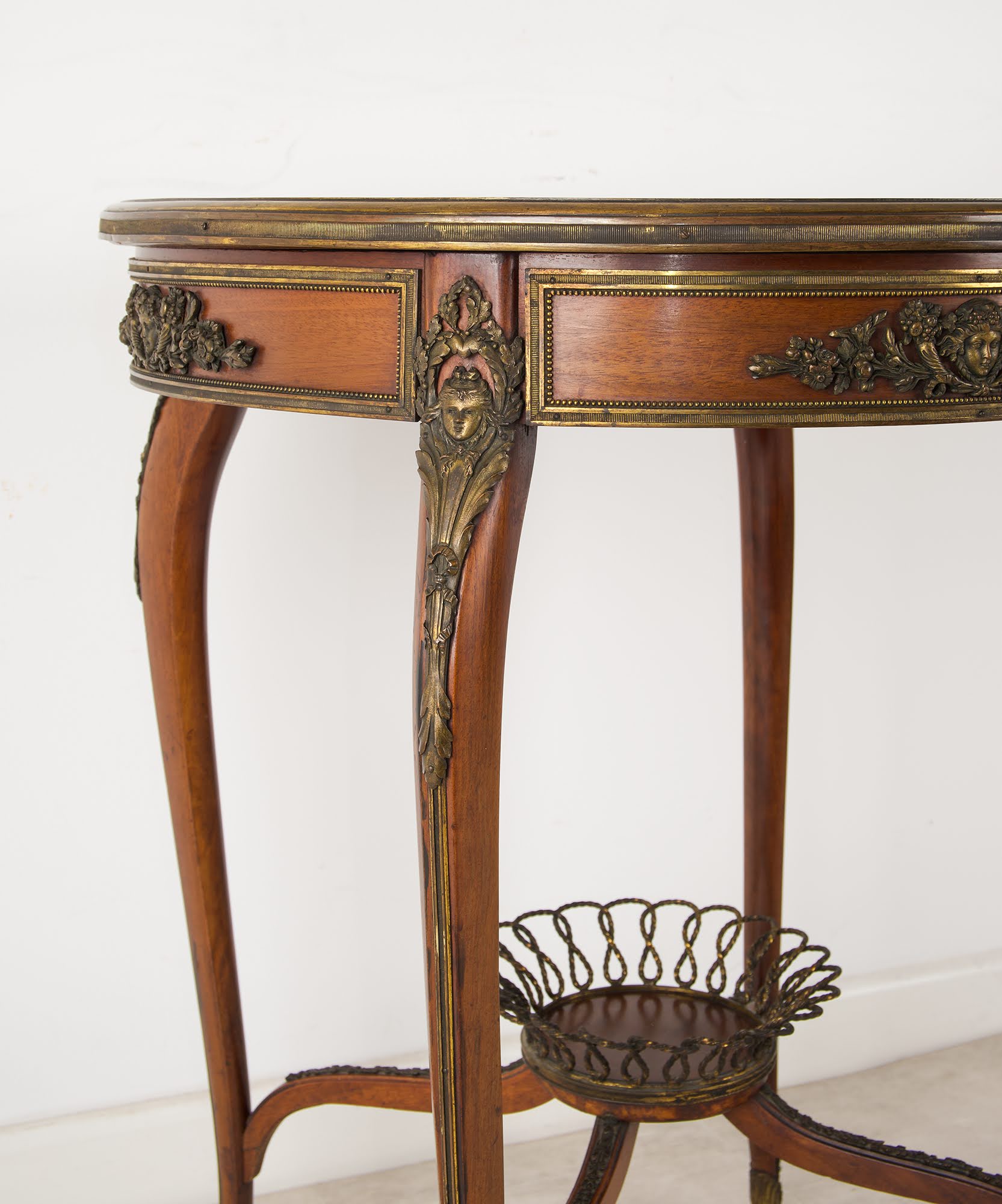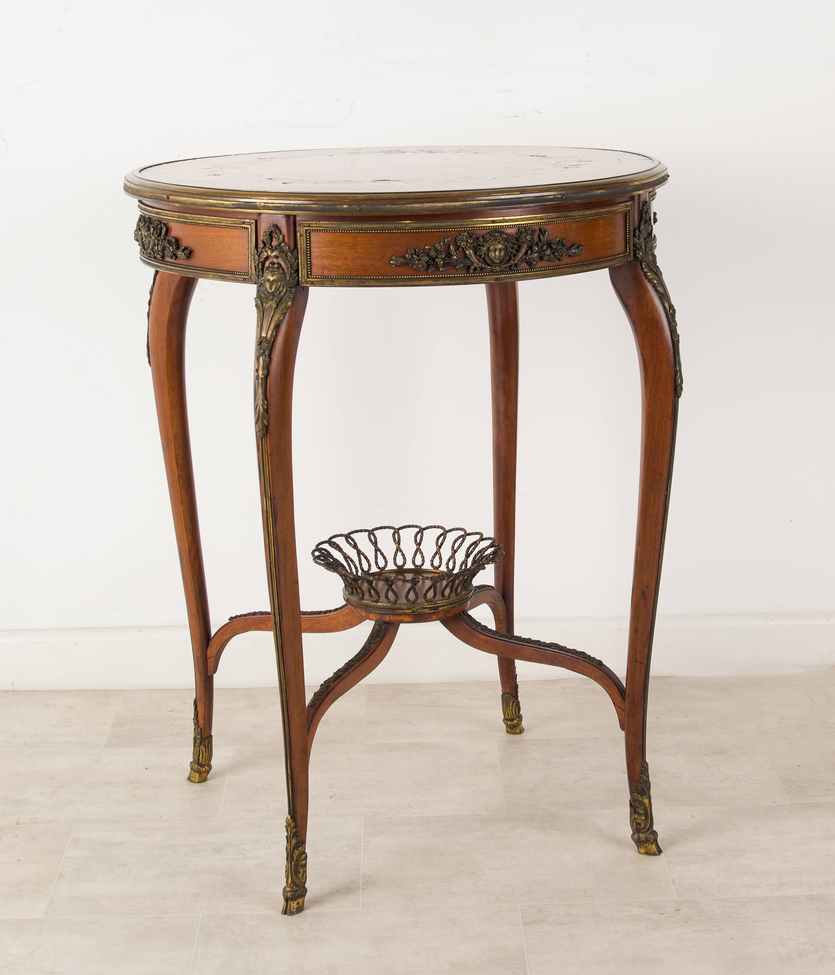 The table stands on four gracefully shaped cabriole legs, each adorned with finely cast gilt-bronze mounts, terminating in decorative sabots. The legs are united by a shaped undertier stretcher, centred by an ornate pierced brass gallery basket - a sophisticated feature often found on high-quality furniture in the style of François Linke.