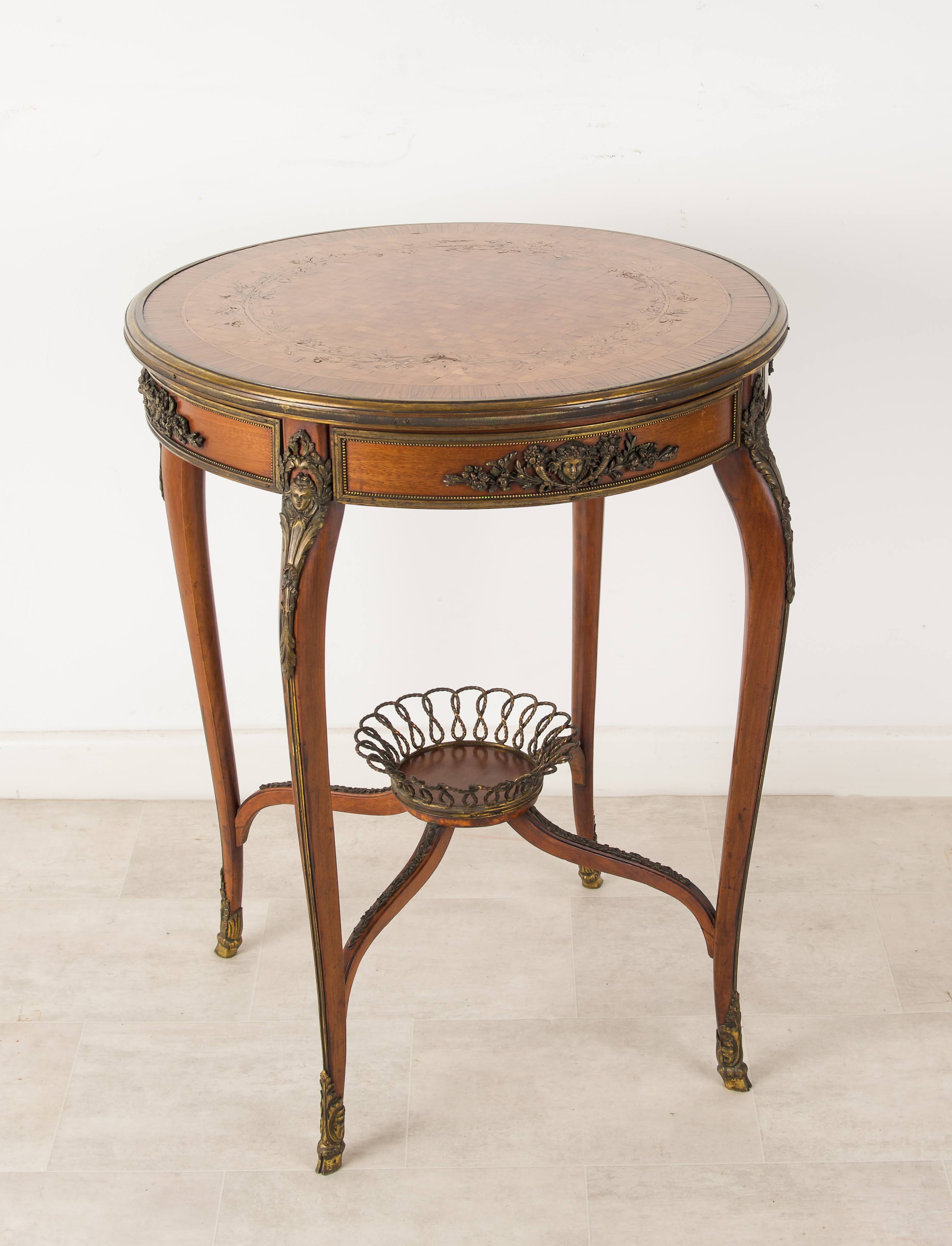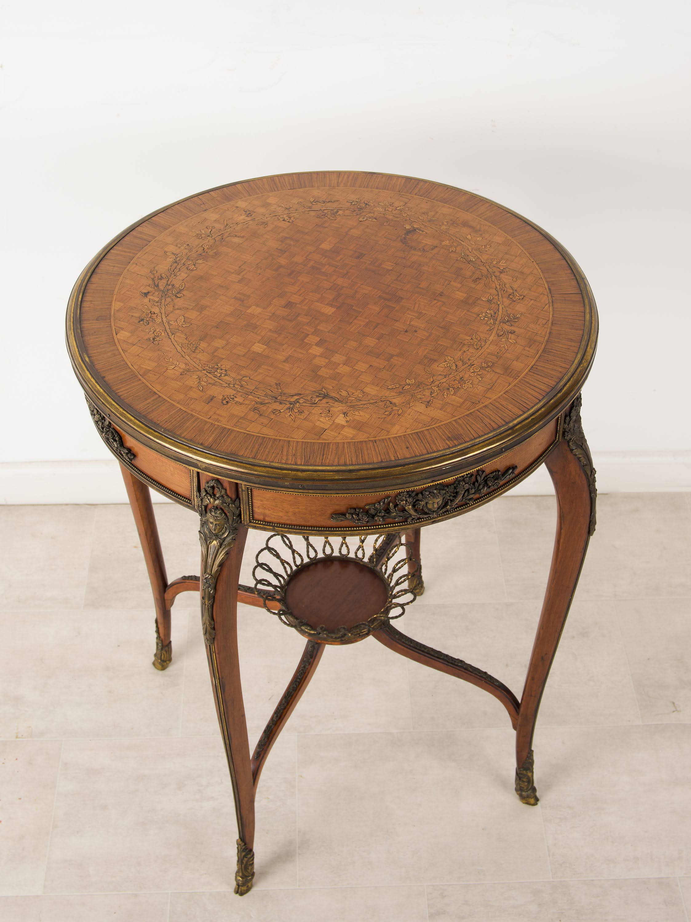 A beautiful late 19th-century French kingwood round side table, crafted in the manner of François Linke, and finely inlaid with parquetry, accented by elegant brass banding. The circular top displays intricate parquetry work framed by a gilt-edged rim, reflecting the exceptional quality and refined taste associated with Linke-inspired Parisian furniture of the period.