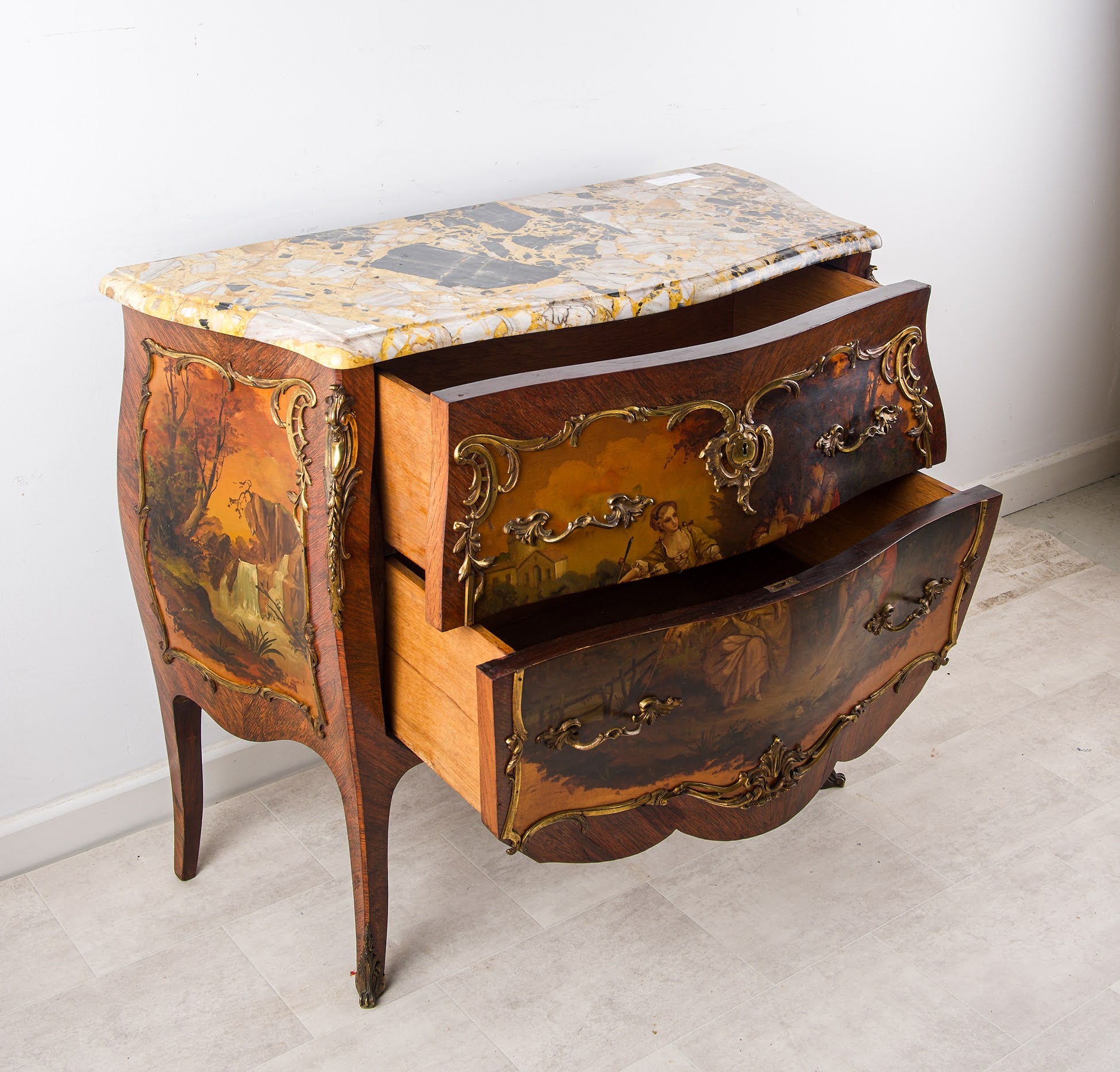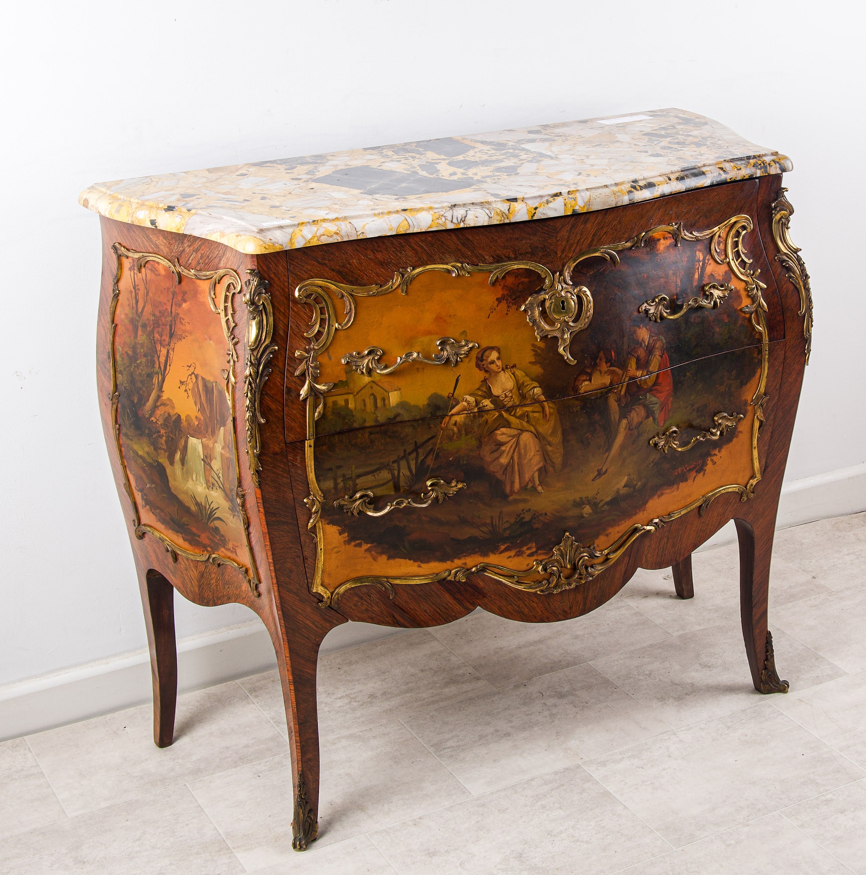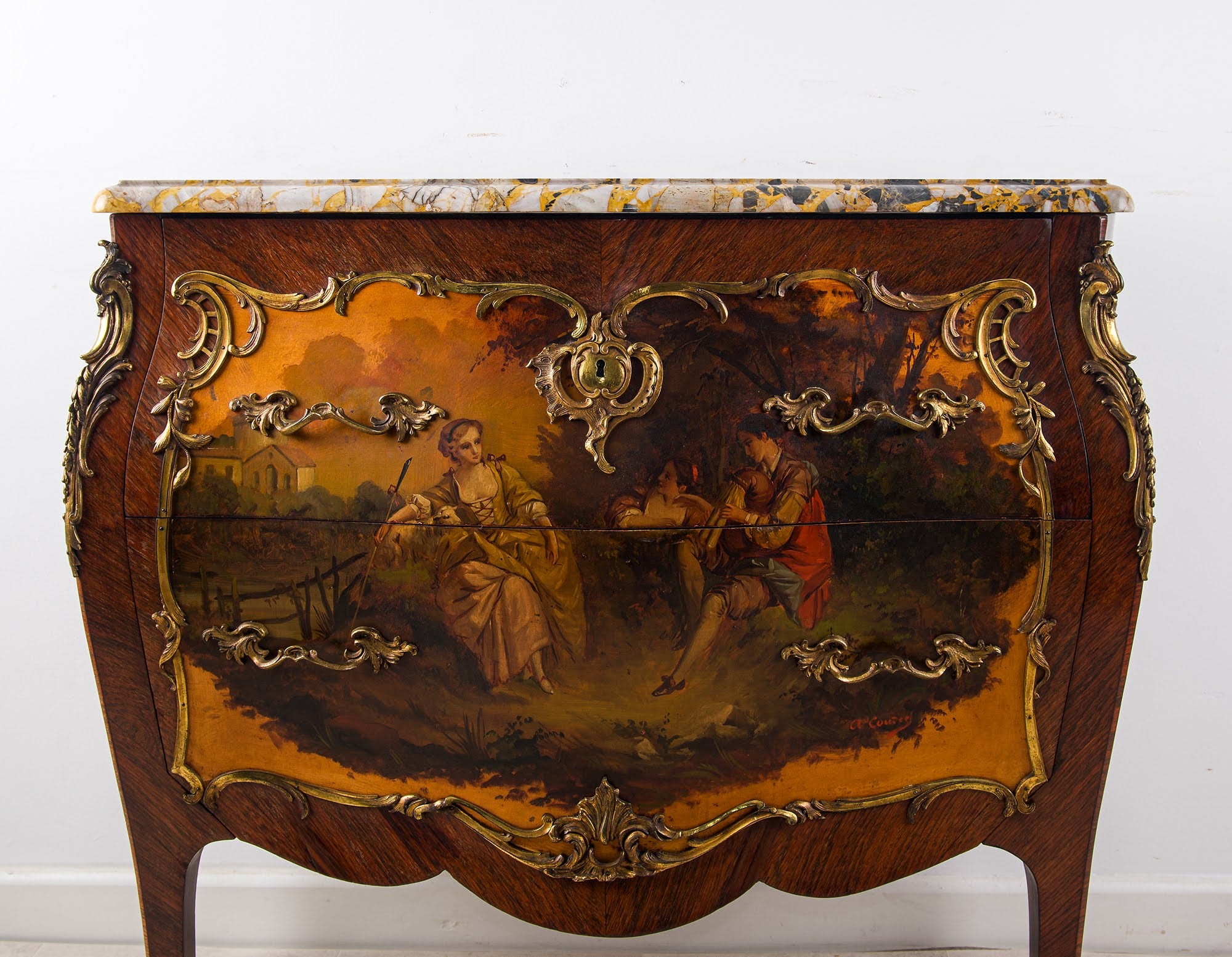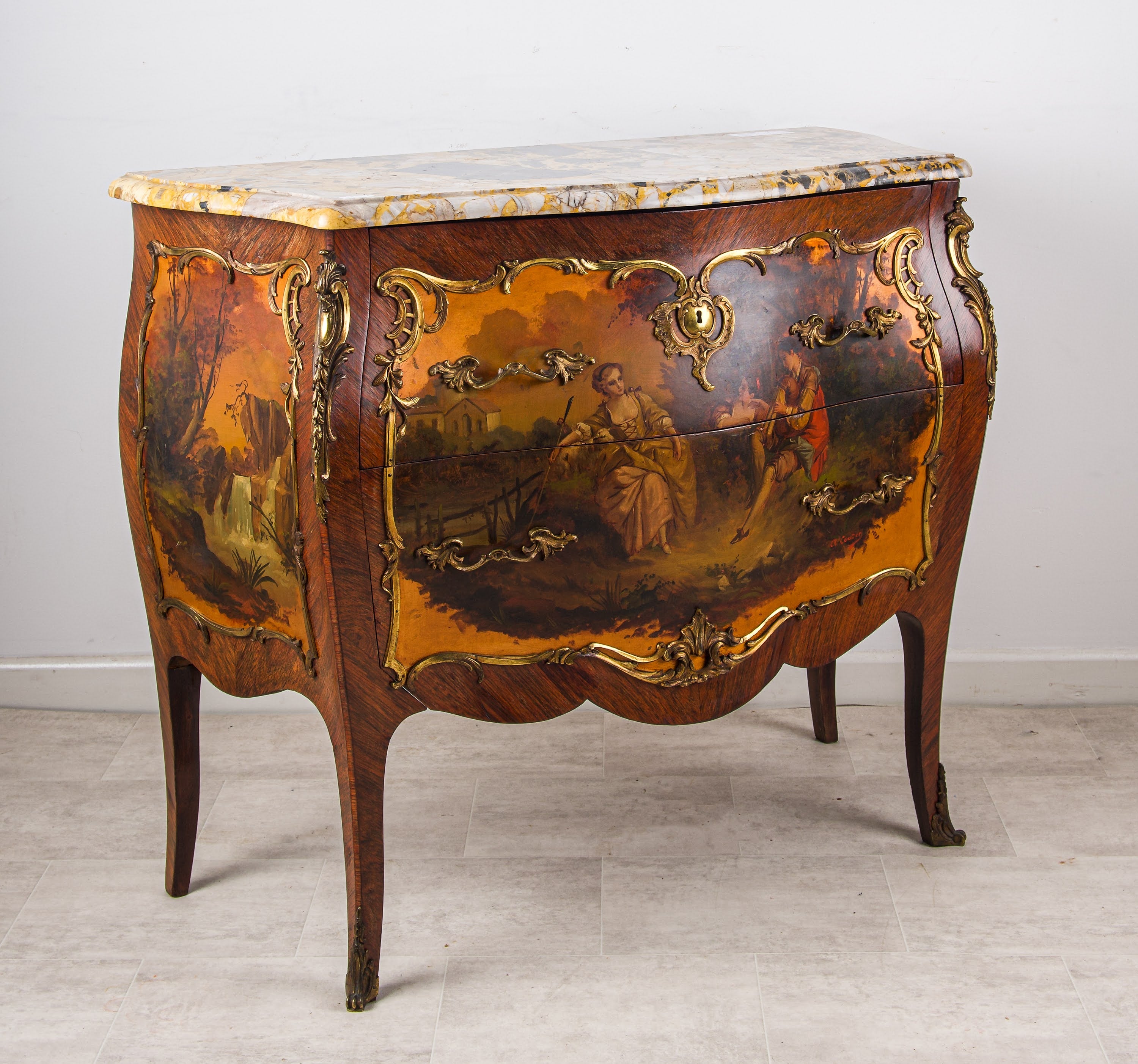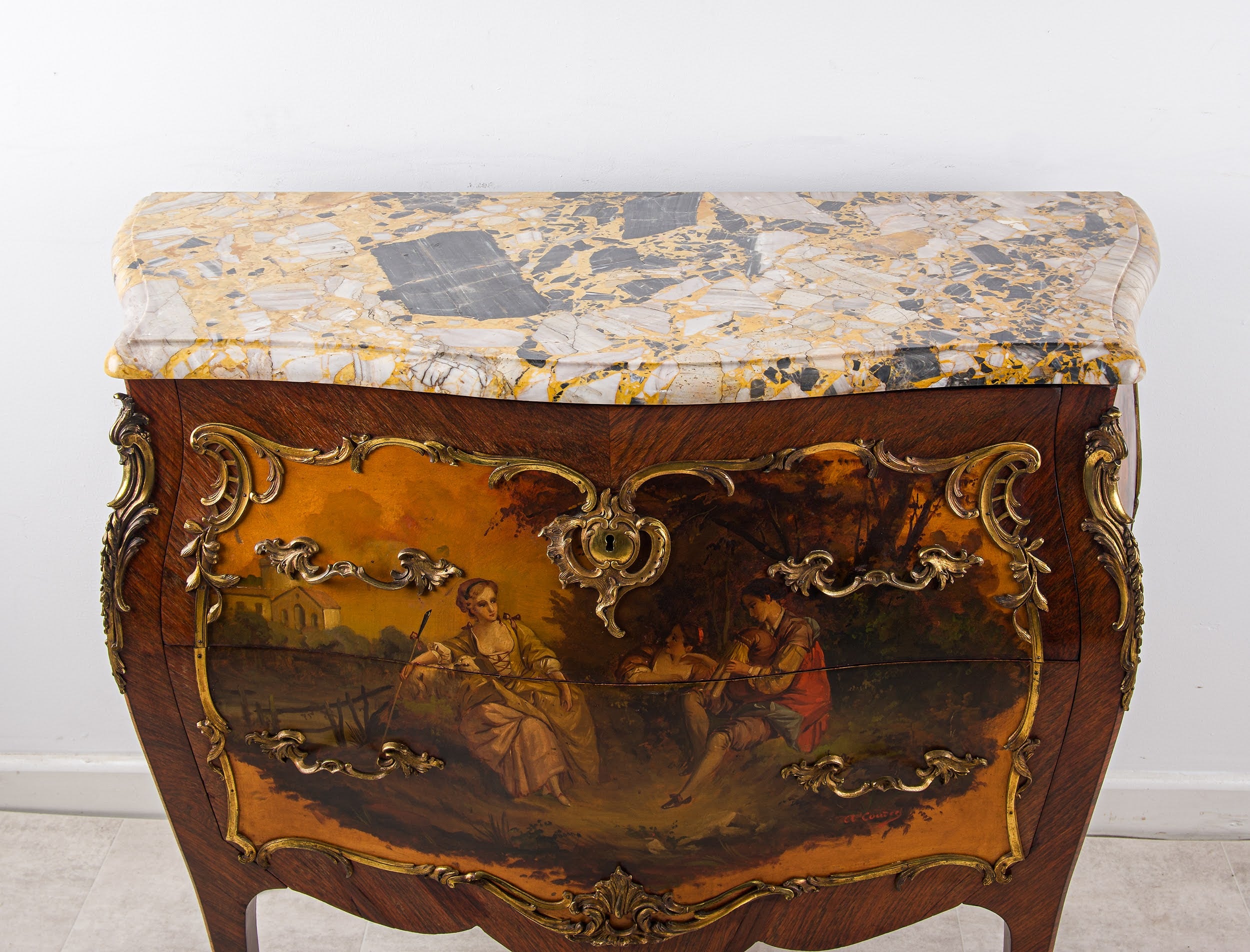 The serpentine bombe form supports an original breccia marble top above two long drawers. The drawers and sides are adorned with finely painted Vernis Martin pastoral panels framed by elaborate rococo ormolu mounts.