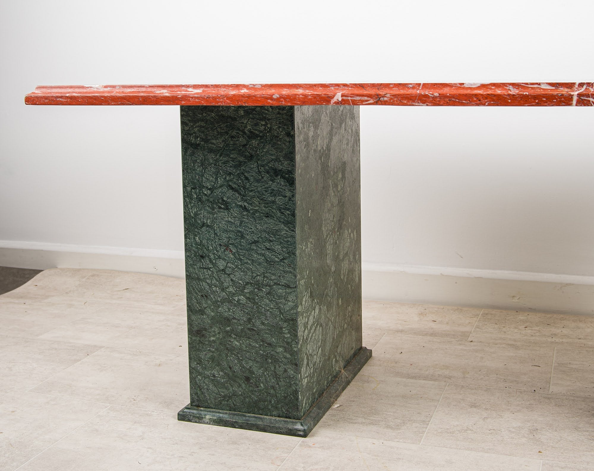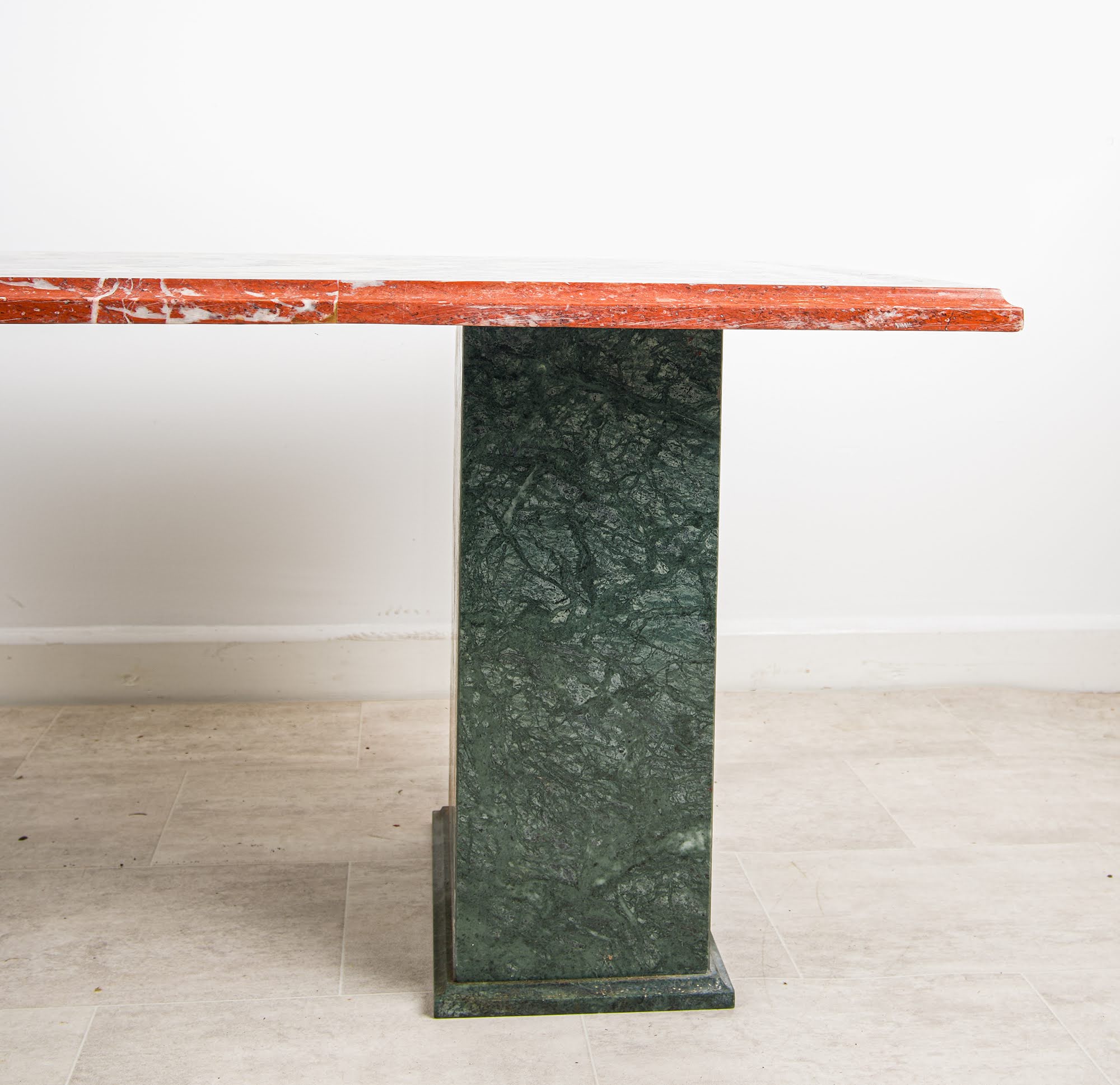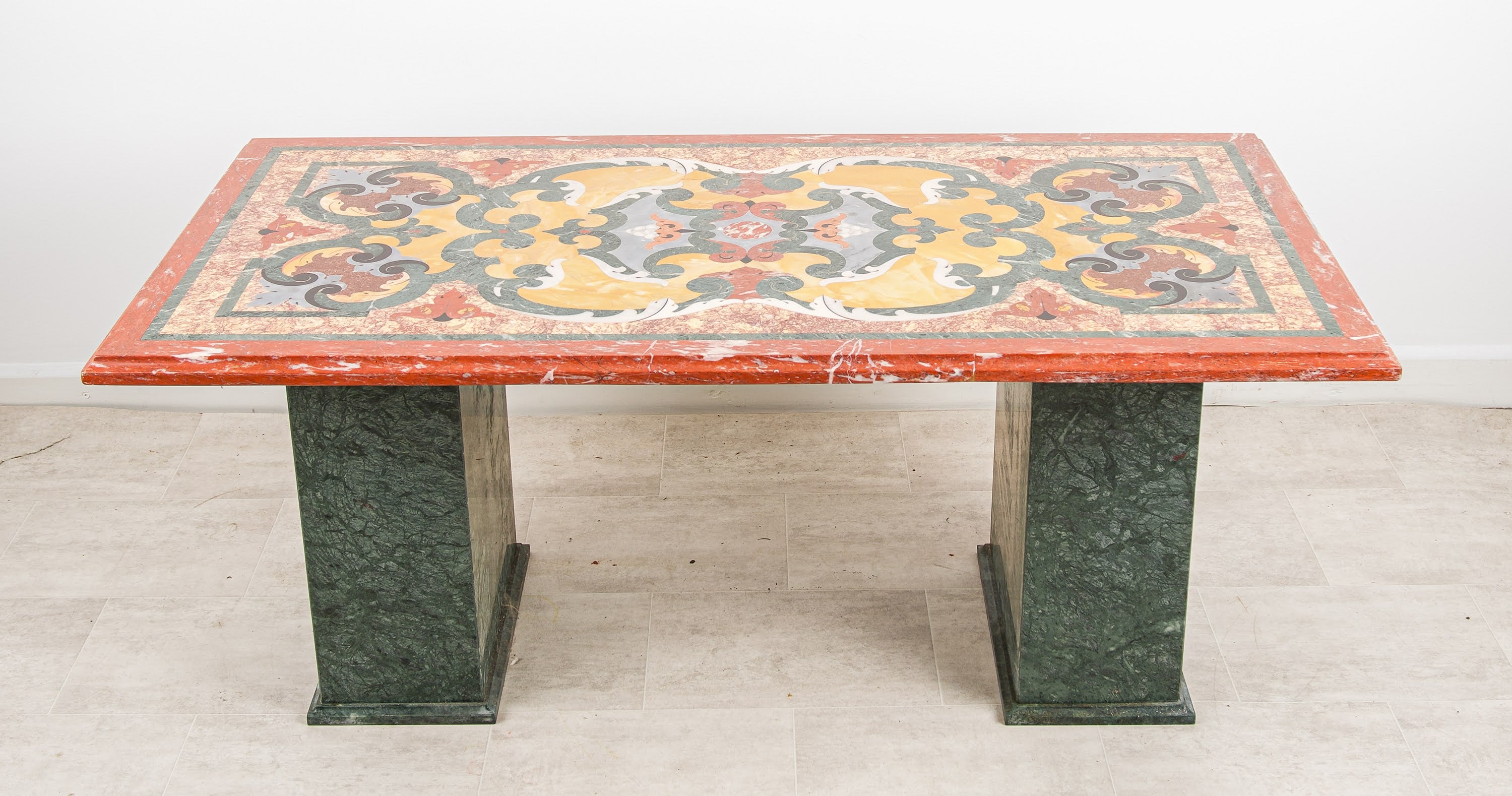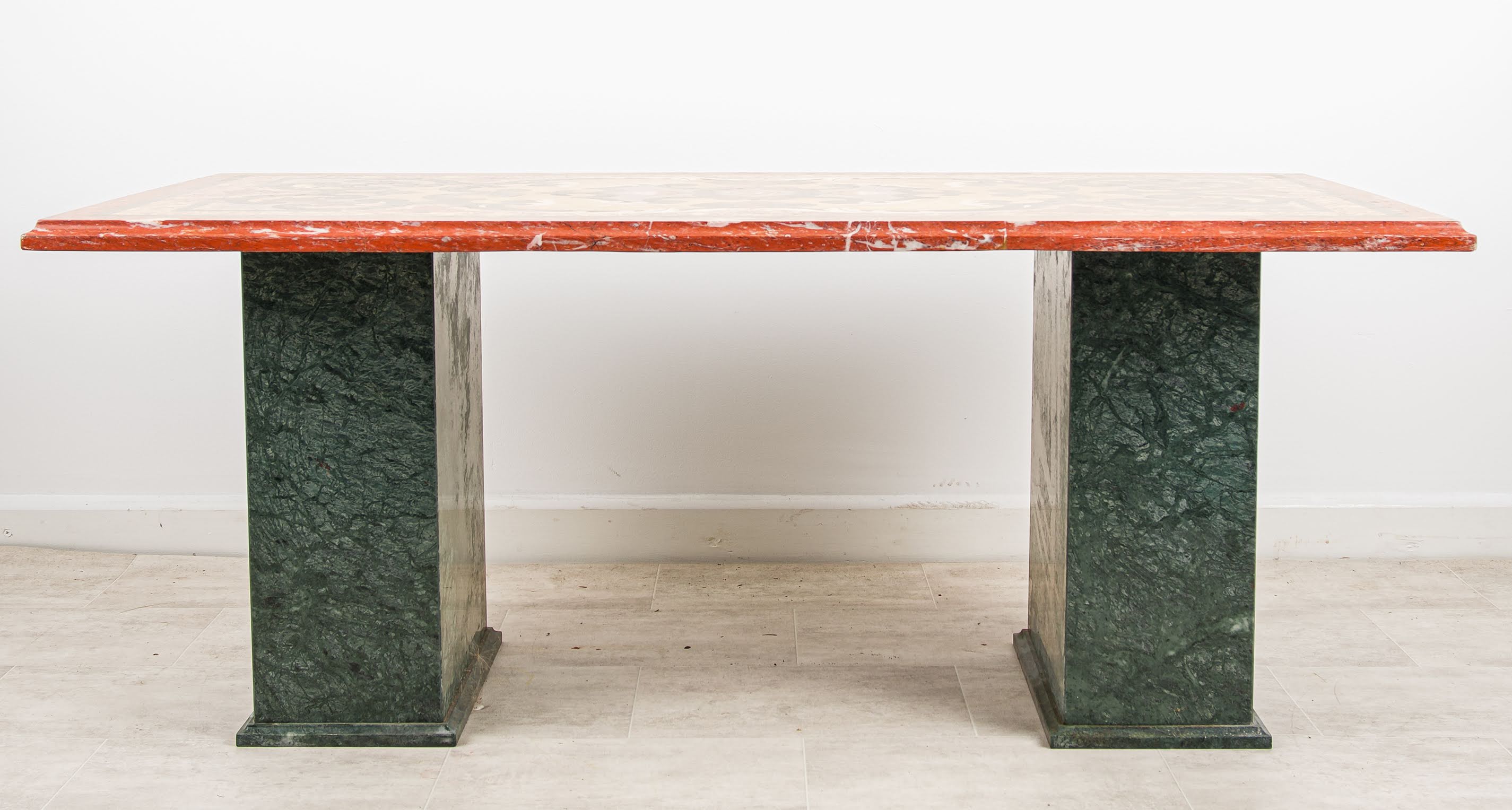 Condition Note: The table is in good vintage condition commensurate with its age. The marble inlay top is intact with all pieces present and the composition complete. The polished red marble edge retains its colour and character. The twin green marble pedestal bases are sound and stable throughout. As with all pieces of this age and material, there is honest wear consistent with use - minor surface marks and the natural patination of old marble that add to rather than detract from the character of the piece. An honest description from a specialist dealer with 60+ years of family experience.