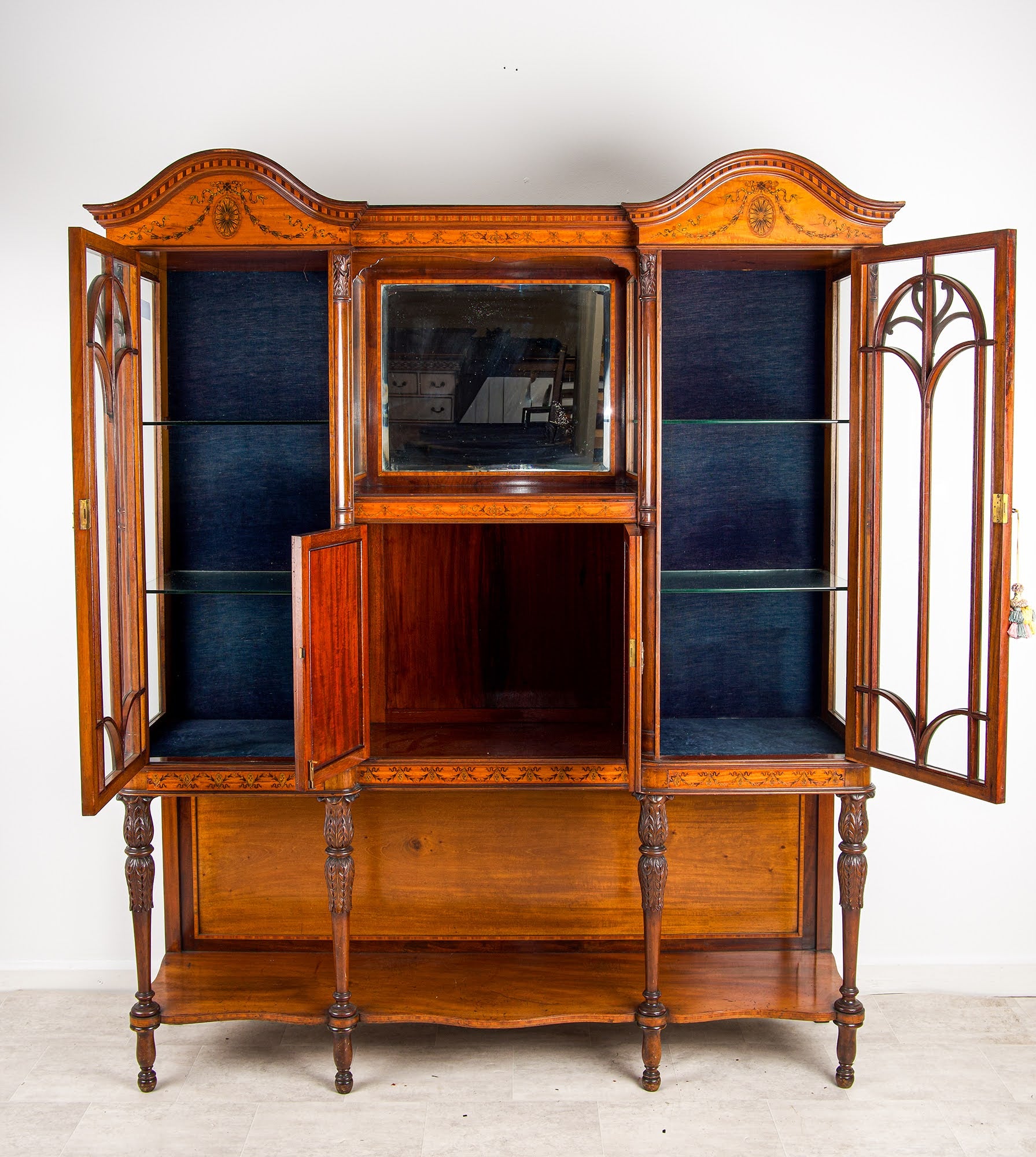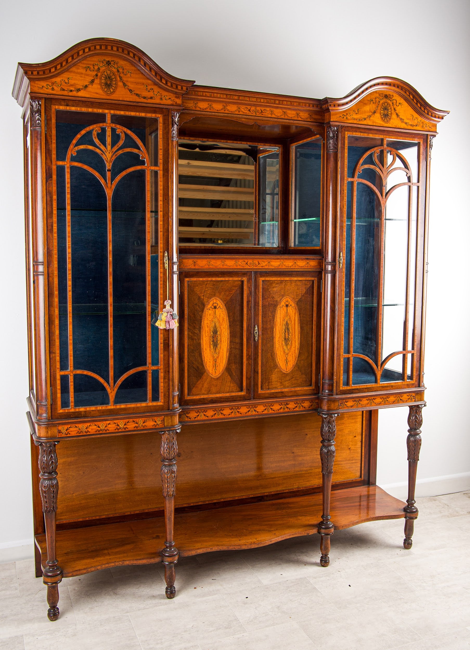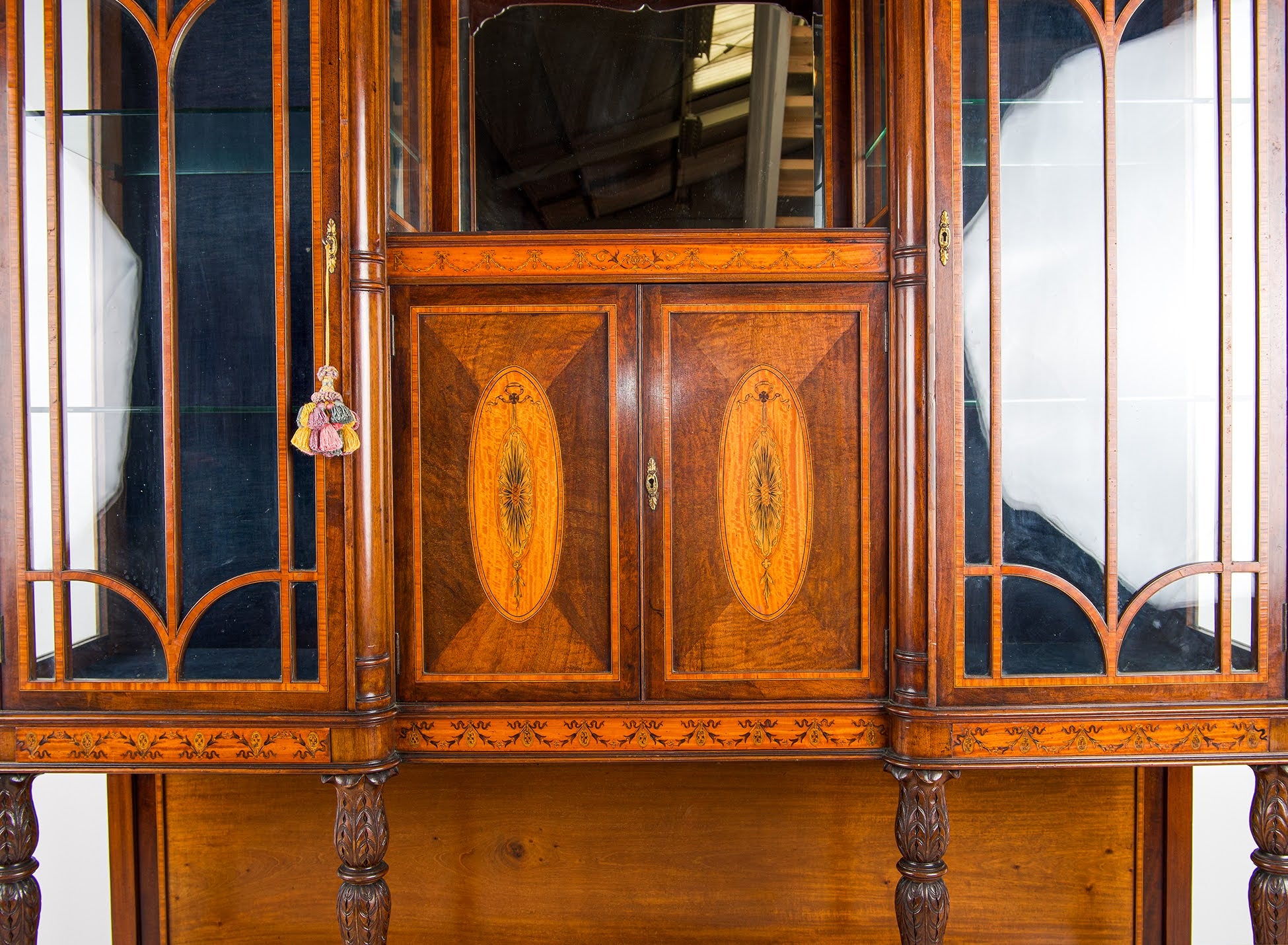 The cabinet is beautifully constructed in rich mahogany with contrasting satinwood inlay, featuring elegant marquetry panels, oval paterae, and finely detailed decorative banding throughout. The upper section comprises two glazed display cabinets with shaped glazing bars, flanking a central mirrored compartment, ideal for showcasing decorative objects, antiques, or collections.