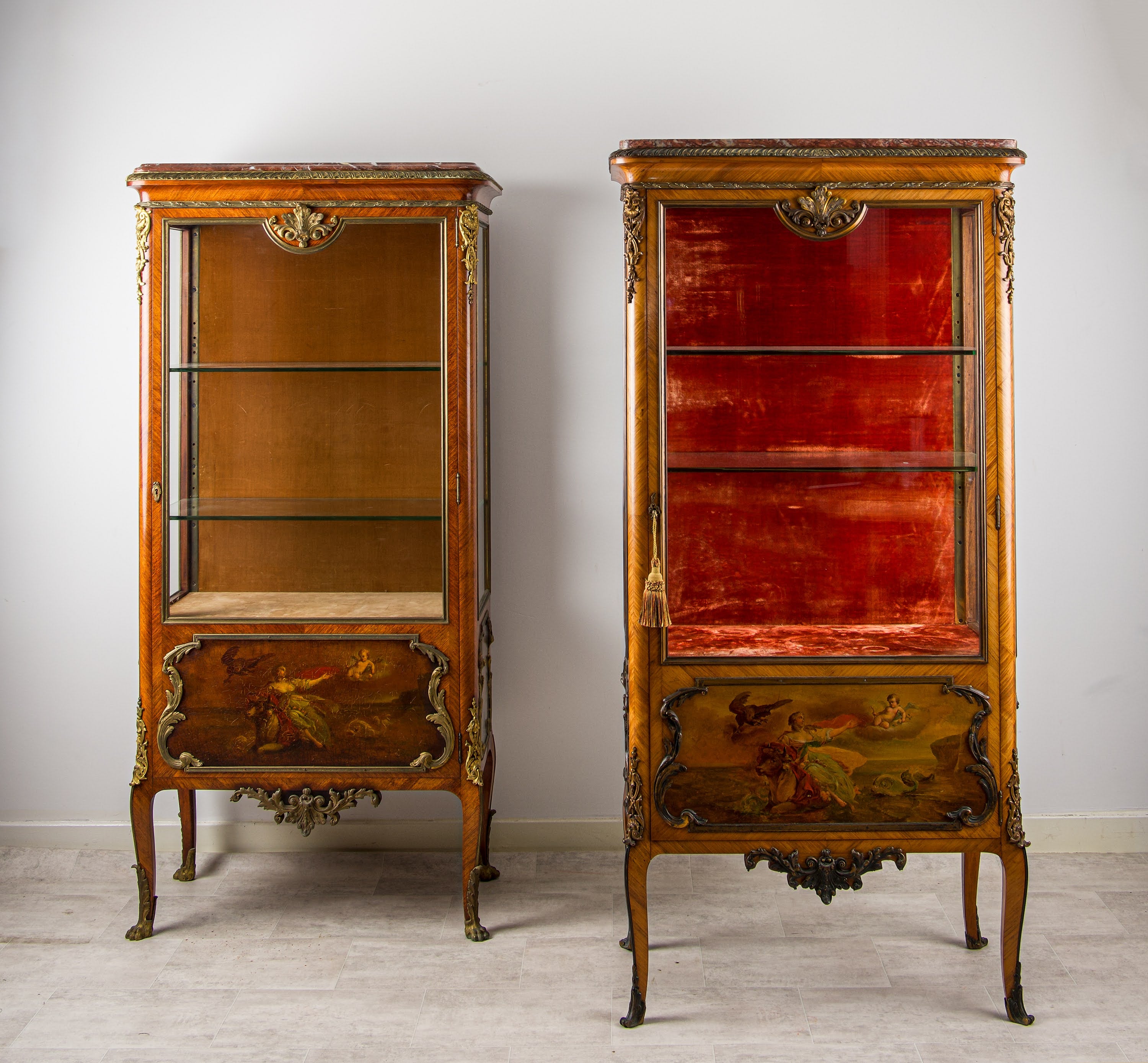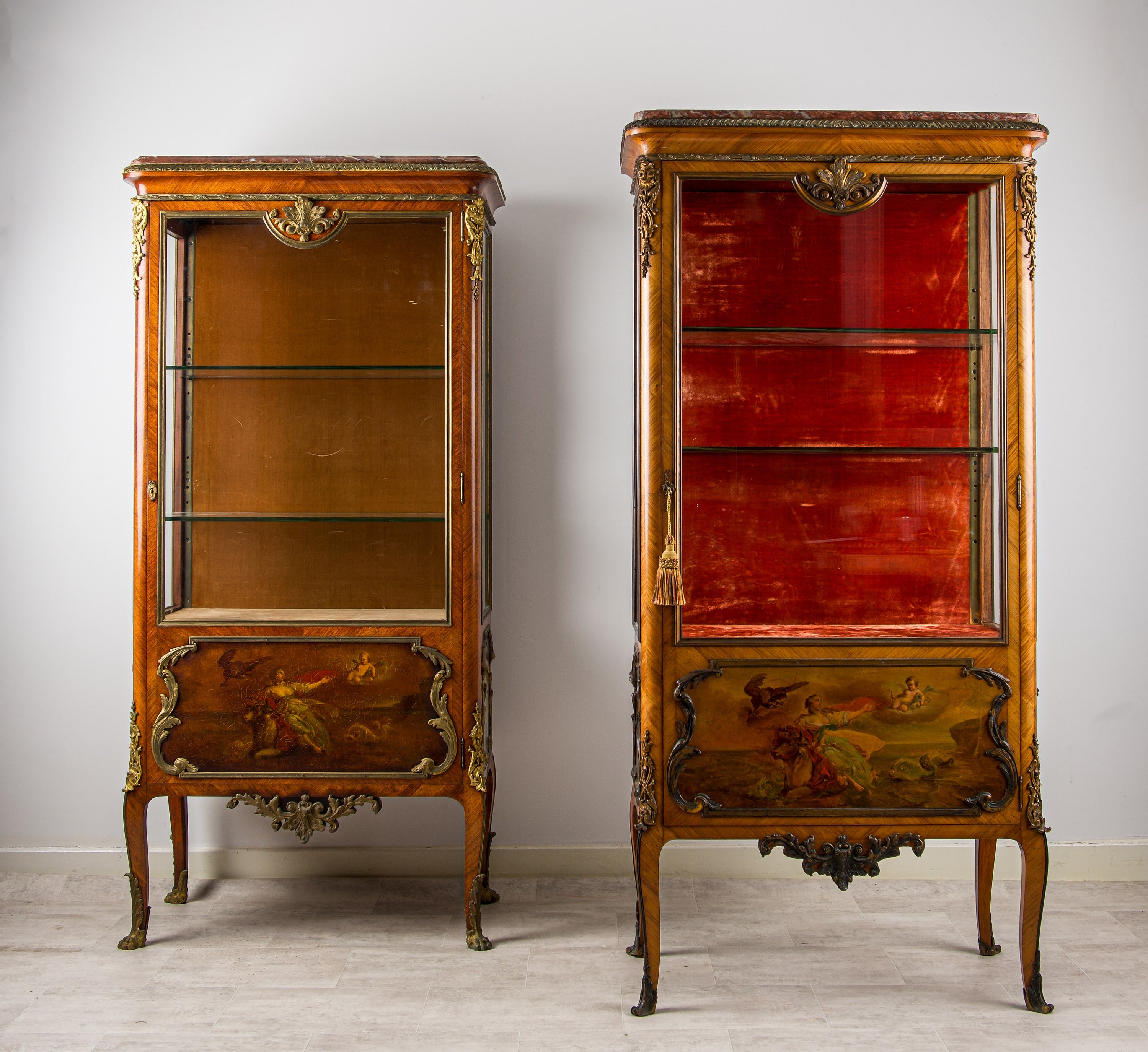 Pair of Matched French Kingwood Vernis Martin Vitrine Cabinets with Marble Tops & Ormolu, c.1880