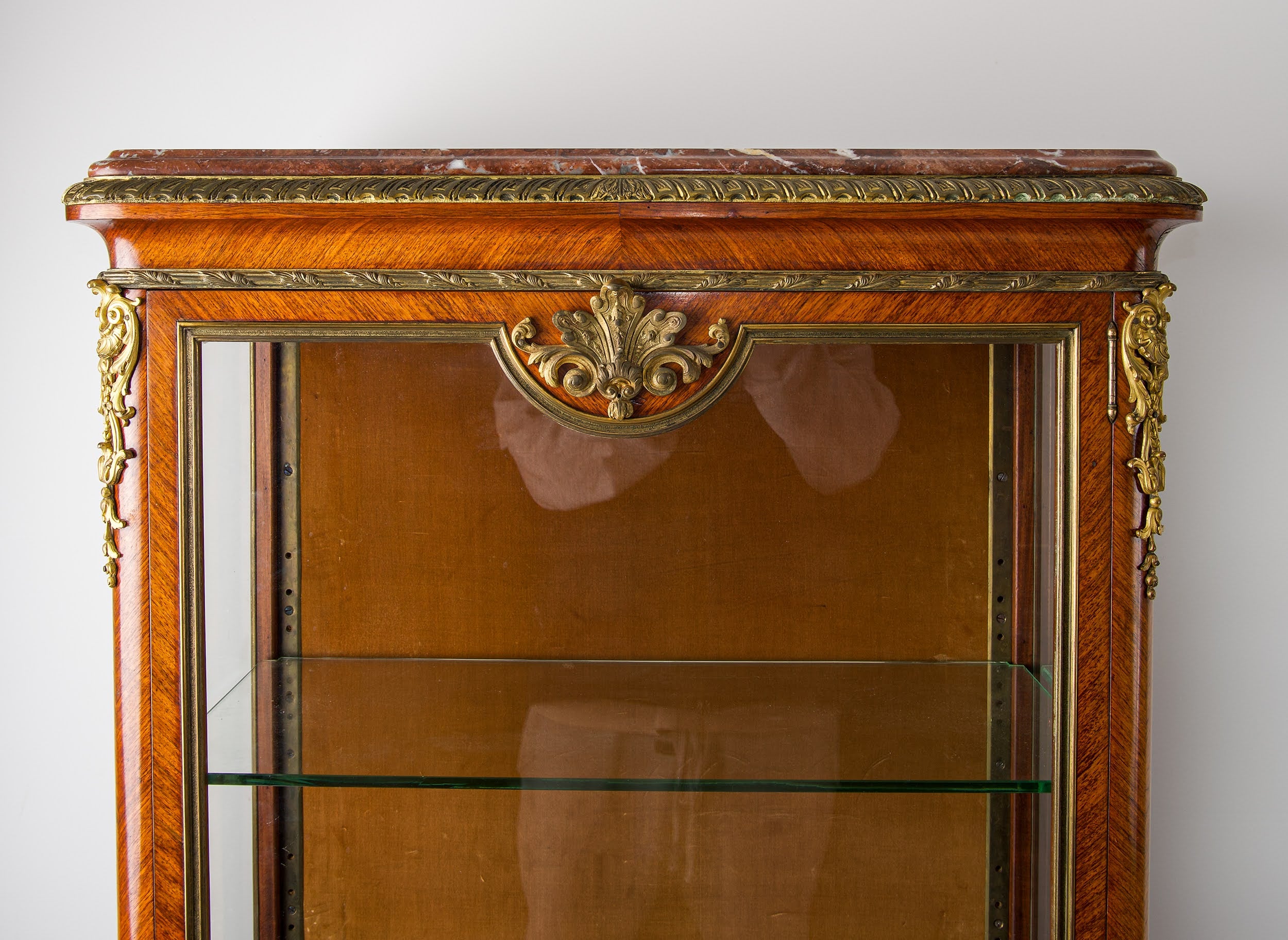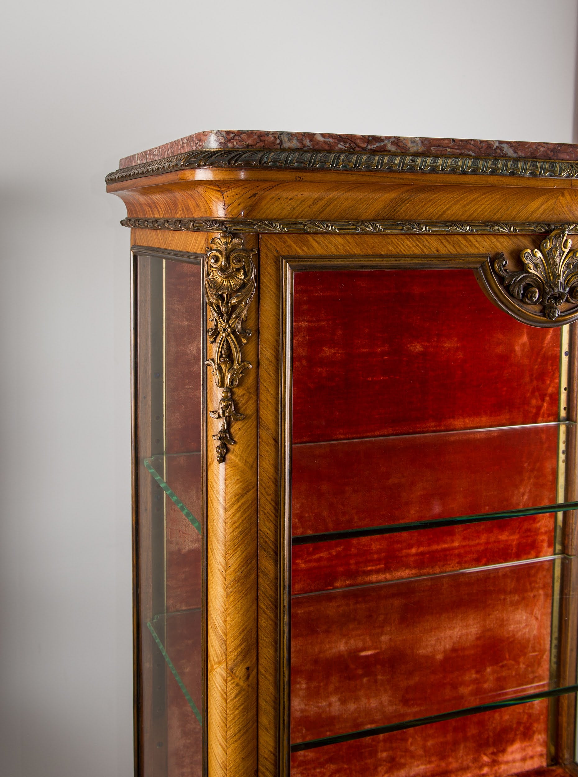 A superb matched pair of French kingwood vitrines, richly mounted with gilt bronze (ormolu) and crowned with elegant marble tops, circa 1880. Each cabinet features full glazing with glazed sides and glass display shelves, creating a refined showcase for porcelain, sculpture, objets d’art or treasured collections.
