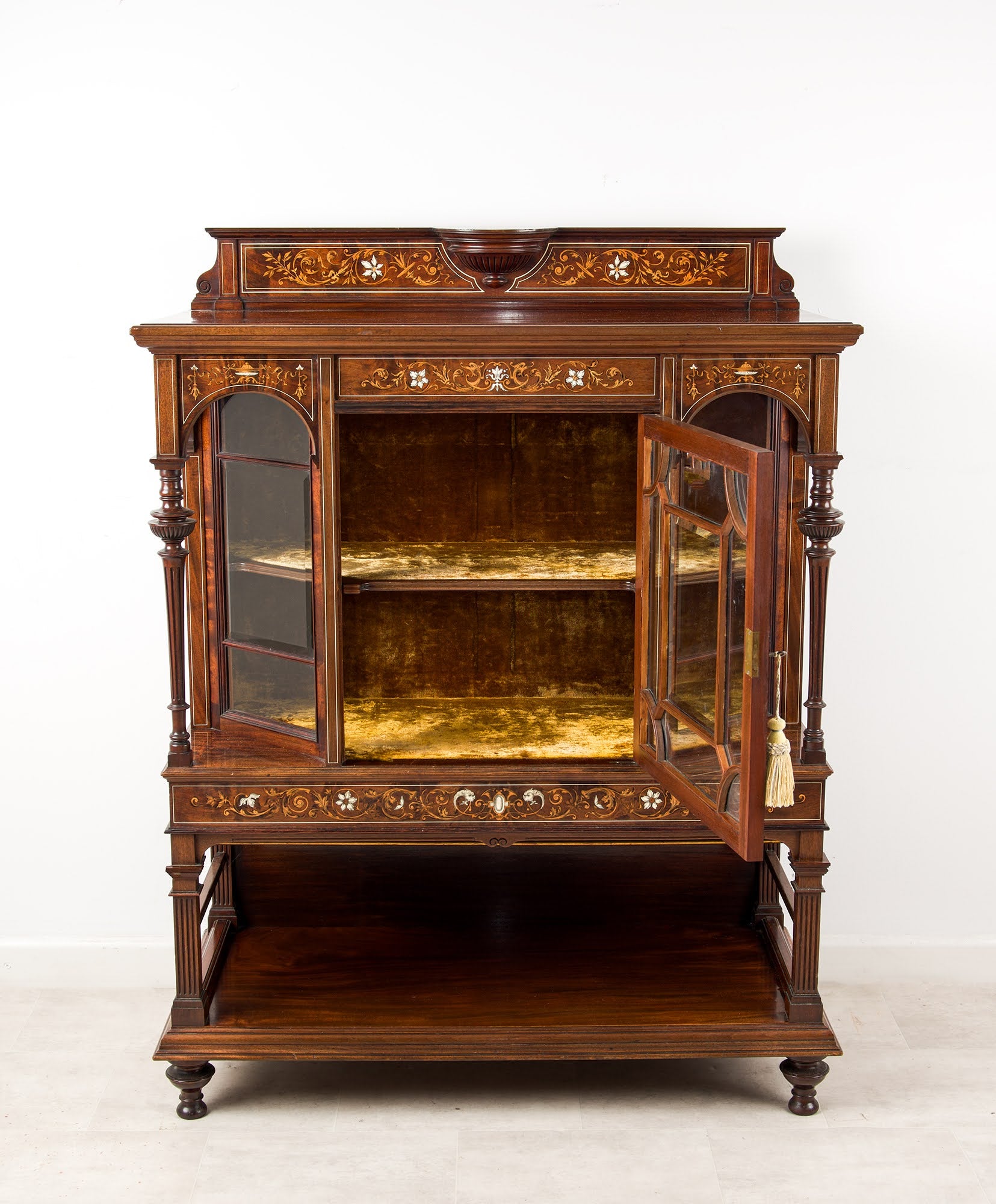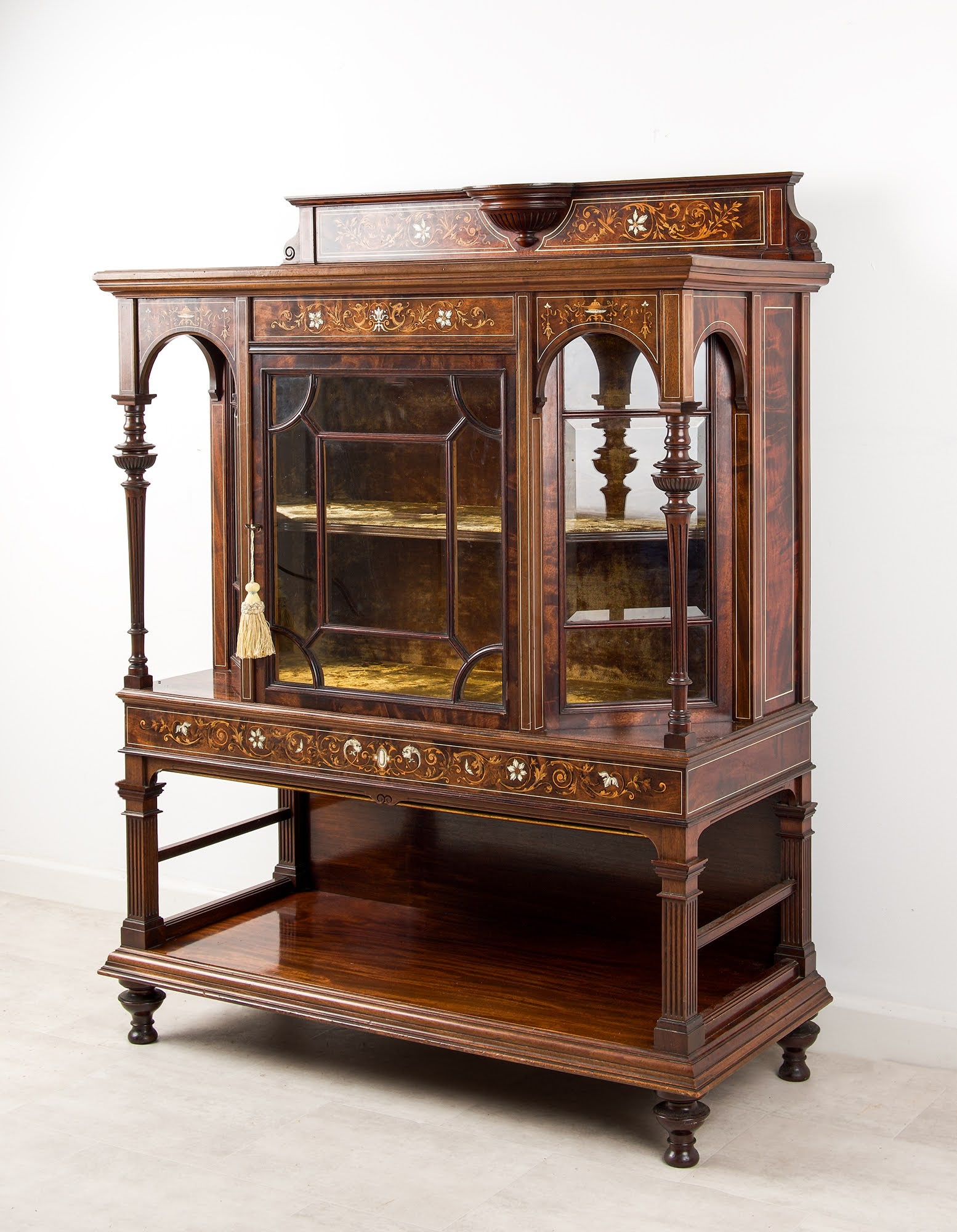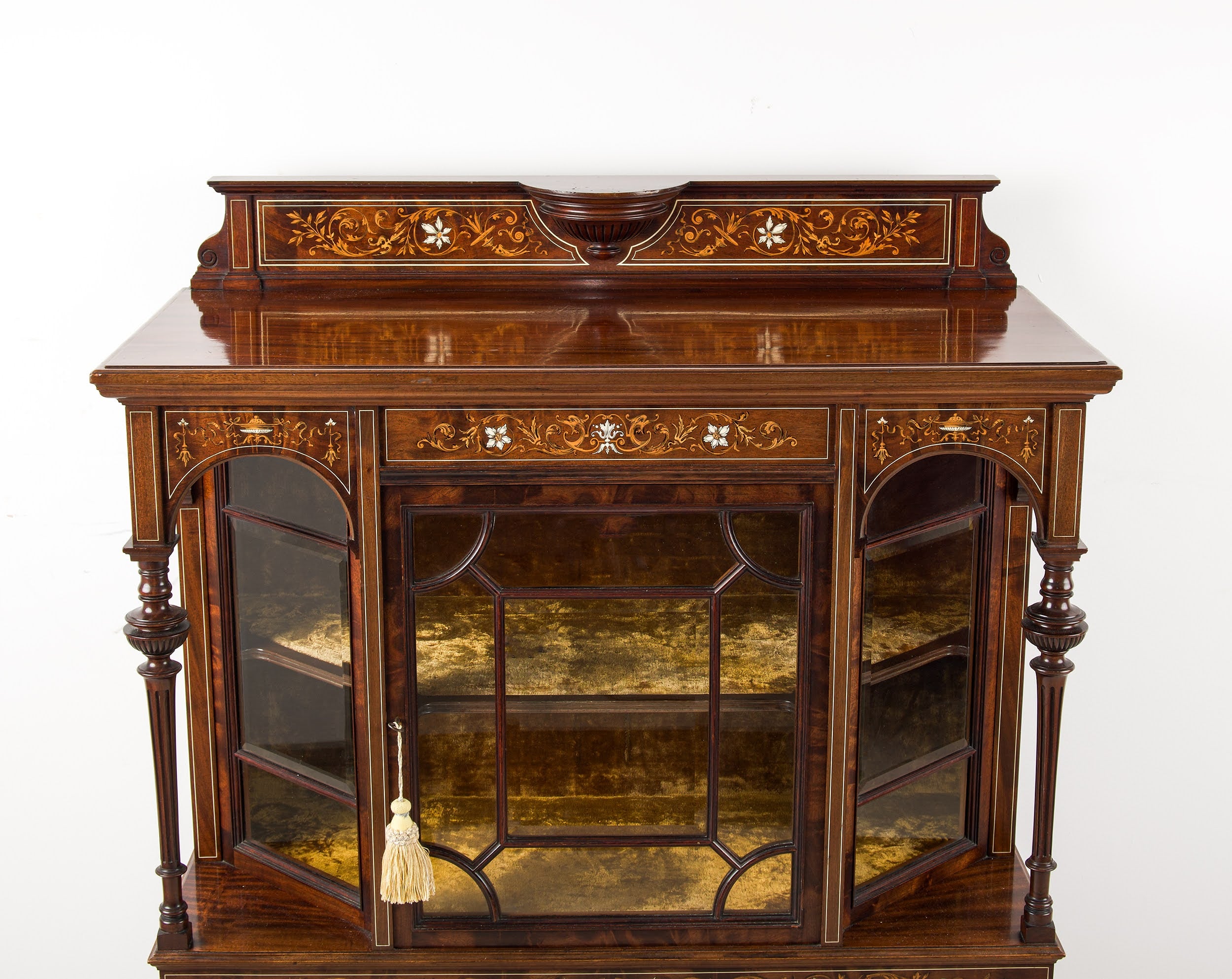 The upper section features a glazed central door flanked by two glazed side compartments, each framed by elegant arched supports and turned columns. The interior is fitted with shelving and lined in a contrasting gilt-toned finish, ideal for the display of porcelain, silver, or decorative objects.