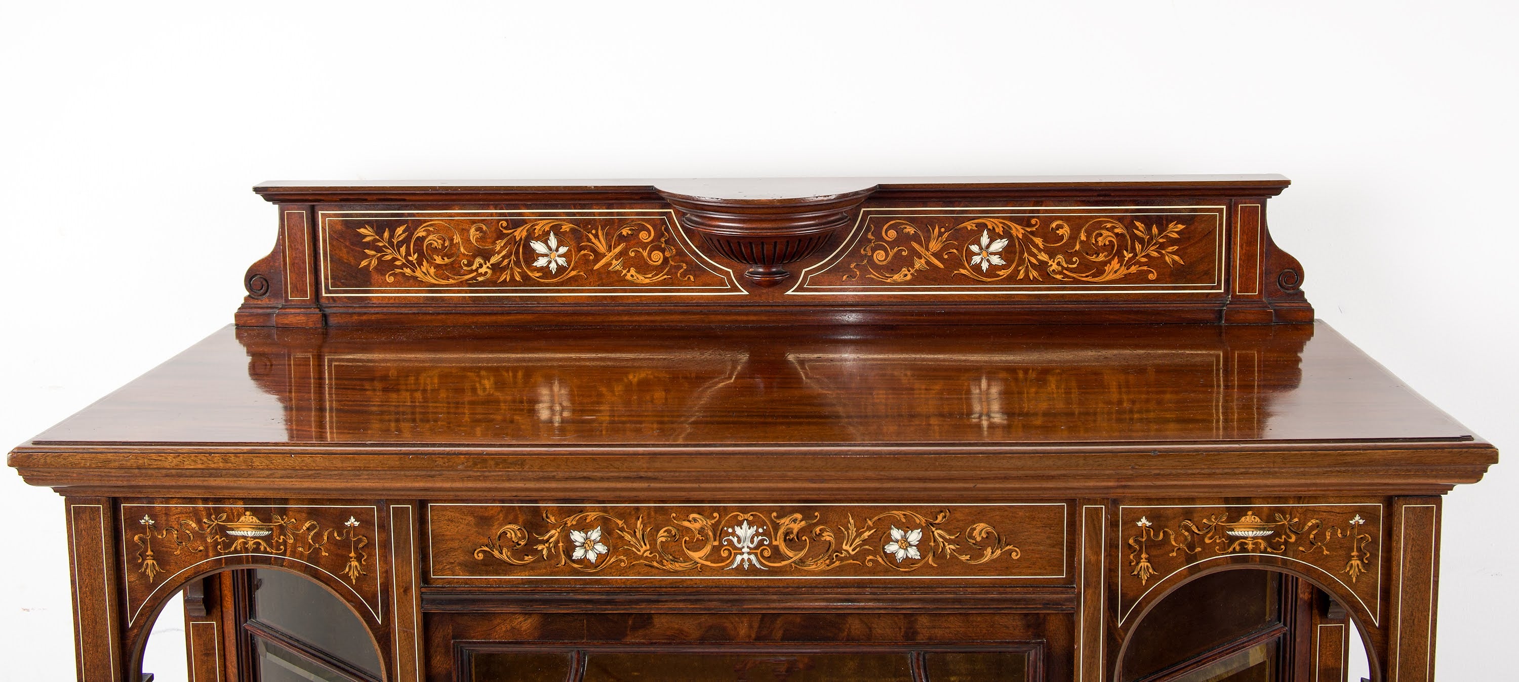 - Materials: Mahogany, marquetry inlay, glass