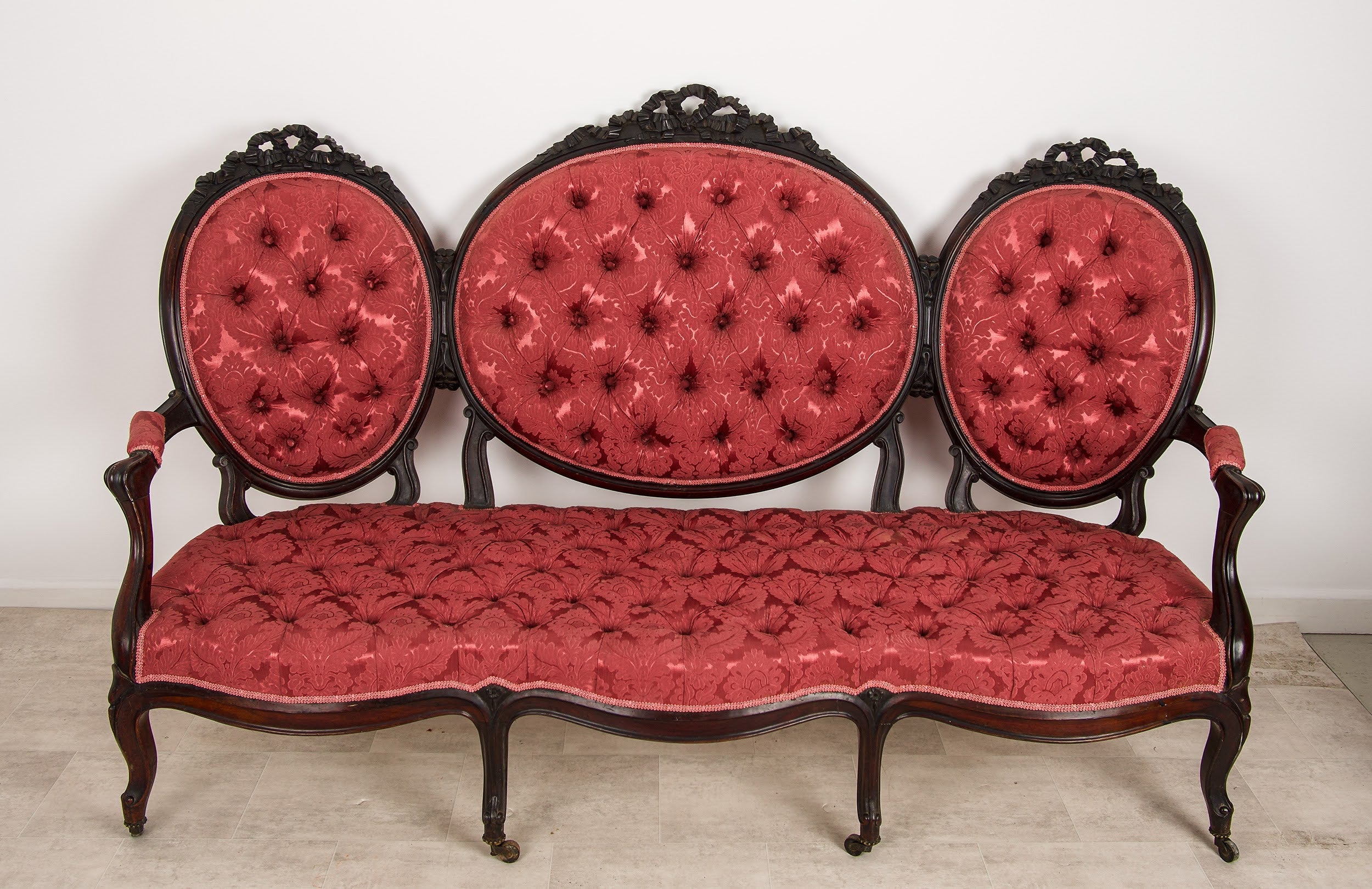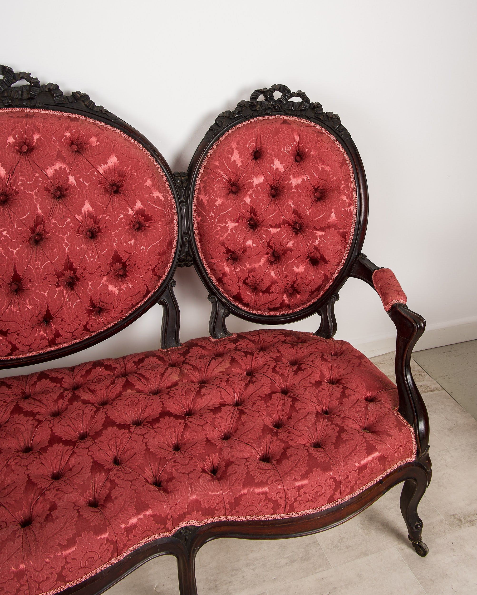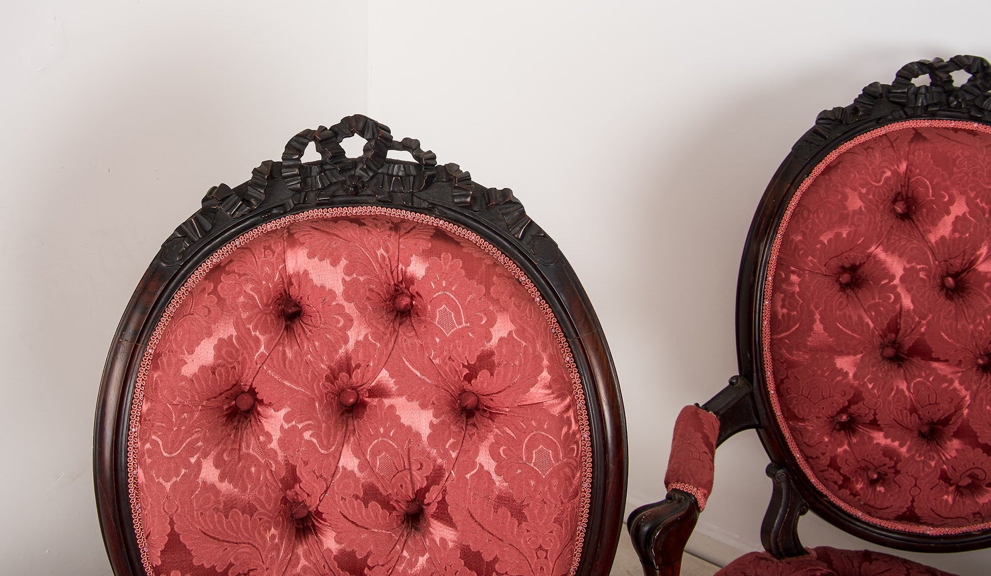 The richly patterned damask upholstery complements the warm tones of the mahogany frame and highlights the classic Victorian drawing room style for which suites of this type were highly popular during the late 19th century.